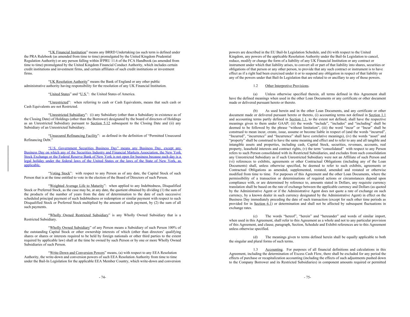 “UK Financial Institution” means any BRRD Undertaking (as such term is defined under the PRA Rulebook (as amended from time to time) promulgated by the United Kingdom Prudential Regulation Authority) or any person falling within IFPRU 11.6 of the FCA Handbook (as amended from time to time) promulgated by the United Kingdom Financial Conduct Authority, which includes certain credit institutions and investment firms, and certain affiliates of such credit institutions or investment firms. “UK Resolution Authority” means the Bank of England or any other public administrative authority having responsibility for the resolution of any UK Financial Institution. “United States” and “U.S.”: the United States of America. “Unrestricted”: when referring to cash or Cash Equivalents, means that such cash or Cash Equivalents are not Restricted. “Unrestricted Subsidiary”: (i) any Subsidiary (other than a Subsidiary in existence as of the Closing Date) of Holdings (other than the Borrower) designated by the board of directors of Holdings as an Unrestricted Subsidiary pursuant to Section 5.12 subsequent to the Closing Date and (ii) any Subsidiary of an Unrestricted Subsidiary. “Unsecured Refinancing Facility”: as defined in the definition of “Permitted Unsecured Refinancing Debt.” “U.S. Government Securities Business Day” means any Business Day, except any Business Day on which any of the Securities Industry and Financial Markets Association, the New York Stock Exchange or the Federal Reserve Bank of New York is not open for business because such day is a legal holiday under the federal laws of the United States or the laws of the State of New York, as applicable. “Voting Stock”: with respect to any Person as of any date, the Capital Stock of such Person that is at the time entitled to vote in the election of the Board of Directors of such Person. “Weighted Average Life to Maturity”: when applied to any Indebtedness, Disqualified Stock or Preferred Stock, as the case may be, at any date, the quotient obtained by dividing (1) the sum of the products of the number of years from the date of determination to the date of each successive scheduled principal payment of such Indebtedness or redemption or similar payment with respect to such Disqualified Stock or Preferred Stock multiplied by the amount of such payment, by (2) the sum of all such payments. “Wholly Owned Restricted Subsidiary” is any Wholly Owned Subsidiary that is a Restricted Subsidiary. “Wholly Owned Subsidiary” of any Person means a Subsidiary of such Person 100% of the outstanding Capital Stock or other ownership interests of which (other than directors’ qualifying shares or shares or interests required to be held by foreign nationals or other third parties to the extent required by applicable law) shall at the time be owned by such Person or by one or more Wholly Owned Subsidiaries of such Person. “Write-Down and Conversion Powers” means, (a) with respect to any EEA Resolution Authority, the write-down and conversion powers of such EEA Resolution Authority from time to time under the Bail-In Legislation for the applicable EEA Member Country, which write-down and conversion - 74- powers are described in the EU Bail-In Legislation Schedule, and (b) with respect to the United Kingdom, any powers of the applicable Resolution Authority under the Bail-In Legislation to cancel, reduce, modify or change the form of a liability of any UK Financial Institution or any contract or instrument under which that liability arises, to convert all or part of that liability into shares, securities or obligations of that person or any other person, to provide that any such contract or instrument is to have effect as if a right had been exercised under it or to suspend any obligation in respect of that liability or any of the powers under that Bail-In Legislation that are related to or ancillary to any of those powers. Other Interpretive Provisions.1.2 Unless otherwise specified therein, all terms defined in this Agreement shall(a) have the defined meanings when used in the other Loan Documents or any certificate or other document made or delivered pursuant hereto or thereto. As used herein and in the other Loan Documents, and any certificate or other(b) document made or delivered pursuant hereto or thereto, (i) accounting terms not defined in Section 1.1 and accounting terms partly defined in Section 1.1, to the extent not defined, shall have the respective meanings given to them under GAAP; (ii) the words “include”, “includes” and “including” shall be deemed to be followed by the phrase “without limitation”, (iii) the word “incur” or “Incur” shall be construed to mean incur, create, issue, assume or become liable in respect of (and the words “incurred”, “Incurred”, “incurrence” and “Incurrence” shall have correlative meanings), (iv) the words “asset” and “property” shall be construed to have the same meaning and effect and to refer to any and all tangible and intangible assets and properties, including cash, Capital Stock, securities, revenues, accounts, real property, leasehold interests and contract rights, (v) the term “consolidated” with respect to any Person refers to such Person consolidated with its Restricted Subsidiaries, and excludes from such consolidation any Unrestricted Subsidiary as if such Unrestricted Subsidiary were not an Affiliate of such Person and (vi) references to exhibits, agreements or other Contractual Obligations (including any of the Loan Documents) shall, unless otherwise specified, be deemed to refer to such exhibits, agreements or Contractual Obligations as amended, supplemented, restated, amended and restated or otherwise modified from time to time. For purposes of this Agreement and the other Loan Documents, where the permissibility of a transaction or determinations of required actions or circumstances depend upon compli