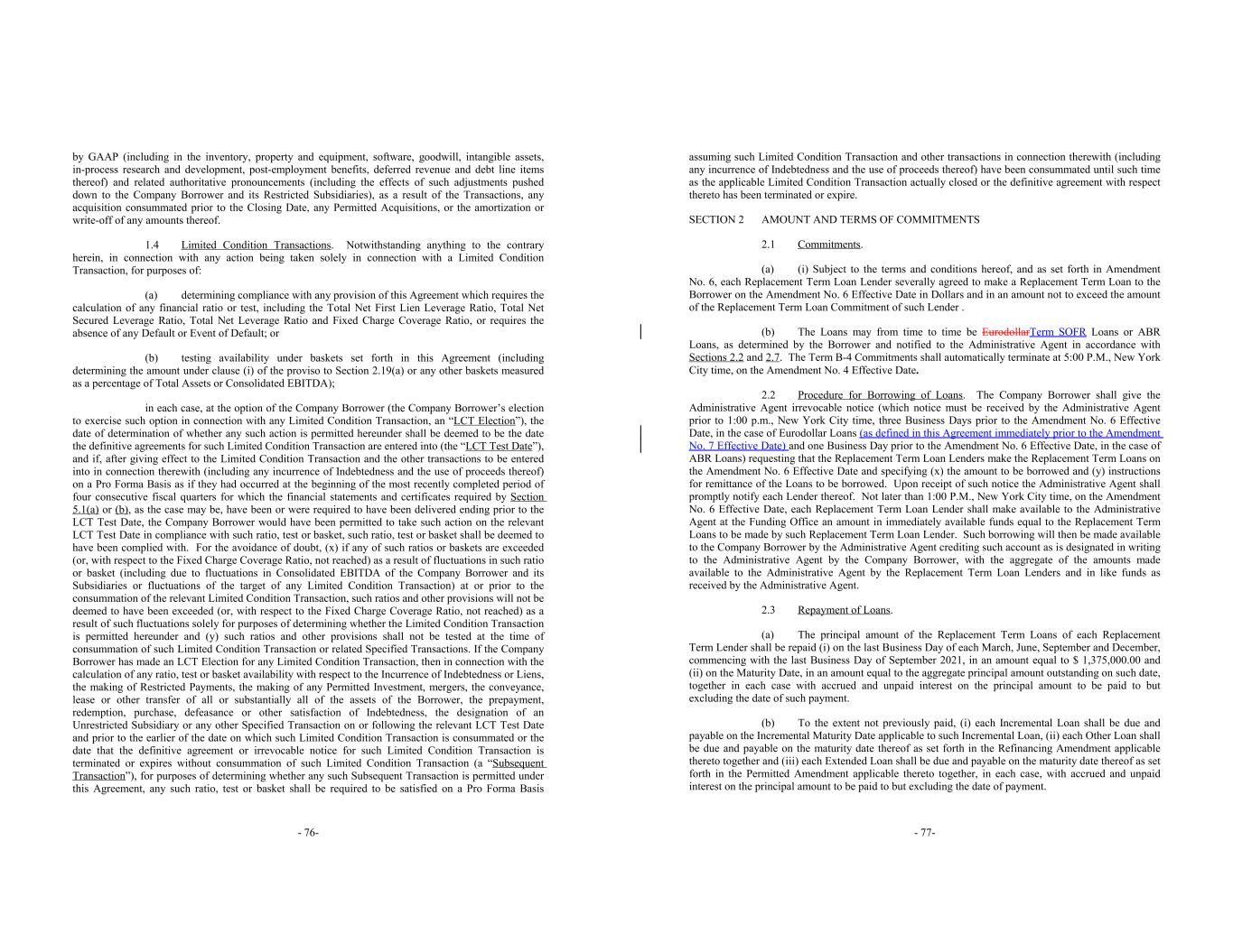 by GAAP (including in the inventory, property and equipment, software, goodwill, intangible assets, in-process research and development, post-employment benefits, deferred revenue and debt line items thereof) and related authoritative pronouncements (including the effects of such adjustments pushed down to the Company Borrower and its Restricted Subsidiaries), as a result of the Transactions, any acquisition consummated prior to the Closing Date, any Permitted Acquisitions, or the amortization or write-off of any amounts thereof. Limited Condition Transactions. Notwithstanding anything to the contrary1.4 herein, in connection with any action being taken solely in connection with a Limited Condition Transaction, for purposes of: determining compliance with any provision of this Agreement which requires the(a) calculation of any financial ratio or test, including the Total Net First Lien Leverage Ratio, Total Net Secured Leverage Ratio, Total Net Leverage Ratio and Fixed Charge Coverage Ratio, or requires the absence of any Default or Event of Default; or testing availability under baskets set forth in this Agreement (including(b) determining the amount under clause (i) of the proviso to Section 2.19(a) or any other baskets measured as a percentage of Total Assets or Consolidated EBITDA); in each case, at the option of the Company Borrower (the Company Borrower’s election to exercise such option in connection with any Limited Condition Transaction, an “LCT Election”), the date of determination of whether any such action is permitted hereunder shall be deemed to be the date the definitive agreements for such Limited Condition Transaction are entered into (the “LCT Test Date”), and if, after giving effect to the Limited Condition Transaction and the other transactions to be entered into in connection therewith (including any incurrence of Indebtedness and the use of proceeds thereof) on a Pro Forma Basis as if they had occurred at the beginning of the most recently completed period of four consecutive fiscal quarters for which the financial statements and certificates required by Section 5.1(a) or (b), as the case may be, have been or were required to have been delivered ending prior to the LCT Test Date, the Company Borrower would have been permitted to take such action on the relevant LCT Test Date in compliance with such ratio, test or basket, such ratio, test or basket shall be deemed to have been complied with. For the avoidance of doubt, (x) if any of such ratios or baskets are exceeded (or, with respect to the Fixed Charge Coverage Ratio, not reached) as a result of fluctuations in such ratio or basket (including due to fluctuations in Consolidated EBITDA of the Company Borrower and its Subsidiaries or fluctuations of the target of any Limited Condition Transaction) at or prior to the consummation of the relevant Limited Condition Transaction, such ratios and other provisions will not be deemed to have been exceeded (or, with respect to the Fixed Charge Coverage Ratio, not reached) as a result of such fluctuations solely for purposes of determining whether the Limited Condition Transaction is permitted hereunder and (y) such ratios and other provisions shall not be tested at the time of consummation of such Limited Condition Transaction or related Specified Transactions. If the Company Borrower has made an LCT Election for any Limited Condition Transaction, then in connection with the calculation of any ratio, test or basket availability with respect to the Incurrence of Indebtedness or Liens, the making of Restricted Payments, the making of any Permitted Investment, mergers, the conveyance, lease or other transfer of all or substantially all of the assets of the Borrower, the prepayment, redemption, purchase, defeasance or other satisfaction of Indebtedness, the designation of an Unrestricted Subsidiary or any other Specified Transaction on or following the relevant LCT Test Date and prior to the earlier of the date on which such Limited Condition Transaction is consummated or the date that the definitive agreement or irrevocable notice for such Limited Condition Transaction is terminated or expires without consummation of such Limited Condition Transaction (a “Subsequent Transaction”), for purposes of determining whether any such Subsequent Transaction is permitted under this Agreement, any such ratio, test or basket shall be required to be satisfied on a Pro Forma Basis - 76- assuming such Limited Condition Transaction and other transactions in connection therewith (including any incurrence of Indebtedness and the use of proceeds thereof) have been consummated until such time as the applicable Limited Condition Transaction actually closed or the definitive agreement with respect thereto has been terminated or expire. AMOUNT AND TERMS OF COMMITMENTSSECTION 2 Commitments.2.1 (i) Subject to the terms and conditions hereof, and as set forth in Amendment(a) No. 6, each Replacement Term Loan Lender severally agreed to make a Replacement Term Loan to the Borrower on the Amendment No. 6 Effective Date in Dollars and in an amount not to exceed the amount of the Replacement Term Loan Commitment of such Lender . The Loans may from time to time be EurodollarTerm SOFR Loans or ABR(b) Loans, as determined by the Borrower and notified to the Administrative Agent in accordance with Sections 2.2 and 2.7. The Term B-4 Commitments shall automatically terminate at 5:00 P.M., New York City time, on the Amendment No. 4 Effective Date. Procedure for Borrowing of Loans. The Company Borrower shall give the2.2 Administrative Agent irrevocable notice (which notice must be received by the Administrative Agent prior to 1:00 p.m., New York City time, three Business Days prior to the Amendment No. 6 Effective Date, in the case of Eurodollar Loans (as defined in this Agreement immediately prior to the Amendment No. 7 Effective Date) and one Business Day prior to the Amendment No. 6 Effective Date, i