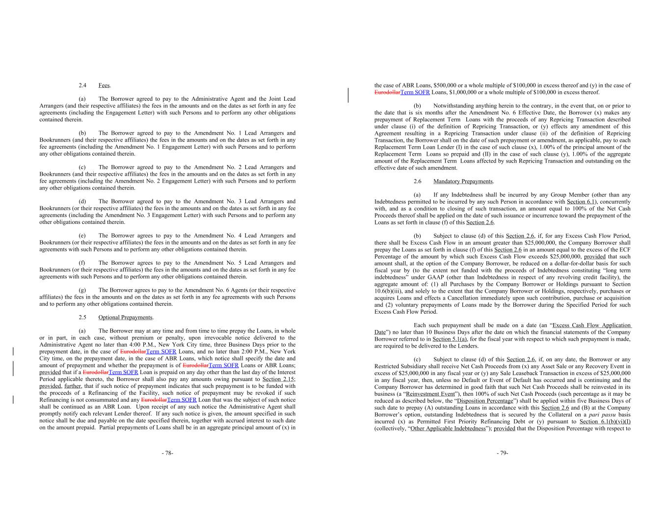 Fees.2.4 The Borrower agreed to pay to the Administrative Agent and the Joint Lead(a) Arrangers (and their respective affiliates) the fees in the amounts and on the dates as set forth in any fee agreements (including the Engagement Letter) with such Persons and to perform any other obligations contained therein. The Borrower agreed to pay to the Amendment No. 1 Lead Arrangers and(b) Bookrunners (and their respective affiliates) the fees in the amounts and on the dates as set forth in any fee agreements (including the Amendment No. 1 Engagement Letter) with such Persons and to perform any other obligations contained therein. The Borrower agreed to pay to the Amendment No. 2 Lead Arrangers and(c) Bookrunners (and their respective affiliates) the fees in the amounts and on the dates as set forth in any fee agreements (including the Amendment No. 2 Engagement Letter) with such Persons and to perform any other obligations contained therein. The Borrower agreed to pay to the Amendment No. 3 Lead Arrangers and(d) Bookrunners (or their respective affiliates) the fees in the amounts and on the dates as set forth in any fee agreements (including the Amendment No. 3 Engagement Letter) with such Persons and to perform any other obligations contained therein. The Borrower agrees to pay to the Amendment No. 4 Lead Arrangers and(e) Bookrunners (or their respective affiliates) the fees in the amounts and on the dates as set forth in any fee agreements with such Persons and to perform any other obligations contained therein. The Borrower agrees to pay to the Amendment No. 5 Lead Arrangers and(f) Bookrunners (or their respective affiliates) the fees in the amounts and on the dates as set forth in any fee agreements with such Persons and to perform any other obligations contained therein. The Borrower agrees to pay to the Amendment No. 6 Agents (or their respective(g) affiliates) the fees in the amounts and on the dates as set forth in any fee agreements with such Persons and to perform any other obligations contained therein. Optional Prepayments.2.5 The Borrower may at any time and from time to time prepay the Loans, in whole(a) or in part, in each case, without premium or penalty, upon irrevocable notice delivered to the Administrative Agent no later than 4:00 P.M., New York City time, three Business Days prior to the prepayment date, in the case of EurodollarTerm SOFR Loans, and no later than 2:00 P.M., New York City time, on the prepayment date, in the case of ABR Loans, which notice shall specify the date and amount of prepayment and whether the prepayment is of EurodollarTerm SOFR Loans or ABR Loans; provided that if a EurodollarTerm SOFR Loan is prepaid on any day other than the last day of the Interest Period applicable thereto, the Borrower shall also pay any amounts owing pursuant to Section 2.15; provided, further, that if such notice of prepayment indicates that such prepayment is to be funded with the proceeds of a Refinancing of the Facility, such notice of prepayment may be revoked if such Refinancing is not consummated and any EurodollarTerm SOFR Loan that was the subject of such notice shall be continued as an ABR Loan. Upon receipt of any such notice the Administrative Agent shall promptly notify each relevant Lender thereof. If any such notice is given, the amount specified in such notice shall be due and payable on the date specified therein, together with accrued interest to such date on the amount prepaid. Partial prepayments of Loans shall be in an aggregate principal amount of (x) in - 78- the case of ABR Loans, $500,000 or a whole multiple of $100,000 in excess thereof and (y) in the case of EurodollarTerm SOFR Loans, $1,000,000 or a whole multiple of $100,000 in excess thereof. Notwithstanding anything herein to the contrary, in the event that, on or prior to(b) the date that is six months after the Amendment No. 6 Effective Date, the Borrower (x) makes any prepayment of Replacement Term Loans with the proceeds of any Repricing Transaction described under clause (i) of the definition of Repricing Transaction, or (y) effects any amendment of this Agreement resulting in a Repricing Transaction under clause (ii) of the definition of Repricing Transaction, the Borrower shall on the date of such prepayment or amendment, as applicable, pay to each Replacement Term Loan Lender (I) in the case of such clause (x), 1.00% of the principal amount of the Replacement Term Loans so prepaid and (II) in the case of such clause (y), 1.00% of the aggregate amount of the Replacement Term Loans affected by such Repricing Transaction and outstanding on the effective date of such amendment. Mandatory Prepayments.2.6 If any Indebtedness shall be incurred by any Group Member (other than any(a) Indebtedness permitted to be incurred by any such Person in accordance with Section 6.1), concurrently with, and as a condition to closing of such transaction, an amount equal to 100% of the Net Cash Proceeds thereof shall be applied on the date of such issuance or incurrence toward the prepayment of the Loans as set forth in clause (f) of this Section 2.6. Subject to clause (d) of this Section 2.6, if, for any Excess Cash Flow Period,(b) there shall be Excess Cash Flow in an amount greater than $25,000,000, the Company Borrower shall prepay the Loans as set forth in clause (f) of this Section 2.6 in an amount equal to the excess of the ECF Percentage of the amount by which such Excess Cash Flow exceeds $25,000,000, provided that such amount shall, at the option of the Company Borrower, be reduced on a dollar-for-dollar basis for such fiscal year by (to the extent not funded with the proceeds of Indebtedness constituting “long term indebtedness” under GAAP (other than Indebtedness in respect of any revolving credit facility), the aggregate amount of: (1) all Purchases by the Company Borrower or Holdings pursuant to Section 10.6(b)(iii), and solely to the extent that the Company Borrower or Holdings, respectivel