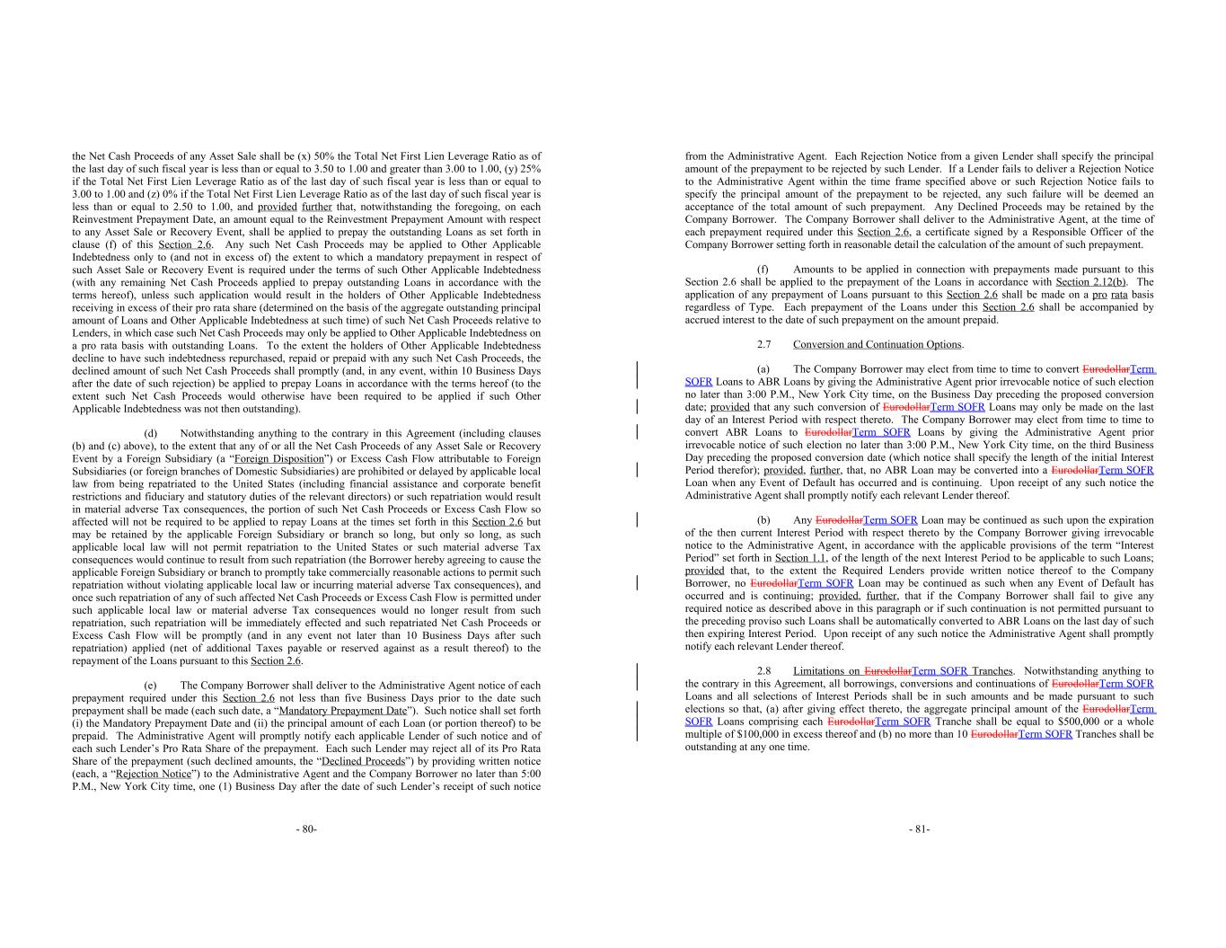 the Net Cash Proceeds of any Asset Sale shall be (x) 50% the Total Net First Lien Leverage Ratio as of the last day of such fiscal year is less than or equal to 3.50 to 1.00 and greater than 3.00 to 1.00, (y) 25% if the Total Net First Lien Leverage Ratio as of the last day of such fiscal year is less than or equal to 3.00 to 1.00 and (z) 0% if the Total Net First Lien Leverage Ratio as of the last day of such fiscal year is less than or equal to 2.50 to 1.00, and provided further that, notwithstanding the foregoing, on each Reinvestment Prepayment Date, an amount equal to the Reinvestment Prepayment Amount with respect to any Asset Sale or Recovery Event, shall be applied to prepay the outstanding Loans as set forth in clause (f) of this Section 2.6. Any such Net Cash Proceeds may be applied to Other Applicable Indebtedness only to (and not in excess of) the extent to which a mandatory prepayment in respect of such Asset Sale or Recovery Event is required under the terms of such Other Applicable Indebtedness (with any remaining Net Cash Proceeds applied to prepay outstanding Loans in accordance with the terms hereof), unless such application would result in the holders of Other Applicable Indebtedness receiving in excess of their pro rata share (determined on the basis of the aggregate outstanding principal amount of Loans and Other Applicable Indebtedness at such time) of such Net Cash Proceeds relative to Lenders, in which case such Net Cash Proceeds may only be applied to Other Applicable Indebtedness on a pro rata basis with outstanding Loans. To the extent the holders of Other Applicable Indebtedness decline to have such indebtedness repurchased, repaid or prepaid with any such Net Cash Proceeds, the declined amount of such Net Cash Proceeds shall promptly (and, in any event, within 10 Business Days after the date of such rejection) be applied to prepay Loans in accordance with the terms hereof (to the extent such Net Cash Proceeds would otherwise have been required to be applied if such Other Applicable Indebtedness was not then outstanding). Notwithstanding anything to the contrary in this Agreement (including clauses(d) (b) and (c) above), to the extent that any of or all the Net Cash Proceeds of any Asset Sale or Recovery Event by a Foreign Subsidiary (a “Foreign Disposition”) or Excess Cash Flow attributable to Foreign Subsidiaries (or foreign branches of Domestic Subsidiaries) are prohibited or delayed by applicable local law from being repatriated to the United States (including financial assistance and corporate benefit restrictions and fiduciary and statutory duties of the relevant directors) or such repatriation would result in material adverse Tax consequences, the portion of such Net Cash Proceeds or Excess Cash Flow so affected will not be required to be applied to repay Loans at the times set forth in this Section 2.6 but may be retained by the applicable Foreign Subsidiary or branch so long, but only so long, as such applicable local law will not permit repatriation to the United States or such material adverse Tax consequences would continue to result from such repatriation (the Borrower hereby agreeing to cause the applicable Foreign Subsidiary or branch to promptly take commercially reasonable actions to permit such repatriation without violating applicable local law or incurring material adverse Tax consequences), and once such repatriation of any of such affected Net Cash Proceeds or Excess Cash Flow is permitted under such applicable local law or material adverse Tax consequences would no longer result from such repatriation, such repatriation will be immediately effected and such repatriated Net Cash Proceeds or Excess Cash Flow will be promptly (and in any event not later than 10 Business Days after such repatriation) applied (net of additional Taxes payable or reserved against as a result thereof) to the repayment of the Loans pursuant to this Section 2.6. The Company Borrower shall deliver to the Administrative Agent notice of each(e) prepayment required under this Section 2.6 not less than five Business Days prior to the date such prepayment shall be made (each such date, a “Mandatory Prepayment Date”). Such notice shall set forth (i) the Mandatory Prepayment Date and (ii) the principal amount of each Loan (or portion thereof) to be prepaid. The Administrative Agent will promptly notify each applicable Lender of such notice and of each such Lender’s Pro Rata Share of the prepayment. Each such Lender may reject all of its Pro Rata Share of the prepayment (such declined amounts, the “Declined Proceeds”) by providing written notice (each, a “Rejection Notice”) to the Administrative Agent and the Company Borrower no later than 5:00 P.M., New York City time, one (1) Business Day after the date of such Lender’s receipt of such notice - 80- from the Administrative Agent. Each Rejection Notice from a given Lender shall specify the principal amount of the prepayment to be rejected by such Lender. If a Lender fails to deliver a Rejection Notice to the Administrative Agent within the time frame specified above or such Rejection Notice fails to specify the principal amount of the prepayment to be rejected, any such failure will be deemed an acceptance of the total amount of such prepayment. Any Declined Proceeds may be retained by the Company Borrower. The Company Borrower shall deliver to the Administrative Agent, at the time of each prepayment required under this Section 2.6, a certificate signed by a Responsible Officer of the Company Borrower setting forth in reasonable detail the calculation of the amount of such prepayment. Amounts to be applied in connection with prepayments made pursuant to this(f) Section 2.6 shall be applied to the prepayment of the Loans in accordance with Section 2.12(b). The application of any prepayment of Loans pursuant to this Section 2.6 shall be made on a pro rata basis regardless of Type. Each prepayment of the L