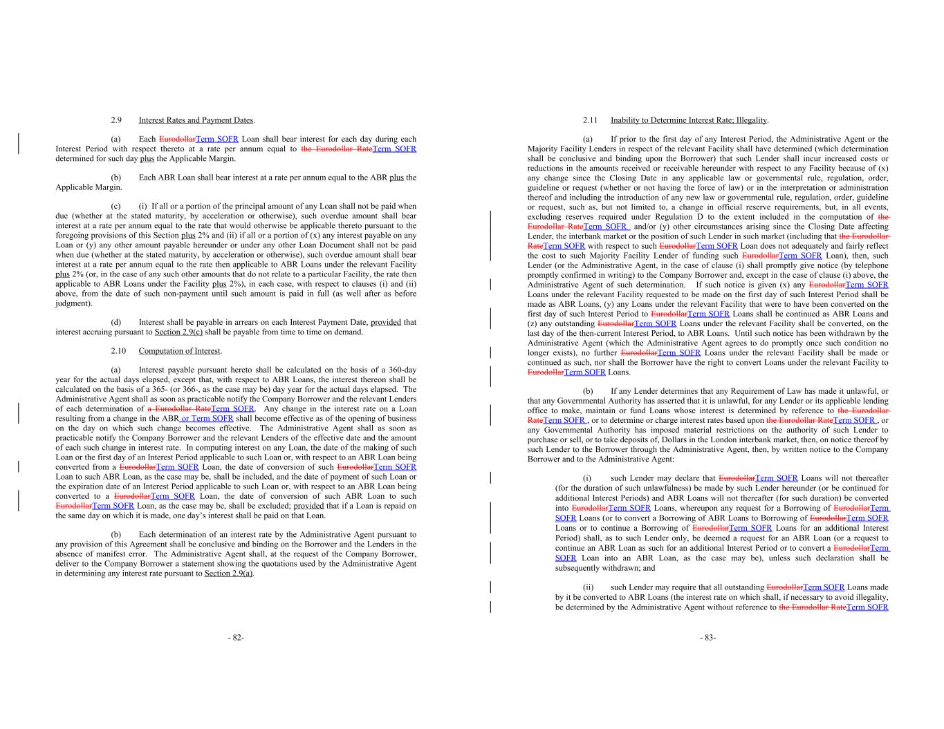 Interest Rates and Payment Dates.2.9 Each EurodollarTerm SOFR Loan shall bear interest for each day during each(a) Interest Period with respect thereto at a rate per annum equal to the Eurodollar RateTerm SOFR determined for such day plus the Applicable Margin. Each ABR Loan shall bear interest at a rate per annum equal to the ABR plus the(b) Applicable Margin. (i) If all or a portion of the principal amount of any Loan shall not be paid when(c) due (whether at the stated maturity, by acceleration or otherwise), such overdue amount shall bear interest at a rate per annum equal to the rate that would otherwise be applicable thereto pursuant to the foregoing provisions of this Section plus 2% and (ii) if all or a portion of (x) any interest payable on any Loan or (y) any other amount payable hereunder or under any other Loan Document shall not be paid when due (whether at the stated maturity, by acceleration or otherwise), such overdue amount shall bear interest at a rate per annum equal to the rate then applicable to ABR Loans under the relevant Facility plus 2% (or, in the case of any such other amounts that do not relate to a particular Facility, the rate then applicable to ABR Loans under the Facility plus 2%), in each case, with respect to clauses (i) and (ii) above, from the date of such non-payment until such amount is paid in full (as well after as before judgment). Interest shall be payable in arrears on each Interest Payment Date, provided that(d) interest accruing pursuant to Section 2.9(c) shall be payable from time to time on demand. Computation of Interest.2.10 Interest payable pursuant hereto shall be calculated on the basis of a 360-day(a) year for the actual days elapsed, except that, with respect to ABR Loans, the interest thereon shall be calculated on the basis of a 365- (or 366-, as the case may be) day year for the actual days elapsed. The Administrative Agent shall as soon as practicable notify the Company Borrower and the relevant Lenders of each determination of a Eurodollar RateTerm SOFR. Any change in the interest rate on a Loan resulting from a change in the ABR or Term SOFR shall become effective as of the opening of business on the day on which such change becomes effective. The Administrative Agent shall as soon as practicable notify the Company Borrower and the relevant Lenders of the effective date and the amount of each such change in interest rate. In computing interest on any Loan, the date of the making of such Loan or the first day of an Interest Period applicable to such Loan or, with respect to an ABR Loan being converted from a EurodollarTerm SOFR Loan, the date of conversion of such EurodollarTerm SOFR Loan to such ABR Loan, as the case may be, shall be included, and the date of payment of such Loan or the expiration date of an Interest Period applicable to such Loan or, with respect to an ABR Loan being converted to a EurodollarTerm SOFR Loan, the date of conversion of such ABR Loan to such EurodollarTerm SOFR Loan, as the case may be, shall be excluded; provided that if a Loan is repaid on the same day on which it is made, one day’s interest shall be paid on that Loan. Each determination of an interest rate by the Administrative Agent pursuant to(b) any provision of this Agreement shall be conclusive and binding on the Borrower and the Lenders in the absence of manifest error. The Administrative Agent shall, at the request of the Company Borrower, deliver to the Company Borrower a statement showing the quotations used by the Administrative Agent in determining any interest rate pursuant to Section 2.9(a). - 82- Inability to Determine Interest Rate; Illegality.2.11 If prior to the first day of any Interest Period, the Administrative Agent or the(a) Majority Facility Lenders in respect of the relevant Facility shall have determined (which determination shall be conclusive and binding upon the Borrower) that such Lender shall incur increased costs or reductions in the amounts received or receivable hereunder with respect to any Facility because of (x) any change since the Closing Date in any applicable law or governmental rule, regulation, order, guideline or request (whether or not having the force of law) or in the interpretation or administration thereof and including the introduction of any new law or governmental rule, regulation, order, guideline or request, such as, but not limited to, a change in official reserve requirements, but, in all events, excluding reserves required under Regulation D to the extent included in the computation of the Eurodollar RateTerm SOFR and/or (y) other circumstances arising since the Closing Date affecting Lender, the interbank market or the position of such Lender in such market (including that the Eurodollar RateTerm SOFR with respect to such EurodollarTerm SOFR Loan does not adequately and fairly reflect the cost to such Majority Facility Lender of funding such EurodollarTerm SOFR Loan), then, such Lender (or the Administrative Agent, in the case of clause (i) shall promptly give notice (by telephone promptly confirmed in writing) to the Company Borrower and, except in the case of clause (i) above, the Administrative Agent of such determination. If such notice is given (x) any EurodollarTerm SOFR Loans under the relevant Facility requested to be made on the first day of such Interest Period shall be made as ABR Loans, (y) any Loans under the relevant Facility that were to have been converted on the first day of such Interest Period to EurodollarTerm SOFR Loans shall be continued as ABR Loans and (z) any outstanding EurodollarTerm SOFR Loans under the relevant Facility shall be converted, on the last day of the then-current Interest Period, to ABR Loans. Until such notice has been withdrawn by the Administrative Agent (which the Administrative Agent agrees to do promptly once such condition no longer exists), no further EurodollarTerm SOFR Loans under the relevant Facility shall be made or continued as such,
