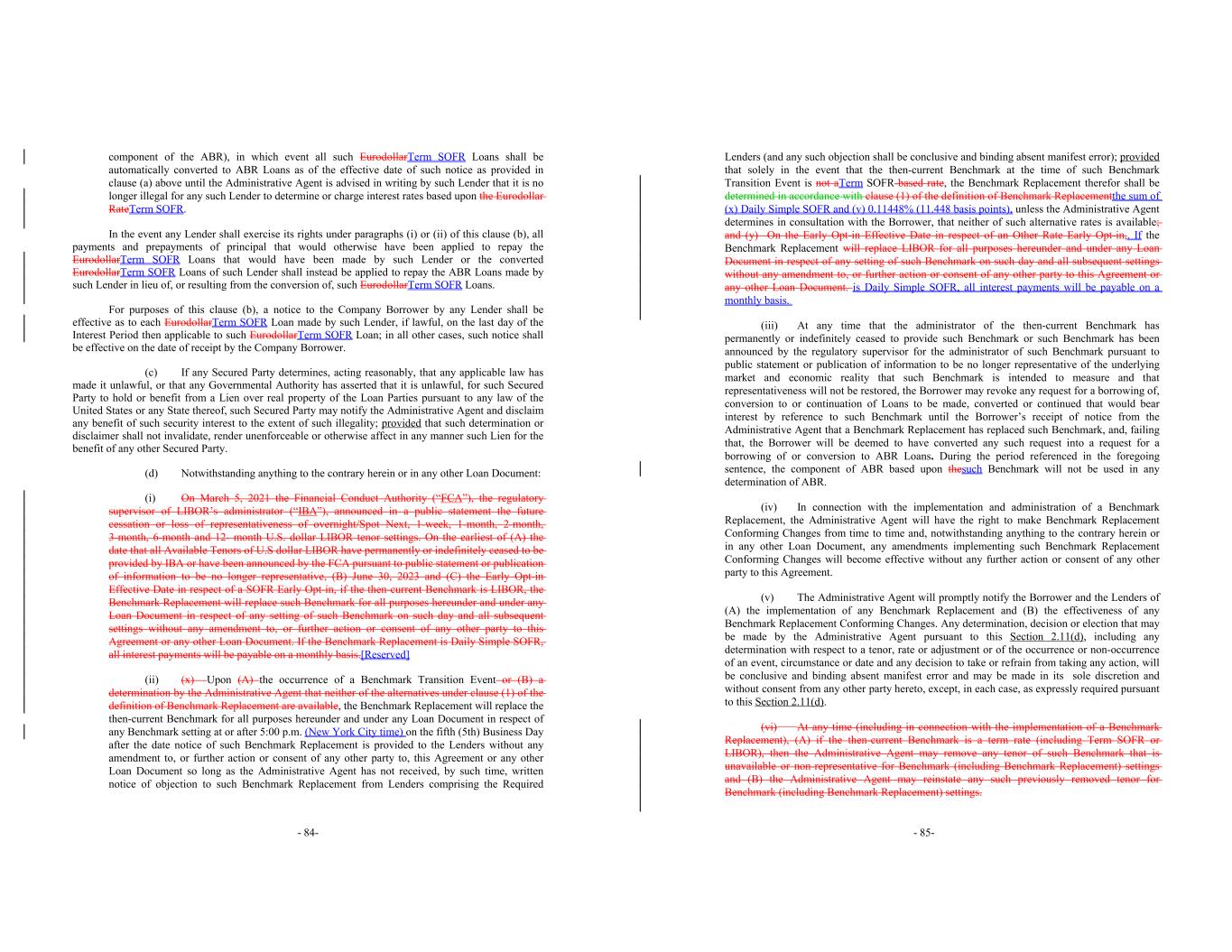 component of the ABR), in which event all such EurodollarTerm SOFR Loans shall be automatically converted to ABR Loans as of the effective date of such notice as provided in clause (a) above until the Administrative Agent is advised in writing by such Lender that it is no longer illegal for any such Lender to determine or charge interest rates based upon the Eurodollar RateTerm SOFR. In the event any Lender shall exercise its rights under paragraphs (i) or (ii) of this clause (b), all payments and prepayments of principal that would otherwise have been applied to repay the EurodollarTerm SOFR Loans that would have been made by such Lender or the converted EurodollarTerm SOFR Loans of such Lender shall instead be applied to repay the ABR Loans made by such Lender in lieu of, or resulting from the conversion of, such EurodollarTerm SOFR Loans. For purposes of this clause (b), a notice to the Company Borrower by any Lender shall be effective as to each EurodollarTerm SOFR Loan made by such Lender, if lawful, on the last day of the Interest Period then applicable to such EurodollarTerm SOFR Loan; in all other cases, such notice shall be effective on the date of receipt by the Company Borrower. If any Secured Party determines, acting reasonably, that any applicable law has(c) made it unlawful, or that any Governmental Authority has asserted that it is unlawful, for such Secured Party to hold or benefit from a Lien over real property of the Loan Parties pursuant to any law of the United States or any State thereof, such Secured Party may notify the Administrative Agent and disclaim any benefit of such security interest to the extent of such illegality; provided that such determination or disclaimer shall not invalidate, render unenforceable or otherwise affect in any manner such Lien for the benefit of any other Secured Party. Notwithstanding anything to the contrary herein or in any other Loan Document:(d) On March 5, 2021 the Financial Conduct Authority (“FCA”), the regulatory(i) supervisor of LIBOR’s administrator (“IBA”), announced in a public statement the future cessation or loss of representativeness of overnight/Spot Next, 1-week, 1-month, 2-month, 3-month, 6-month and 12- month U.S. dollar LIBOR tenor settings. On the earliest of (A) the date that all Available Tenors of U.S dollar LIBOR have permanently or indefinitely ceased to be provided by IBA or have been announced by the FCA pursuant to public statement or publication of information to be no longer representative, (B) June 30, 2023 and (C) the Early Opt-in Effective Date in respect of a SOFR Early Opt-in, if the then-current Benchmark is LIBOR, the Benchmark Replacement will replace such Benchmark for all purposes hereunder and under any Loan Document in respect of any setting of such Benchmark on such day and all subsequent settings without any amendment to, or further action or consent of any other party to this Agreement or any other Loan Document. If the Benchmark Replacement is Daily Simple SOFR, all interest payments will be payable on a monthly basis.[Reserved] (x) Upon (A) the occurrence of a Benchmark Transition Event or (B) a(ii) determination by the Administrative Agent that neither of the alternatives under clause (1) of the definition of Benchmark Replacement are available, the Benchmark Replacement will replace the then-current Benchmark for all purposes hereunder and under any Loan Document in respect of any Benchmark setting at or after 5:00 p.m. (New York City time) on the fifth (5th) Business Day after the date notice of such Benchmark Replacement is provided to the Lenders without any amendment to, or further action or consent of any other party to, this Agreement or any other Loan Document so long as the Administrative Agent has not received, by such time, written notice of objection to such Benchmark Replacement from Lenders comprising the Required - 84- Lenders (and any such objection shall be conclusive and binding absent manifest error); provided that solely in the event that the then-current Benchmark at the time of such Benchmark Transition Event is not aTerm SOFR-based rate, the Benchmark Replacement therefor shall be determined in accordance with clause (1) of the definition of Benchmark Replacementthe sum of (x) Daily Simple SOFR and (v) 0.11448% (11.448 basis points), unless the Administrative Agent determines in consultation with the Borrower, that neither of such alternative rates is available; and (y) On the Early Opt-in Effective Date in respect of an Other Rate Early Opt-in,. If the Benchmark Replacement will replace LIBOR for all purposes hereunder and under any Loan Document in respect of any setting of such Benchmark on such day and all subsequent settings without any amendment to, or further action or consent of any other party to this Agreement or any other Loan Document. is Daily Simple SOFR, all interest payments will be payable on a monthly basis. At any time that the administrator of the then-current Benchmark has(iii) permanently or indefinitely ceased to provide such Benchmark or such Benchmark has been announced by the regulatory supervisor for the administrator of such Benchmark pursuant to public statement or publication of information to be no longer representative of the underlying market and economic reality that such Benchmark is intended to measure and that representativeness will not be restored, the Borrower may revoke any request for a borrowing of, conversion to or continuation of Loans to be made, converted or continued that would bear interest by reference to such Benchmark until the Borrower’s receipt of notice from the Administrative Agent that a Benchmark Replacement has replaced such Benchmark, and, failing that, the Borrower will be deemed to have converted any such request into a request for a borrowing of or conversion to ABR Loans. During the period referenced in the foregoing sentence, the component of ABR based upon thesuch Benchmark will not be u