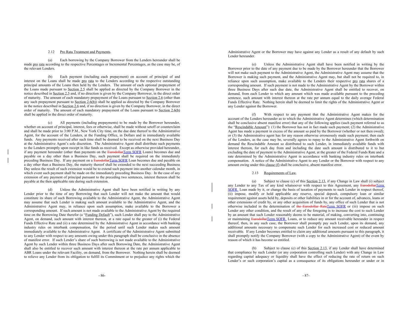 Pro Rata Treatment and Payments.2.12 Each borrowing by the Company Borrower from the Lenders hereunder shall be(a) made pro rata according to the respective Percentages or Incremental Percentages, as the case may be, of the relevant Lenders. Each payment (including each prepayment) on account of principal of and(b) interest on the Loans shall be made pro rata to the Lenders according to the respective outstanding principal amounts of the Loans then held by the Lenders. The amount of each optional prepayment of the Loans made pursuant to Section 2.5 shall be applied as directed by the Company Borrower in the notice described in Section 2.5 and, if no direction is given by the Company Borrower, in the direct order of maturity. The amount of each mandatory prepayment of the Loans pursuant to Section 2.6 (other than any such prepayment pursuant to Section 2.6(b)) shall be applied as directed by the Company Borrower in the notice described in Section 2.6 and, if no direction is given by the Company Borrower, in the direct order of maturity. The amount of each mandatory prepayment of the Loans pursuant to Section 2.6(b) shall be applied in the direct order of maturity. All payments (including prepayments) to be made by the Borrower hereunder,(c) whether on account of principal, interest, fees or otherwise, shall be made without setoff or counterclaim and shall be made prior to 3:00 P.M., New York City time, on the due date thereof to the Administrative Agent, for the account of the Lenders, at the Funding Office, in Dollars and in immediately available funds. Any payments received after such time shall be deemed to be received on the next Business Day at the Administrative Agent’s sole discretion. The Administrative Agent shall distribute such payments to the Lenders promptly upon receipt in like funds as received. Except as otherwise provided hereunder, if any payment hereunder (other than payments on the EurodollarTerm SOFR Loans) becomes due and payable on a day other than a Business Day, such payment shall be required on the immediately preceding Business Day. If any payment on a EurodollarTerm SOFR Loan becomes due and payable on a day other than a Business Day, the maturity thereof shall be extended to the next succeeding Business Day unless the result of such extension would be to extend such payment into another calendar month, in which event such payment shall be made on the immediately preceding Business Day. In the case of any extension of any payment of principal pursuant to the preceding two sentences, interest thereon shall be payable at the then applicable rate during such extension. Unless the Administrative Agent shall have been notified in writing by any(d) Lender prior to the time of any Borrowing that such Lender will not make the amount that would constitute its share of such Borrowing available to the Administrative Agent, the Administrative Agent may assume that such Lender is making such amount available to the Administrative Agent, and the Administrative Agent may, in reliance upon such assumption, make available to the Borrower a corresponding amount. If such amount is not made available to the Administrative Agent by the required time on the Borrowing Date therefor (a “Funding Default”), such Lender shall pay to the Administrative Agent, on demand, such amount with interest thereon, at a rate equal to the greater of (i) the Federal Funds Effective Rate and (ii) a rate determined by the Administrative Agent in accordance with banking industry rules on interbank compensation, for the period until such Lender makes such amount immediately available to the Administrative Agent. A certificate of the Administrative Agent submitted to any Lender with respect to any amounts owing under this paragraph shall be conclusive in the absence of manifest error. If such Lender’s share of such borrowing is not made available to the Administrative Agent by such Lender within three Business Days after such Borrowing Date, the Administrative Agent shall also be entitled to recover such amount with interest thereon at the rate per annum applicable to ABR Loans under the relevant Facility, on demand, from the Borrower. Nothing herein shall be deemed to relieve any Lender from its obligation to fulfill its Commitment or to prejudice any rights which the - 86- Administrative Agent or the Borrower may have against any Lender as a result of any default by such Lender hereunder. Unless the Administrative Agent shall have been notified in writing by the(e) Borrower prior to the date of any payment due to be made by the Borrower hereunder that the Borrower will not make such payment to the Administrative Agent, the Administrative Agent may assume that the Borrower is making such payment, and the Administrative Agent may, but shall not be required to, in reliance upon such assumption, make available to the Lenders their respective pro rata shares of a corresponding amount. If such payment is not made to the Administrative Agent by the Borrower within three Business Days after such due date, the Administrative Agent shall be entitled to recover, on demand, from each Lender to which any amount which was made available pursuant to the preceding sentence, such amount with interest thereon at the rate per annum equal to the daily average Federal Funds Effective Rate. Nothing herein shall be deemed to limit the rights of the Administrative Agent or any Lender against the Borrower. With respect to any payment that the Administrative Agent makes for the(f) account of the Lenders hereunder as to which the Administrative Agent determines (which determination shall be conclusive absent manifest error) that any of the following applies (such payment referred to as the “Rescindable Amount”): (1) the Borrower has not in fact made such payment; (2) the Administrative Agent has made a payment in excess of the amount so paid by the Borrower (whether or not then owed); or (3) the Administrative agent ha