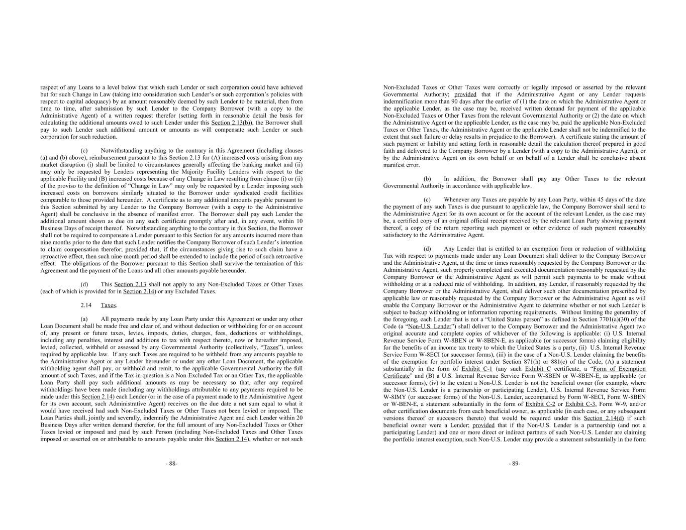 respect of any Loans to a level below that which such Lender or such corporation could have achieved but for such Change in Law (taking into consideration such Lender’s or such corporation’s policies with respect to capital adequacy) by an amount reasonably deemed by such Lender to be material, then from time to time, after submission by such Lender to the Company Borrower (with a copy to the Administrative Agent) of a written request therefor (setting forth in reasonable detail the basis for calculating the additional amounts owed to such Lender under this Section 2.13(b)), the Borrower shall pay to such Lender such additional amount or amounts as will compensate such Lender or such corporation for such reduction. Notwithstanding anything to the contrary in this Agreement (including clauses(c) (a) and (b) above), reimbursement pursuant to this Section 2.13 for (A) increased costs arising from any market disruption (i) shall be limited to circumstances generally affecting the banking market and (ii) may only be requested by Lenders representing the Majority Facility Lenders with respect to the applicable Facility and (B) increased costs because of any Change in Law resulting from clause (i) or (ii) of the proviso to the definition of “Change in Law” may only be requested by a Lender imposing such increased costs on borrowers similarly situated to the Borrower under syndicated credit facilities comparable to those provided hereunder. A certificate as to any additional amounts payable pursuant to this Section submitted by any Lender to the Company Borrower (with a copy to the Administrative Agent) shall be conclusive in the absence of manifest error. The Borrower shall pay such Lender the additional amount shown as due on any such certificate promptly after and, in any event, within 10 Business Days of receipt thereof. Notwithstanding anything to the contrary in this Section, the Borrower shall not be required to compensate a Lender pursuant to this Section for any amounts incurred more than nine months prior to the date that such Lender notifies the Company Borrower of such Lender’s intention to claim compensation therefor; provided that, if the circumstances giving rise to such claim have a retroactive effect, then such nine-month period shall be extended to include the period of such retroactive effect. The obligations of the Borrower pursuant to this Section shall survive the termination of this Agreement and the payment of the Loans and all other amounts payable hereunder. This Section 2.13 shall not apply to any Non-Excluded Taxes or Other Taxes(d) (each of which is provided for in Section 2.14) or any Excluded Taxes. Taxes.2.14 All payments made by any Loan Party under this Agreement or under any other(a) Loan Document shall be made free and clear of, and without deduction or withholding for or on account of, any present or future taxes, levies, imposts, duties, charges, fees, deductions or withholdings, including any penalties, interest and additions to tax with respect thereto, now or hereafter imposed, levied, collected, withheld or assessed by any Governmental Authority (collectively, “Taxes”), unless required by applicable law. If any such Taxes are required to be withheld from any amounts payable to the Administrative Agent or any Lender hereunder or under any other Loan Document, the applicable withholding agent shall pay, or withhold and remit, to the applicable Governmental Authority the full amount of such Taxes, and if the Tax in question is a Non-Excluded Tax or an Other Tax, the applicable Loan Party shall pay such additional amounts as may be necessary so that, after any required withholdings have been made (including any withholdings attributable to any payments required to be made under this Section 2.14) each Lender (or in the case of a payment made to the Administrative Agent for its own account, such Administrative Agent) receives on the due date a net sum equal to what it would have received had such Non-Excluded Taxes or Other Taxes not been levied or imposed. The Loan Parties shall, jointly and severally, indemnify the Administrative Agent and each Lender within 20 Business Days after written demand therefor, for the full amount of any Non-Excluded Taxes or Other Taxes levied or imposed and paid by such Person (including Non-Excluded Taxes and Other Taxes imposed or asserted on or attributable to amounts payable under this Section 2.14), whether or not such - 88- Non-Excluded Taxes or Other Taxes were correctly or legally imposed or asserted by the relevant Governmental Authority; provided that if the Administrative Agent or any Lender requests indemnification more than 90 days after the earlier of (1) the date on which the Administrative Agent or the applicable Lender, as the case may be, received written demand for payment of the applicable Non-Excluded Taxes or Other Taxes from the relevant Governmental Authority or (2) the date on which the Administrative Agent or the applicable Lender, as the case may be, paid the applicable Non-Excluded Taxes or Other Taxes, the Administrative Agent or the applicable Lender shall not be indemnified to the extent that such failure or delay results in prejudice to the Borrower). A certificate stating the amount of such payment or liability and setting forth in reasonable detail the calculation thereof prepared in good faith and delivered to the Company Borrower by a Lender (with a copy to the Administrative Agent), or by the Administrative Agent on its own behalf or on behalf of a Lender shall be conclusive absent manifest error. In addition, the Borrower shall pay any Other Taxes to the relevant(b) Governmental Authority in accordance with applicable law. Whenever any Taxes are payable by any Loan Party, within 45 days of the date(c) the payment of any such Taxes is due pursuant to applicable law, the Company Borrower shall send to the Administrative Agent for its own account or for the account of the relevan