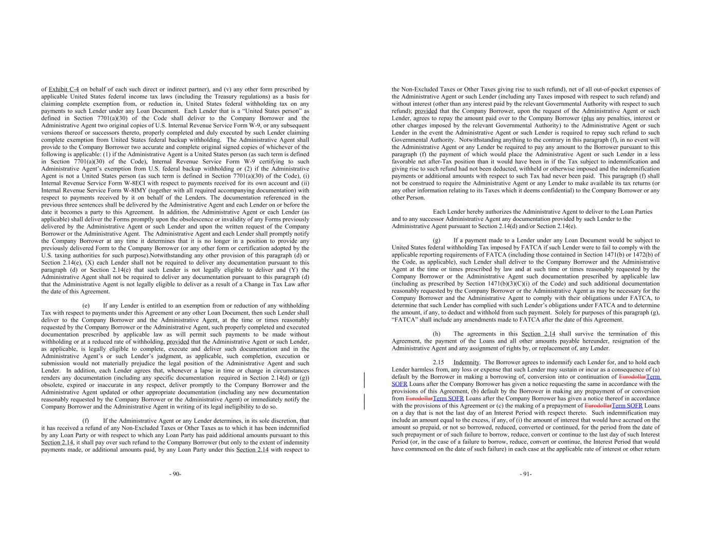 of Exhibit C-4 on behalf of each such direct or indirect partner), and (v) any other form prescribed by applicable United States federal income tax laws (including the Treasury regulations) as a basis for claiming complete exemption from, or reduction in, United States federal withholding tax on any payments to such Lender under any Loan Document. Each Lender that is a “United States person” as defined in Section 7701(a)(30) of the Code shall deliver to the Company Borrower and the Administrative Agent two original copies of U.S. Internal Revenue Service Form W-9, or any subsequent versions thereof or successors thereto, properly completed and duly executed by such Lender claiming complete exemption from United States federal backup withholding. The Administrative Agent shall provide to the Company Borrower two accurate and complete original signed copies of whichever of the following is applicable: (1) if the Administrative Agent is a United States person (as such term is defined in Section 7701(a)(30) of the Code), Internal Revenue Service Form W-9 certifying to such Administrative Agent’s exemption from U.S. federal backup withholding or (2) if the Administrative Agent is not a United States person (as such term is defined in Section 7701(a)(30) of the Code), (i) Internal Revenue Service Form W-8ECI with respect to payments received for its own account and (ii) Internal Revenue Service Form W-8IMY (together with all required accompanying documentation) with respect to payments received by it on behalf of the Lenders. The documentation referenced in the previous three sentences shall be delivered by the Administrative Agent and each Lender on or before the date it becomes a party to this Agreement. In addition, the Administrative Agent or each Lender (as applicable) shall deliver the Forms promptly upon the obsolescence or invalidity of any Forms previously delivered by the Administrative Agent or such Lender and upon the written request of the Company Borrower or the Administrative Agent. The Administrative Agent and each Lender shall promptly notify the Company Borrower at any time it determines that it is no longer in a position to provide any previously delivered Form to the Company Borrower (or any other form or certification adopted by the U.S. taxing authorities for such purpose).Notwithstanding any other provision of this paragraph (d) or Section 2.14(e), (X) each Lender shall not be required to deliver any documentation pursuant to this paragraph (d) or Section 2.14(e) that such Lender is not legally eligible to deliver and (Y) the Administrative Agent shall not be required to deliver any documentation pursuant to this paragraph (d) that the Administrative Agent is not legally eligible to deliver as a result of a Change in Tax Law after the date of this Agreement. If any Lender is entitled to an exemption from or reduction of any withholding(e) Tax with respect to payments under this Agreement or any other Loan Document, then such Lender shall deliver to the Company Borrower and the Administrative Agent, at the time or times reasonably requested by the Company Borrower or the Administrative Agent, such properly completed and executed documentation prescribed by applicable law as will permit such payments to be made without withholding or at a reduced rate of withholding, provided that the Administrative Agent or such Lender, as applicable, is legally eligible to complete, execute and deliver such documentation and in the Administrative Agent’s or such Lender’s judgment, as applicable, such completion, execution or submission would not materially prejudice the legal position of the Administrative Agent and such Lender. In addition, each Lender agrees that, whenever a lapse in time or change in circumstances renders any documentation (including any specific documentation required in Section 2.14(d) or (g)) obsolete, expired or inaccurate in any respect, deliver promptly to the Company Borrower and the Administrative Agent updated or other appropriate documentation (including any new documentation reasonably requested by the Company Borrower or the Administrative Agent) or immediately notify the Company Borrower and the Administrative Agent in writing of its legal ineligibility to do so. If the Administrative Agent or any Lender determines, in its sole discretion, that(f) it has received a refund of any Non-Excluded Taxes or Other Taxes as to which it has been indemnified by any Loan Party or with respect to which any Loan Party has paid additional amounts pursuant to this Section 2.14, it shall pay over such refund to the Company Borrower (but only to the extent of indemnity payments made, or additional amounts paid, by any Loan Party under this Section 2.14 with respect to - 90- the Non-Excluded Taxes or Other Taxes giving rise to such refund), net of all out-of-pocket expenses of the Administrative Agent or such Lender (including any Taxes imposed with respect to such refund) and without interest (other than any interest paid by the relevant Governmental Authority with respect to such refund); provided that the Company Borrower, upon the request of the Administrative Agent or such Lender, agrees to repay the amount paid over to the Company Borrower (plus any penalties, interest or other charges imposed by the relevant Governmental Authority) to the Administrative Agent or such Lender in the event the Administrative Agent or such Lender is required to repay such refund to such Governmental Authority. Notwithstanding anything to the contrary in this paragraph (f), in no event will the Administrative Agent or any Lender be required to pay any amount to the Borrower pursuant to this paragraph (f) the payment of which would place the Administrative Agent or such Lender in a less favorable net after-Tax position than it would have been in if the Tax subject to indemnification and giving rise to such refund had not been deducted, withheld or otherwise imposed and the indemn