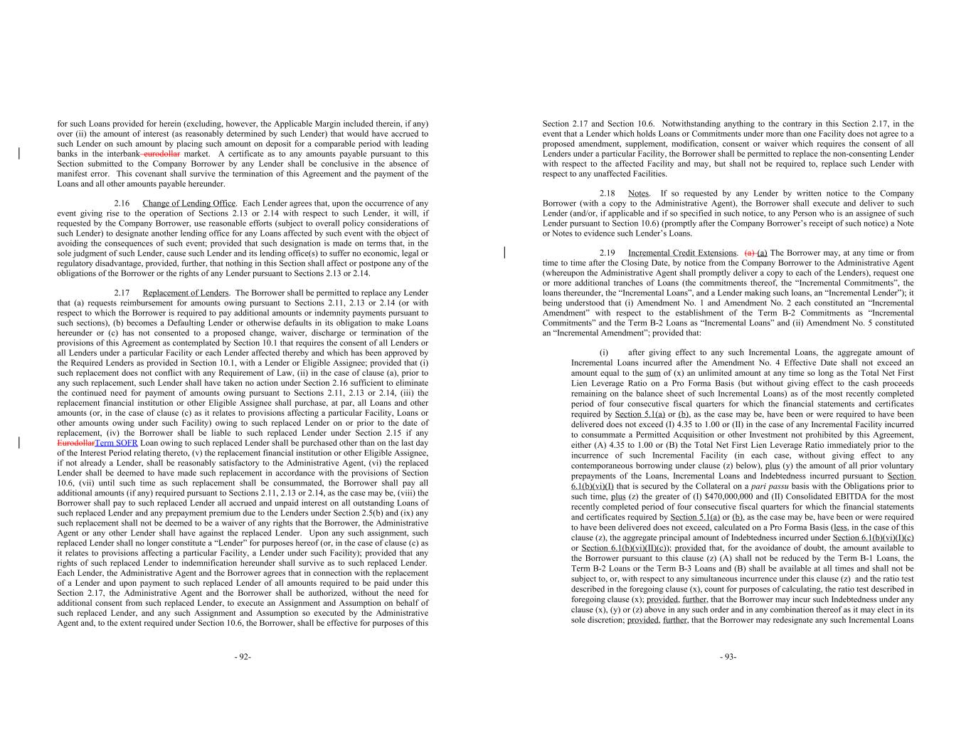 for such Loans provided for herein (excluding, however, the Applicable Margin included therein, if any) over (ii) the amount of interest (as reasonably determined by such Lender) that would have accrued to such Lender on such amount by placing such amount on deposit for a comparable period with leading banks in the interbank eurodollar market. A certificate as to any amounts payable pursuant to this Section submitted to the Company Borrower by any Lender shall be conclusive in the absence of manifest error. This covenant shall survive the termination of this Agreement and the payment of the Loans and all other amounts payable hereunder. Change of Lending Office. Each Lender agrees that, upon the occurrence of any2.16 event giving rise to the operation of Sections 2.13 or 2.14 with respect to such Lender, it will, if requested by the Company Borrower, use reasonable efforts (subject to overall policy considerations of such Lender) to designate another lending office for any Loans affected by such event with the object of avoiding the consequences of such event; provided that such designation is made on terms that, in the sole judgment of such Lender, cause such Lender and its lending office(s) to suffer no economic, legal or regulatory disadvantage, provided, further, that nothing in this Section shall affect or postpone any of the obligations of the Borrower or the rights of any Lender pursuant to Sections 2.13 or 2.14. Replacement of Lenders. The Borrower shall be permitted to replace any Lender2.17 that (a) requests reimbursement for amounts owing pursuant to Sections 2.11, 2.13 or 2.14 (or with respect to which the Borrower is required to pay additional amounts or indemnity payments pursuant to such sections), (b) becomes a Defaulting Lender or otherwise defaults in its obligation to make Loans hereunder or (c) has not consented to a proposed change, waiver, discharge or termination of the provisions of this Agreement as contemplated by Section 10.1 that requires the consent of all Lenders or all Lenders under a particular Facility or each Lender affected thereby and which has been approved by the Required Lenders as provided in Section 10.1, with a Lender or Eligible Assignee; provided that (i) such replacement does not conflict with any Requirement of Law, (ii) in the case of clause (a), prior to any such replacement, such Lender shall have taken no action under Section 2.16 sufficient to eliminate the continued need for payment of amounts owing pursuant to Sections 2.11, 2.13 or 2.14, (iii) the replacement financial institution or other Eligible Assignee shall purchase, at par, all Loans and other amounts (or, in the case of clause (c) as it relates to provisions affecting a particular Facility, Loans or other amounts owing under such Facility) owing to such replaced Lender on or prior to the date of replacement, (iv) the Borrower shall be liable to such replaced Lender under Section 2.15 if any EurodollarTerm SOFR Loan owing to such replaced Lender shall be purchased other than on the last day of the Interest Period relating thereto, (v) the replacement financial institution or other Eligible Assignee, if not already a Lender, shall be reasonably satisfactory to the Administrative Agent, (vi) the replaced Lender shall be deemed to have made such replacement in accordance with the provisions of Section 10.6, (vii) until such time as such replacement shall be consummated, the Borrower shall pay all additional amounts (if any) required pursuant to Sections 2.11, 2.13 or 2.14, as the case may be, (viii) the Borrower shall pay to such replaced Lender all accrued and unpaid interest on all outstanding Loans of such replaced Lender and any prepayment premium due to the Lenders under Section 2.5(b) and (ix) any such replacement shall not be deemed to be a waiver of any rights that the Borrower, the Administrative Agent or any other Lender shall have against the replaced Lender. Upon any such assignment, such replaced Lender shall no longer constitute a “Lender” for purposes hereof (or, in the case of clause (c) as it relates to provisions affecting a particular Facility, a Lender under such Facility); provided that any rights of such replaced Lender to indemnification hereunder shall survive as to such replaced Lender. Each Lender, the Administrative Agent and the Borrower agrees that in connection with the replacement of a Lender and upon payment to such replaced Lender of all amounts required to be paid under this Section 2.17, the Administrative Agent and the Borrower shall be authorized, without the need for additional consent from such replaced Lender, to execute an Assignment and Assumption on behalf of such replaced Lender, and any such Assignment and Assumption so executed by the Administrative Agent and, to the extent required under Section 10.6, the Borrower, shall be effective for purposes of this - 92- Section 2.17 and Section 10.6. Notwithstanding anything to the contrary in this Section 2.17, in the event that a Lender which holds Loans or Commitments under more than one Facility does not agree to a proposed amendment, supplement, modification, consent or waiver which requires the consent of all Lenders under a particular Facility, the Borrower shall be permitted to replace the non-consenting Lender with respect to the affected Facility and may, but shall not be required to, replace such Lender with respect to any unaffected Facilities. Notes. If so requested by any Lender by written notice to the Company2.18 Borrower (with a copy to the Administrative Agent), the Borrower shall execute and deliver to such Lender (and/or, if applicable and if so specified in such notice, to any Person who is an assignee of such Lender pursuant to Section 10.6) (promptly after the Company Borrower’s receipt of such notice) a Note or Notes to evidence such Lender’s Loans. Incremental Credit Extensions. (a) (a) The Borrower may, at any time or from2.19 time to time after the Closing Dat
