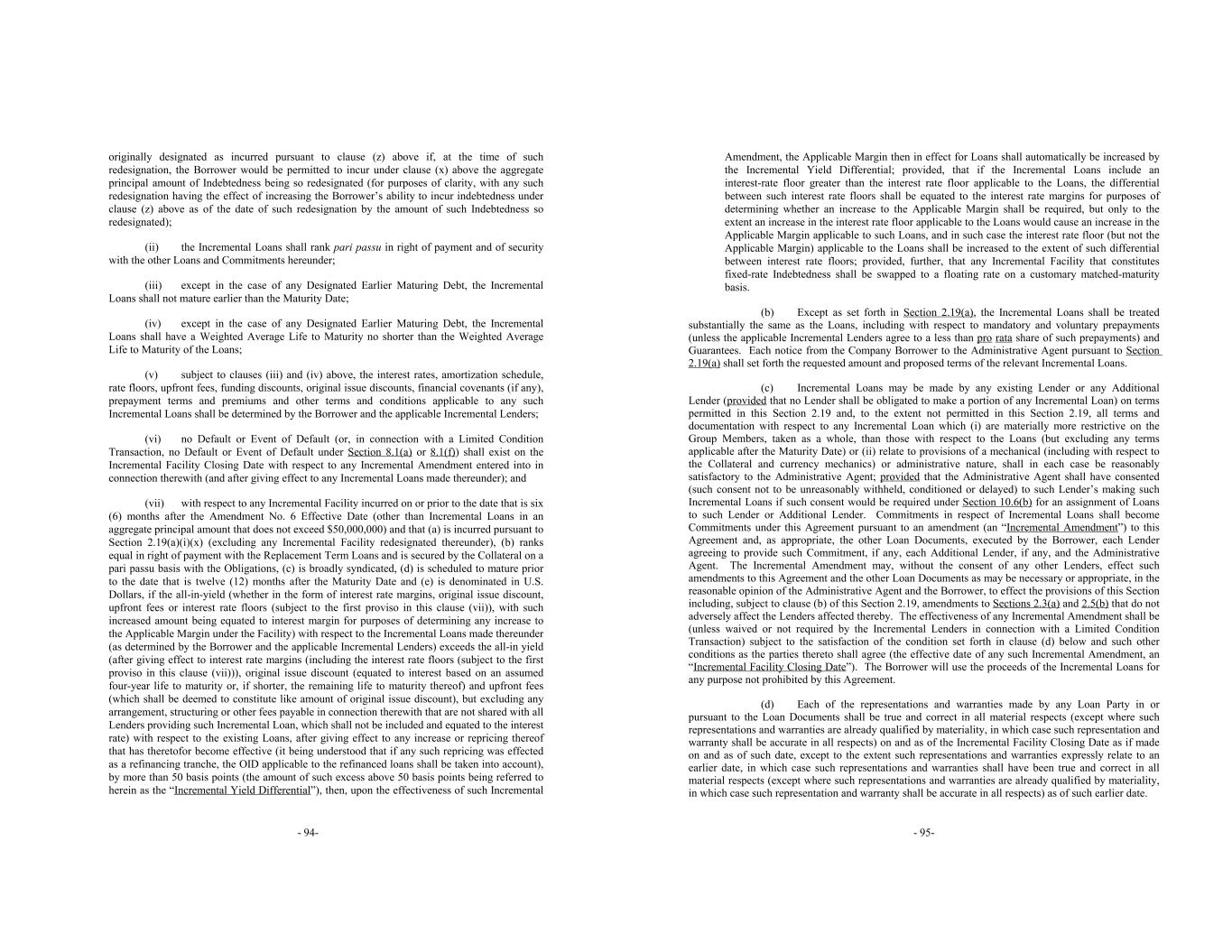 originally designated as incurred pursuant to clause (z) above if, at the time of such redesignation, the Borrower would be permitted to incur under clause (x) above the aggregate principal amount of Indebtedness being so redesignated (for purposes of clarity, with any such redesignation having the effect of increasing the Borrower’s ability to incur indebtedness under clause (z) above as of the date of such redesignation by the amount of such Indebtedness so redesignated); the Incremental Loans shall rank pari passu in right of payment and of security(ii) with the other Loans and Commitments hereunder; except in the case of any Designated Earlier Maturing Debt, the Incremental(iii) Loans shall not mature earlier than the Maturity Date; except in the case of any Designated Earlier Maturing Debt, the Incremental(iv) Loans shall have a Weighted Average Life to Maturity no shorter than the Weighted Average Life to Maturity of the Loans; subject to clauses (iii) and (iv) above, the interest rates, amortization schedule,(v) rate floors, upfront fees, funding discounts, original issue discounts, financial covenants (if any), prepayment terms and premiums and other terms and conditions applicable to any such Incremental Loans shall be determined by the Borrower and the applicable Incremental Lenders; no Default or Event of Default (or, in connection with a Limited Condition(vi) Transaction, no Default or Event of Default under Section 8.1(a) or 8.1(f)) shall exist on the Incremental Facility Closing Date with respect to any Incremental Amendment entered into in connection therewith (and after giving effect to any Incremental Loans made thereunder); and with respect to any Incremental Facility incurred on or prior to the date that is six(vii) (6) months after the Amendment No. 6 Effective Date (other than Incremental Loans in an aggregate principal amount that does not exceed $50,000,000) and that (a) is incurred pursuant to Section 2.19(a)(i)(x) (excluding any Incremental Facility redesignated thereunder), (b) ranks equal in right of payment with the Replacement Term Loans and is secured by the Collateral on a pari passu basis with the Obligations, (c) is broadly syndicated, (d) is scheduled to mature prior to the date that is twelve (12) months after the Maturity Date and (e) is denominated in U.S. Dollars, if the all-in-yield (whether in the form of interest rate margins, original issue discount, upfront fees or interest rate floors (subject to the first proviso in this clause (vii)), with such increased amount being equated to interest margin for purposes of determining any increase to the Applicable Margin under the Facility) with respect to the Incremental Loans made thereunder (as determined by the Borrower and the applicable Incremental Lenders) exceeds the all-in yield (after giving effect to interest rate margins (including the interest rate floors (subject to the first proviso in this clause (vii))), original issue discount (equated to interest based on an assumed four-year life to maturity or, if shorter, the remaining life to maturity thereof) and upfront fees (which shall be deemed to constitute like amount of original issue discount), but excluding any arrangement, structuring or other fees payable in connection therewith that are not shared with all Lenders providing such Incremental Loan, which shall not be included and equated to the interest rate) with respect to the existing Loans, after giving effect to any increase or repricing thereof that has theretofor become effective (it being understood that if any such repricing was effected as a refinancing tranche, the OID applicable to the refinanced loans shall be taken into account), by more than 50 basis points (the amount of such excess above 50 basis points being referred to herein as the “Incremental Yield Differential”), then, upon the effectiveness of such Incremental - 94- Amendment, the Applicable Margin then in effect for Loans shall automatically be increased by the Incremental Yield Differential; provided, that if the Incremental Loans include an interest-rate floor greater than the interest rate floor applicable to the Loans, the differential between such interest rate floors shall be equated to the interest rate margins for purposes of determining whether an increase to the Applicable Margin shall be required, but only to the extent an increase in the interest rate floor applicable to the Loans would cause an increase in the Applicable Margin applicable to such Loans, and in such case the interest rate floor (but not the Applicable Margin) applicable to the Loans shall be increased to the extent of such differential between interest rate floors; provided, further, that any Incremental Facility that constitutes fixed-rate Indebtedness shall be swapped to a floating rate on a customary matched-maturity basis. Except as set forth in Section 2.19(a), the Incremental Loans shall be treated(b) substantially the same as the Loans, including with respect to mandatory and voluntary prepayments (unless the applicable Incremental Lenders agree to a less than pro rata share of such prepayments) and Guarantees. Each notice from the Company Borrower to the Administrative Agent pursuant to Section 2.19(a) shall set forth the requested amount and proposed terms of the relevant Incremental Loans. Incremental Loans may be made by any existing Lender or any Additional(c) Lender (provided that no Lender shall be obligated to make a portion of any Incremental Loan) on terms permitted in this Section 2.19 and, to the extent not permitted in this Section 2.19, all terms and documentation with respect to any Incremental Loan which (i) are materially more restrictive on the Group Members, taken as a whole, than those with respect to the Loans (but excluding any terms applicable after the Maturity Date) or (ii) relate to provisions of a mechanical (including with respect to the Collateral and currency mechanics) or administrative natur