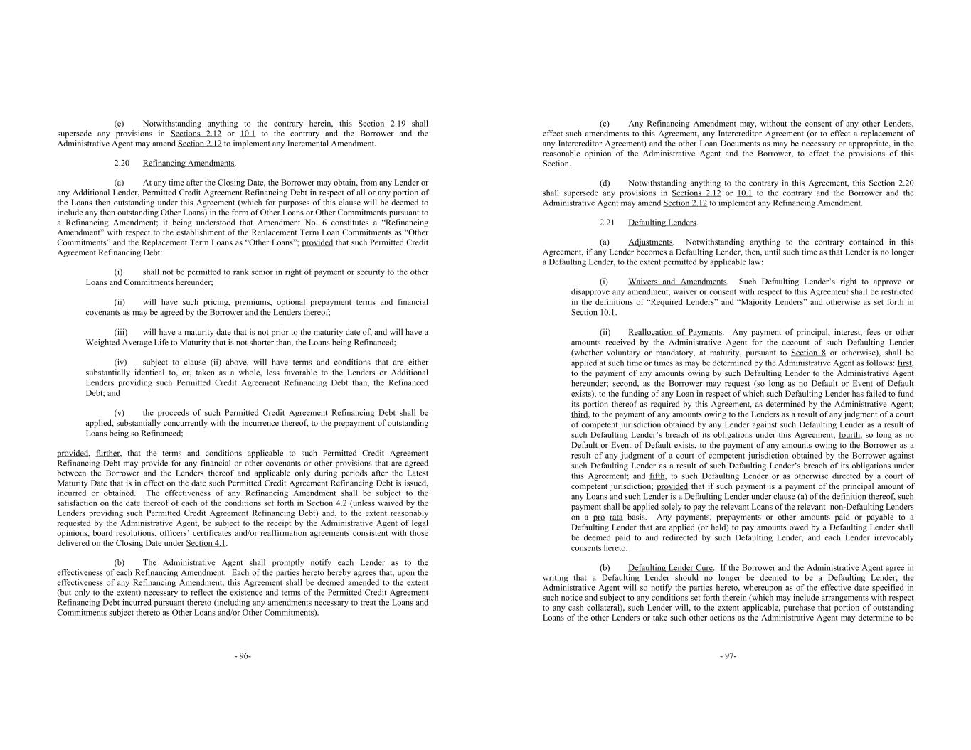 Notwithstanding anything to the contrary herein, this Section 2.19 shall(e) supersede any provisions in Sections 2.12 or 10.1 to the contrary and the Borrower and the Administrative Agent may amend Section 2.12 to implement any Incremental Amendment. Refinancing Amendments.2.20 At any time after the Closing Date, the Borrower may obtain, from any Lender or(a) any Additional Lender, Permitted Credit Agreement Refinancing Debt in respect of all or any portion of the Loans then outstanding under this Agreement (which for purposes of this clause will be deemed to include any then outstanding Other Loans) in the form of Other Loans or Other Commitments pursuant to a Refinancing Amendment; it being understood that Amendment No. 6 constitutes a “Refinancing Amendment” with respect to the establishment of the Replacement Term Loan Commitments as “Other Commitments” and the Replacement Term Loans as “Other Loans”; provided that such Permitted Credit Agreement Refinancing Debt: shall not be permitted to rank senior in right of payment or security to the other(i) Loans and Commitments hereunder; will have such pricing, premiums, optional prepayment terms and financial(ii) covenants as may be agreed by the Borrower and the Lenders thereof; will have a maturity date that is not prior to the maturity date of, and will have a(iii) Weighted Average Life to Maturity that is not shorter than, the Loans being Refinanced; subject to clause (ii) above, will have terms and conditions that are either(iv) substantially identical to, or, taken as a whole, less favorable to the Lenders or Additional Lenders providing such Permitted Credit Agreement Refinancing Debt than, the Refinanced Debt; and the proceeds of such Permitted Credit Agreement Refinancing Debt shall be(v) applied, substantially concurrently with the incurrence thereof, to the prepayment of outstanding Loans being so Refinanced; provided, further, that the terms and conditions applicable to such Permitted Credit Agreement Refinancing Debt may provide for any financial or other covenants or other provisions that are agreed between the Borrower and the Lenders thereof and applicable only during periods after the Latest Maturity Date that is in effect on the date such Permitted Credit Agreement Refinancing Debt is issued, incurred or obtained. The effectiveness of any Refinancing Amendment shall be subject to the satisfaction on the date thereof of each of the conditions set forth in Section 4.2 (unless waived by the Lenders providing such Permitted Credit Agreement Refinancing Debt) and, to the extent reasonably requested by the Administrative Agent, be subject to the receipt by the Administrative Agent of legal opinions, board resolutions, officers’ certificates and/or reaffirmation agreements consistent with those delivered on the Closing Date under Section 4.1. The Administrative Agent shall promptly notify each Lender as to the(b) effectiveness of each Refinancing Amendment. Each of the parties hereto hereby agrees that, upon the effectiveness of any Refinancing Amendment, this Agreement shall be deemed amended to the extent (but only to the extent) necessary to reflect the existence and terms of the Permitted Credit Agreement Refinancing Debt incurred pursuant thereto (including any amendments necessary to treat the Loans and Commitments subject thereto as Other Loans and/or Other Commitments). - 96- Any Refinancing Amendment may, without the consent of any other Lenders,(c) effect such amendments to this Agreement, any Intercreditor Agreement (or to effect a replacement of any Intercreditor Agreement) and the other Loan Documents as may be necessary or appropriate, in the reasonable opinion of the Administrative Agent and the Borrower, to effect the provisions of this Section. Notwithstanding anything to the contrary in this Agreement, this Section 2.20(d) shall supersede any provisions in Sections 2.12 or 10.1 to the contrary and the Borrower and the Administrative Agent may amend Section 2.12 to implement any Refinancing Amendment. Defaulting Lenders.2.21 Adjustments. Notwithstanding anything to the contrary contained in this(a) Agreement, if any Lender becomes a Defaulting Lender, then, until such time as that Lender is no longer a Defaulting Lender, to the extent permitted by applicable law: Waivers and Amendments. Such Defaulting Lender’s right to approve or(i) disapprove any amendment, waiver or consent with respect to this Agreement shall be restricted in the definitions of “Required Lenders” and “Majority Lenders” and otherwise as set forth in Section 10.1. Reallocation of Payments. Any payment of principal, interest, fees or other(ii) amounts received by the Administrative Agent for the account of such Defaulting Lender (whether voluntary or mandatory, at maturity, pursuant to Section 8 or otherwise), shall be applied at such time or times as may be determined by the Administrative Agent as follows: first, to the payment of any amounts owing by such Defaulting Lender to the Administrative Agent hereunder; second, as the Borrower may request (so long as no Default or Event of Default exists), to the funding of any Loan in respect of which such Defaulting Lender has failed to fund its portion thereof as required by this Agreement, as determined by the Administrative Agent; third, to the payment of any amounts owing to the Lenders as a result of any judgment of a court of competent jurisdiction obtained by any Lender against such Defaulting Lender as a result of such Defaulting Lender’s breach of its obligations under this Agreement; fourth, so long as no Default or Event of Default exists, to the payment of any amounts owing to the Borrower as a result of any judgment of a court of competent jurisdiction obtained by the Borrower against such Defaulting Lender as a result of such Defaulting Lender’s breach of its obligations under this Agreement; and fifth, to such Defaulting Lender or as otherwise directed by 