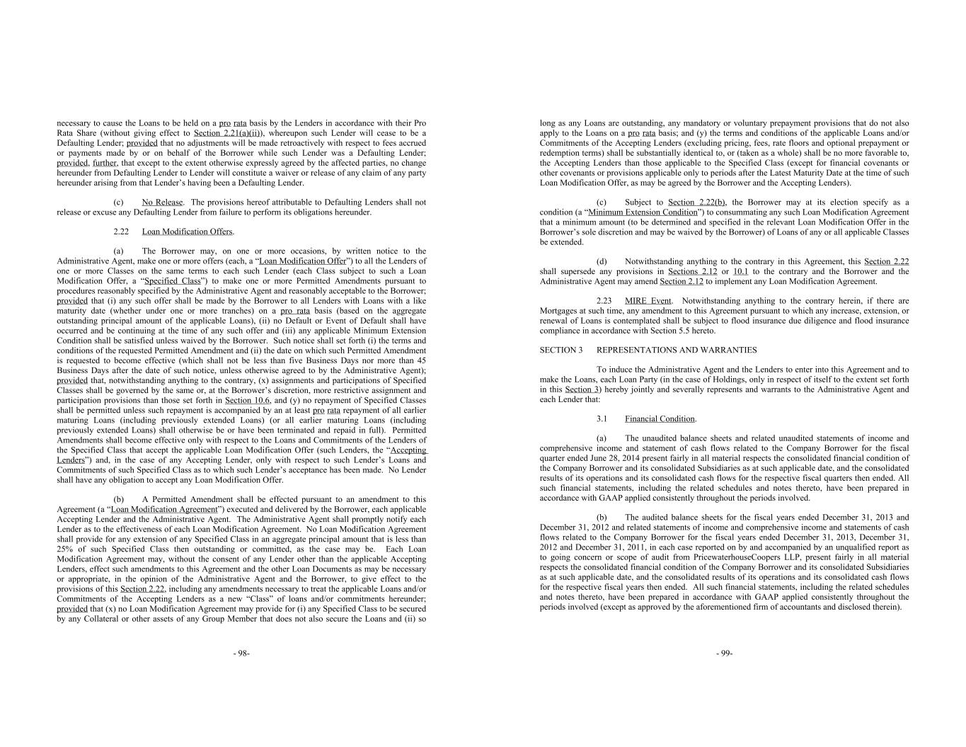 necessary to cause the Loans to be held on a pro rata basis by the Lenders in accordance with their Pro Rata Share (without giving effect to Section 2.21(a)(ii)), whereupon such Lender will cease to be a Defaulting Lender; provided that no adjustments will be made retroactively with respect to fees accrued or payments made by or on behalf of the Borrower while such Lender was a Defaulting Lender; provided, further, that except to the extent otherwise expressly agreed by the affected parties, no change hereunder from Defaulting Lender to Lender will constitute a waiver or release of any claim of any party hereunder arising from that Lender’s having been a Defaulting Lender. No Release. The provisions hereof attributable to Defaulting Lenders shall not(c) release or excuse any Defaulting Lender from failure to perform its obligations hereunder. Loan Modification Offers.2.22 The Borrower may, on one or more occasions, by written notice to the(a) Administrative Agent, make one or more offers (each, a “Loan Modification Offer”) to all the Lenders of one or more Classes on the same terms to each such Lender (each Class subject to such a Loan Modification Offer, a “Specified Class”) to make one or more Permitted Amendments pursuant to procedures reasonably specified by the Administrative Agent and reasonably acceptable to the Borrower; provided that (i) any such offer shall be made by the Borrower to all Lenders with Loans with a like maturity date (whether under one or more tranches) on a pro rata basis (based on the aggregate outstanding principal amount of the applicable Loans), (ii) no Default or Event of Default shall have occurred and be continuing at the time of any such offer and (iii) any applicable Minimum Extension Condition shall be satisfied unless waived by the Borrower. Such notice shall set forth (i) the terms and conditions of the requested Permitted Amendment and (ii) the date on which such Permitted Amendment is requested to become effective (which shall not be less than five Business Days nor more than 45 Business Days after the date of such notice, unless otherwise agreed to by the Administrative Agent); provided that, notwithstanding anything to the contrary, (x) assignments and participations of Specified Classes shall be governed by the same or, at the Borrower’s discretion, more restrictive assignment and participation provisions than those set forth in Section 10.6, and (y) no repayment of Specified Classes shall be permitted unless such repayment is accompanied by an at least pro rata repayment of all earlier maturing Loans (including previously extended Loans) (or all earlier maturing Loans (including previously extended Loans) shall otherwise be or have been terminated and repaid in full). Permitted Amendments shall become effective only with respect to the Loans and Commitments of the Lenders of the Specified Class that accept the applicable Loan Modification Offer (such Lenders, the “Accepting Lenders”) and, in the case of any Accepting Lender, only with respect to such Lender’s Loans and Commitments of such Specified Class as to which such Lender’s acceptance has been made. No Lender shall have any obligation to accept any Loan Modification Offer. A Permitted Amendment shall be effected pursuant to an amendment to this(b) Agreement (a “Loan Modification Agreement”) executed and delivered by the Borrower, each applicable Accepting Lender and the Administrative Agent. The Administrative Agent shall promptly notify each Lender as to the effectiveness of each Loan Modification Agreement. No Loan Modification Agreement shall provide for any extension of any Specified Class in an aggregate principal amount that is less than 25% of such Specified Class then outstanding or committed, as the case may be. Each Loan Modification Agreement may, without the consent of any Lender other than the applicable Accepting Lenders, effect such amendments to this Agreement and the other Loan Documents as may be necessary or appropriate, in the opinion of the Administrative Agent and the Borrower, to give effect to the provisions of this Section 2.22, including any amendments necessary to treat the applicable Loans and/or Commitments of the Accepting Lenders as a new “Class” of loans and/or commitments hereunder; provided that (x) no Loan Modification Agreement may provide for (i) any Specified Class to be secured by any Collateral or other assets of any Group Member that does not also secure the Loans and (ii) so - 98- long as any Loans are outstanding, any mandatory or voluntary prepayment provisions that do not also apply to the Loans on a pro rata basis; and (y) the terms and conditions of the applicable Loans and/or Commitments of the Accepting Lenders (excluding pricing, fees, rate floors and optional prepayment or redemption terms) shall be substantially identical to, or (taken as a whole) shall be no more favorable to, the Accepting Lenders than those applicable to the Specified Class (except for financial covenants or other covenants or provisions applicable only to periods after the Latest Maturity Date at the time of such Loan Modification Offer, as may be agreed by the Borrower and the Accepting Lenders). Subject to Section 2.22(b), the Borrower may at its election specify as a(c) condition (a “Minimum Extension Condition”) to consummating any such Loan Modification Agreement that a minimum amount (to be determined and specified in the relevant Loan Modification Offer in the Borrower’s sole discretion and may be waived by the Borrower) of Loans of any or all applicable Classes be extended. Notwithstanding anything to the contrary in this Agreement, this Section 2.22(d) shall supersede any provisions in Sections 2.12 or 10.1 to the contrary and the Borrower and the Administrative Agent may amend Section 2.12 to implement any Loan Modification Agreement. MIRE Event. Notwithstanding anything to the contrary herein, if there are2.23 Mortgages at