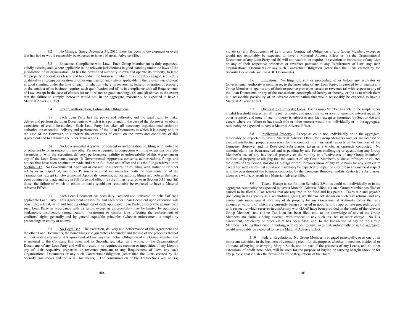 No Change. Since December 31, 2016, there has been no development or event3.2 that has had or would reasonably be expected to have a Material Adverse Effect. Existence; Compliance with Law. Each Group Member (a) is duly organized,3.3 validly existing and (where applicable in the relevant jurisdiction) in good standing under the laws of the jurisdiction of its organization, (b) has the power and authority to own and operate its property, to lease the property it operates as lessee and to conduct the business in which it is currently engaged, (c) is duly qualified as a foreign corporation or other organization and (where applicable in the relevant jurisdiction) in good standing under the laws of each jurisdiction where its ownership, lease or operation of property or the conduct of its business requires such qualification and (d) is in compliance with all Requirements of Law, except in the case of clauses (a) (as it relates to good standing), (c) and (d) above, to the extent that the failure to comply therewith would not, in the aggregate, reasonably be expected to have a Material Adverse Effect. Power; Authorization; Enforceable Obligations.3.4 Each Loan Party has the power and authority, and the legal right, to make,(a) deliver and perform the Loan Documents to which it is a party and, in the case of the Borrower, to obtain extensions of credit hereunder. Each Loan Party has taken all necessary organizational action to authorize the execution, delivery and performance of the Loan Documents to which it is a party and, in the case of the Borrower, to authorize the extensions of credit on the terms and conditions of this Agreement and to authorize the other Transactions. No Governmental Approval or consent or authorization of, filing with, notice to(b) or other act by or in respect of, any other Person is required in connection with the extensions of credit hereunder or with the execution, delivery, performance, validity or enforceability of this Agreement or any of the Loan Documents, except (i) Governmental Approvals, consents, authorizations, filings and notices that have been obtained or made and are in full force and effect and (ii) the filings referred to in Section 3.15. No Governmental Approval or consent or authorization of, filing with, notice to or other act by or in respect of, any other Person is required in connection with the consummation of the Transactions, except (x) Governmental Approvals, consents, authorizations, filings and notices that have been obtained or made and are in full force and effect, (y) the filings referred to in Section 3.15 and (iii) those, the failure of which to obtain or make would not reasonably be expected to have a Material Adverse Effect. Each Loan Document has been duly executed and delivered on behalf of each(c) applicable Loan Party. This Agreement constitutes, and each other Loan Document upon execution will constitute, a legal, valid and binding obligation of each applicable Loan Party, enforceable against each such Loan Party in accordance with its terms, except as enforceability may be limited by applicable bankruptcy, insolvency, reorganization, moratorium or similar laws affecting the enforcement of creditors’ rights generally and by general equitable principles (whether enforcement is sought by proceedings in equity or at law). No Legal Bar. The execution, delivery and performance of this Agreement and3.5 the other Loan Documents, the borrowings and guarantees hereunder and the use of the proceeds thereof will not violate any material Requirement of Law, any Contractual Obligation of any Group Member that is material to the Company Borrower and its Subsidiaries, taken as a whole, or the Organizational Documents of any Loan Party and will not result in, or require, the creation or imposition of any Lien on any of their respective properties or revenues pursuant to any Requirement of Law, any such Organizational Documents or any such Contractual Obligation (other than the Liens created by the Security Documents and the ABL Documents). The consummation of the Transactions will not (a) -100- violate (x) any Requirement of Law or any Contractual Obligation of any Group Member, except as would not reasonably be expected to have a Material Adverse Effect or (y) the Organizational Documents of any Loan Party and (b) will not result in, or require, the creation or imposition of any Lien on any of their respective properties or revenues pursuant to any Requirement of Law, any such Organizational Documents or any such Contractual Obligation (other than the Liens created by the Security Documents and the ABL Documents). Litigation. No litigation, suit or proceeding of or before any arbitrator or3.6 Governmental Authority is pending or, to the knowledge of any Loan Party, threatened by or against any Group Member or against any of their respective properties, assets or revenues (a) with respect to any of the Loan Documents or any of the transactions contemplated hereby or thereby, or (b) as to which there is a reasonable possibility of an adverse determination that would reasonably be expected to have a Material Adverse Effect. Ownership of Property; Liens. Each Group Member has title in fee simple to, or3.7 a valid leasehold interest in, all its real property, and good title to, or a valid leasehold interest in, all its other property, and none of such property is subject to any Lien except as permitted by Section 6.6 and except where the failure to have such title or other interest would not, individually or in the aggregate, reasonably be expected to have a Material Adverse Effect. Intellectual Property. Except as could not, individually or in the aggregate,3.8 reasonably be expected to have a Material Adverse Effect, the Group Members own, or are licensed to use, all intellectual property necessary for the conduct in all material respects of the business of the Company Borrower and its Restricted Subsidiaries, taken as a whole, as currently co