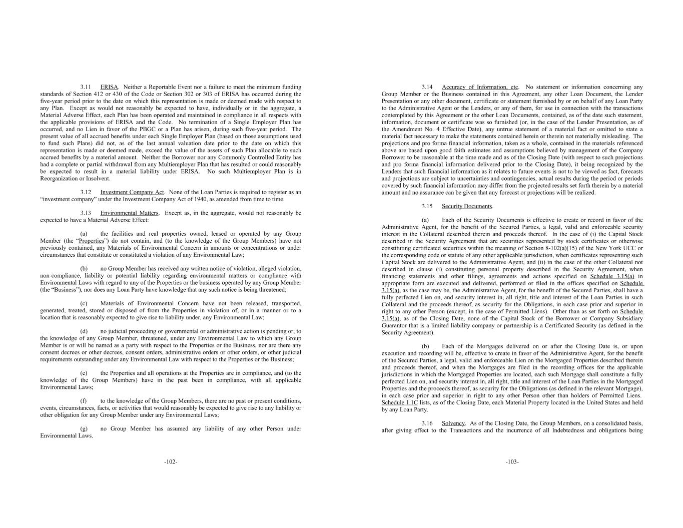 ERISA. Neither a Reportable Event nor a failure to meet the minimum funding3.11 standards of Section 412 or 430 of the Code or Section 302 or 303 of ERISA has occurred during the five-year period prior to the date on which this representation is made or deemed made with respect to any Plan. Except as would not reasonably be expected to have, individually or in the aggregate, a Material Adverse Effect, each Plan has been operated and maintained in compliance in all respects with the applicable provisions of ERISA and the Code. No termination of a Single Employer Plan has occurred, and no Lien in favor of the PBGC or a Plan has arisen, during such five-year period. The present value of all accrued benefits under each Single Employer Plan (based on those assumptions used to fund such Plans) did not, as of the last annual valuation date prior to the date on which this representation is made or deemed made, exceed the value of the assets of such Plan allocable to such accrued benefits by a material amount. Neither the Borrower nor any Commonly Controlled Entity has had a complete or partial withdrawal from any Multiemployer Plan that has resulted or could reasonably be expected to result in a material liability under ERISA. No such Multiemployer Plan is in Reorganization or Insolvent. Investment Company Act. None of the Loan Parties is required to register as an3.12 “investment company” under the Investment Company Act of 1940, as amended from time to time. Environmental Matters. Except as, in the aggregate, would not reasonably be3.13 expected to have a Material Adverse Effect: the facilities and real properties owned, leased or operated by any Group(a) Member (the “Properties”) do not contain, and (to the knowledge of the Group Members) have not previously contained, any Materials of Environmental Concern in amounts or concentrations or under circumstances that constitute or constituted a violation of any Environmental Law; no Group Member has received any written notice of violation, alleged violation,(b) non-compliance, liability or potential liability regarding environmental matters or compliance with Environmental Laws with regard to any of the Properties or the business operated by any Group Member (the “Business”), nor does any Loan Party have knowledge that any such notice is being threatened; Materials of Environmental Concern have not been released, transported,(c) generated, treated, stored or disposed of from the Properties in violation of, or in a manner or to a location that is reasonably expected to give rise to liability under, any Environmental Law; no judicial proceeding or governmental or administrative action is pending or, to(d) the knowledge of any Group Member, threatened, under any Environmental Law to which any Group Member is or will be named as a party with respect to the Properties or the Business, nor are there any consent decrees or other decrees, consent orders, administrative orders or other orders, or other judicial requirements outstanding under any Environmental Law with respect to the Properties or the Business; the Properties and all operations at the Properties are in compliance, and (to the(e) knowledge of the Group Members) have in the past been in compliance, with all applicable Environmental Laws; to the knowledge of the Group Members, there are no past or present conditions,(f) events, circumstances, facts, or activities that would reasonably be expected to give rise to any liability or other obligation for any Group Member under any Environmental Laws; no Group Member has assumed any liability of any other Person under(g) Environmental Laws. -102- Accuracy of Information, etc. No statement or information concerning any3.14 Group Member or the Business contained in this Agreement, any other Loan Document, the Lender Presentation or any other document, certificate or statement furnished by or on behalf of any Loan Party to the Administrative Agent or the Lenders, or any of them, for use in connection with the transactions contemplated by this Agreement or the other Loan Documents, contained, as of the date such statement, information, document or certificate was so furnished (or, in the case of the Lender Presentation, as of the Amendment No. 4 Effective Date), any untrue statement of a material fact or omitted to state a material fact necessary to make the statements contained herein or therein not materially misleading. The projections and pro forma financial information, taken as a whole, contained in the materials referenced above are based upon good faith estimates and assumptions believed by management of the Company Borrower to be reasonable at the time made and as of the Closing Date (with respect to such projections and pro forma financial information delivered prior to the Closing Date), it being recognized by the Lenders that such financial information as it relates to future events is not to be viewed as fact, forecasts and projections are subject to uncertainties and contingencies, actual results during the period or periods covered by such financial information may differ from the projected results set forth therein by a material amount and no assurance can be given that any forecast or projections will be realized. Security Documents.3.15 Each of the Security Documents is effective to create or record in favor of the(a) Administrative Agent, for the benefit of the Secured Parties, a legal, valid and enforceable security interest in the Collateral described therein and proceeds thereof. In the case of (i) the Capital Stock described in the Security Agreement that are securities represented by stock certificates or otherwise constituting certificated securities within the meaning of Section 8-102(a)(15) of the New York UCC or the corresponding code or statute of any other applicable jurisdiction, when certificates representing such Capital Stock are delivered to the Administrative Agent, and (ii) in the case of the other Coll