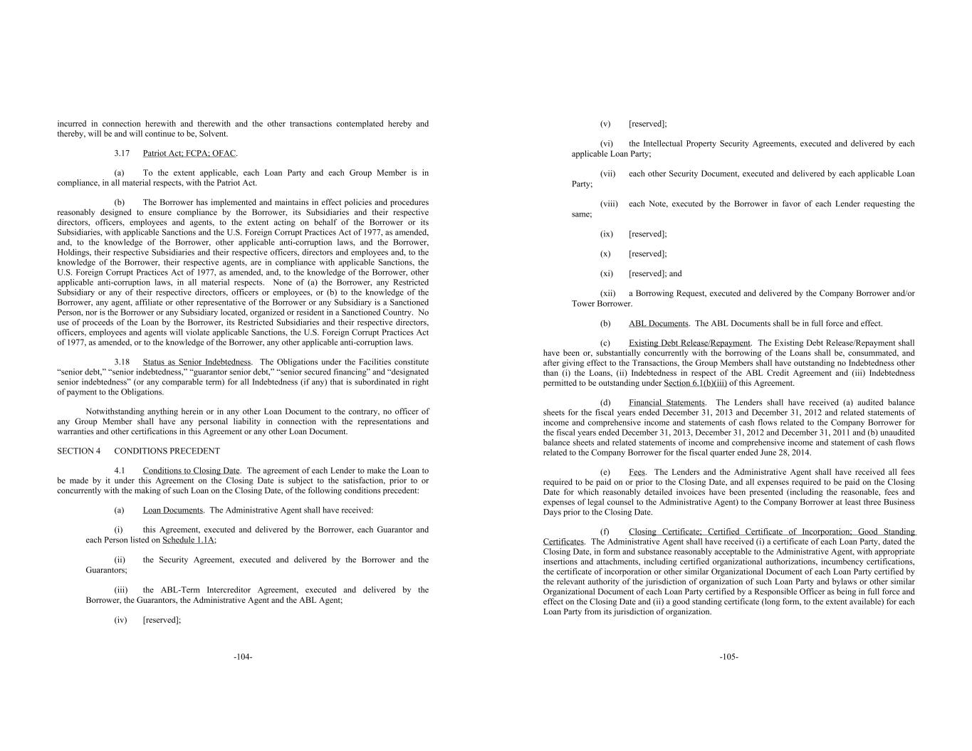 incurred in connection herewith and therewith and the other transactions contemplated hereby and thereby, will be and will continue to be, Solvent. Patriot Act; FCPA; OFAC.3.17 To the extent applicable, each Loan Party and each Group Member is in(a) compliance, in all material respects, with the Patriot Act. The Borrower has implemented and maintains in effect policies and procedures(b) reasonably designed to ensure compliance by the Borrower, its Subsidiaries and their respective directors, officers, employees and agents, to the extent acting on behalf of the Borrower or its Subsidiaries, with applicable Sanctions and the U.S. Foreign Corrupt Practices Act of 1977, as amended, and, to the knowledge of the Borrower, other applicable anti-corruption laws, and the Borrower, Holdings, their respective Subsidiaries and their respective officers, directors and employees and, to the knowledge of the Borrower, their respective agents, are in compliance with applicable Sanctions, the U.S. Foreign Corrupt Practices Act of 1977, as amended, and, to the knowledge of the Borrower, other applicable anti-corruption laws, in all material respects. None of (a) the Borrower, any Restricted Subsidiary or any of their respective directors, officers or employees, or (b) to the knowledge of the Borrower, any agent, affiliate or other representative of the Borrower or any Subsidiary is a Sanctioned Person, nor is the Borrower or any Subsidiary located, organized or resident in a Sanctioned Country. No use of proceeds of the Loan by the Borrower, its Restricted Subsidiaries and their respective directors, officers, employees and agents will violate applicable Sanctions, the U.S. Foreign Corrupt Practices Act of 1977, as amended, or to the knowledge of the Borrower, any other applicable anti-corruption laws. Status as Senior Indebtedness. The Obligations under the Facilities constitute3.18 “senior debt,” “senior indebtedness,” “guarantor senior debt,” “senior secured financing” and “designated senior indebtedness” (or any comparable term) for all Indebtedness (if any) that is subordinated in right of payment to the Obligations. Notwithstanding anything herein or in any other Loan Document to the contrary, no officer of any Group Member shall have any personal liability in connection with the representations and warranties and other certifications in this Agreement or any other Loan Document. CONDITIONS PRECEDENTSECTION 4 Conditions to Closing Date. The agreement of each Lender to make the Loan to4.1 be made by it under this Agreement on the Closing Date is subject to the satisfaction, prior to or concurrently with the making of such Loan on the Closing Date, of the following conditions precedent: Loan Documents. The Administrative Agent shall have received:(a) this Agreement, executed and delivered by the Borrower, each Guarantor and(i) each Person listed on Schedule 1.1A; the Security Agreement, executed and delivered by the Borrower and the(ii) Guarantors; the ABL-Term Intercreditor Agreement, executed and delivered by the(iii) Borrower, the Guarantors, the Administrative Agent and the ABL Agent; [reserved];(iv) -104- [reserved];(v) the Intellectual Property Security Agreements, executed and delivered by each(vi) applicable Loan Party; each other Security Document, executed and delivered by each applicable Loan(vii) Party; each Note, executed by the Borrower in favor of each Lender requesting the(viii) same; [reserved];(ix) [reserved];(x) [reserved]; and(xi) a Borrowing Request, executed and delivered by the Company Borrower and/or(xii) Tower Borrower. ABL Documents. The ABL Documents shall be in full force and effect.(b) Existing Debt Release/Repayment. The Existing Debt Release/Repayment shall(c) have been or, substantially concurrently with the borrowing of the Loans shall be, consummated, and after giving effect to the Transactions, the Group Members shall have outstanding no Indebtedness other than (i) the Loans, (ii) Indebtedness in respect of the ABL Credit Agreement and (iii) Indebtedness permitted to be outstanding under Section 6.1(b)(iii) of this Agreement. Financial Statements. The Lenders shall have received (a) audited balance(d) sheets for the fiscal years ended December 31, 2013 and December 31, 2012 and related statements of income and comprehensive income and statements of cash flows related to the Company Borrower for the fiscal years ended December 31, 2013, December 31, 2012 and December 31, 2011 and (b) unaudited balance sheets and related statements of income and comprehensive income and statement of cash flows related to the Company Borrower for the fiscal quarter ended June 28, 2014. Fees. The Lenders and the Administrative Agent shall have received all fees(e) required to be paid on or prior to the Closing Date, and all expenses required to be paid on the Closing Date for which reasonably detailed invoices have been presented (including the reasonable, fees and expenses of legal counsel to the Administrative Agent) to the Company Borrower at least three Business Days prior to the Closing Date. Closing Certificate; Certified Certificate of Incorporation; Good Standing(f) Certificates. The Administrative Agent shall have received (i) a certificate of each Loan Party, dated the Closing Date, in form and substance reasonably acceptable to the Administrative Agent, with appropriate insertions and attachments, including certified organizational authorizations, incumbency certifications, the certificate of incorporation or other similar Organizational Document of each Loan Party certified by the relevant authority of the jurisdiction of organization of such Loan Party and bylaws or other similar Organizational Document of each Loan Party certified by a Responsible Officer as being in full force and effect on the Closing Date and (ii) a good standing certificate (long form, to the extent available) for each Loan Party from its jurisdiction of organization. -105-