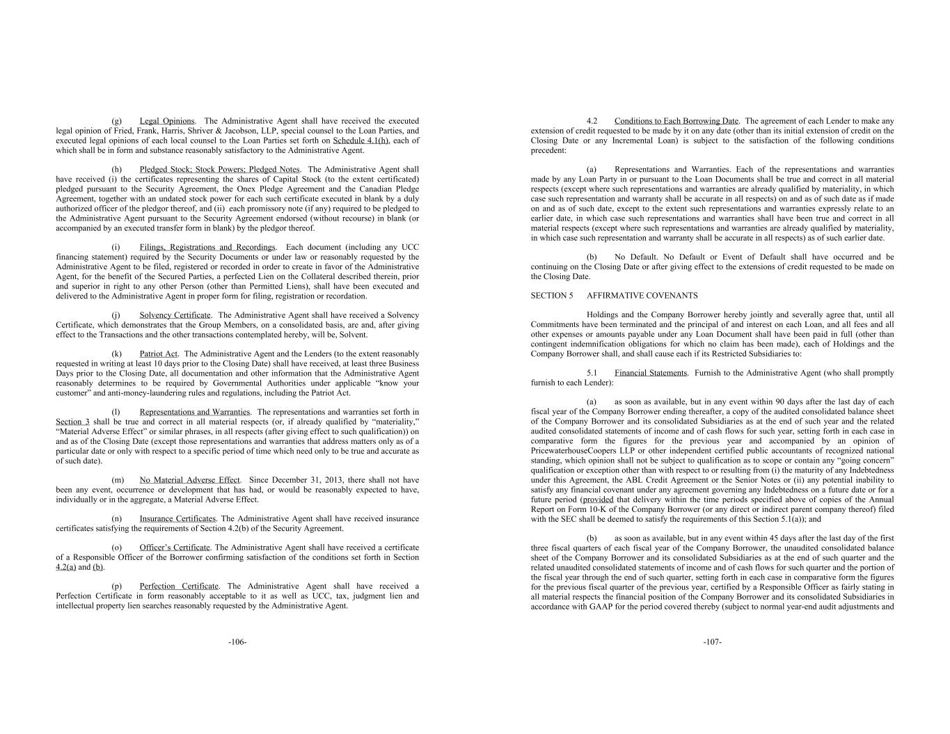 Legal Opinions. The Administrative Agent shall have received the executed(g) legal opinion of Fried, Frank, Harris, Shriver & Jacobson, LLP, special counsel to the Loan Parties, and executed legal opinions of each local counsel to the Loan Parties set forth on Schedule 4.1(h), each of which shall be in form and substance reasonably satisfactory to the Administrative Agent. Pledged Stock; Stock Powers; Pledged Notes. The Administrative Agent shall(h) have received (i) the certificates representing the shares of Capital Stock (to the extent certificated) pledged pursuant to the Security Agreement, the Onex Pledge Agreement and the Canadian Pledge Agreement, together with an undated stock power for each such certificate executed in blank by a duly authorized officer of the pledgor thereof, and (ii) each promissory note (if any) required to be pledged to the Administrative Agent pursuant to the Security Agreement endorsed (without recourse) in blank (or accompanied by an executed transfer form in blank) by the pledgor thereof. Filings, Registrations and Recordings. Each document (including any UCC(i) financing statement) required by the Security Documents or under law or reasonably requested by the Administrative Agent to be filed, registered or recorded in order to create in favor of the Administrative Agent, for the benefit of the Secured Parties, a perfected Lien on the Collateral described therein, prior and superior in right to any other Person (other than Permitted Liens), shall have been executed and delivered to the Administrative Agent in proper form for filing, registration or recordation. Solvency Certificate. The Administrative Agent shall have received a Solvency(j) Certificate, which demonstrates that the Group Members, on a consolidated basis, are and, after giving effect to the Transactions and the other transactions contemplated hereby, will be, Solvent. Patriot Act. The Administrative Agent and the Lenders (to the extent reasonably(k) requested in writing at least 10 days prior to the Closing Date) shall have received, at least three Business Days prior to the Closing Date, all documentation and other information that the Administrative Agent reasonably determines to be required by Governmental Authorities under applicable “know your customer” and anti-money-laundering rules and regulations, including the Patriot Act. Representations and Warranties. The representations and warranties set forth in(l) Section 3 shall be true and correct in all material respects (or, if already qualified by “materiality,” “Material Adverse Effect” or similar phrases, in all respects (after giving effect to such qualification)) on and as of the Closing Date (except those representations and warranties that address matters only as of a particular date or only with respect to a specific period of time which need only to be true and accurate as of such date). No Material Adverse Effect. Since December 31, 2013, there shall not have(m) been any event, occurrence or development that has had, or would be reasonably expected to have, individually or in the aggregate, a Material Adverse Effect. Insurance Certificates. The Administrative Agent shall have received insurance(n) certificates satisfying the requirements of Section 4.2(b) of the Security Agreement. Officer’s Certificate. The Administrative Agent shall have received a certificate(o) of a Responsible Officer of the Borrower confirming satisfaction of the conditions set forth in Section 4.2(a) and (b). Perfection Certificate. The Administrative Agent shall have received a(p) Perfection Certificate in form reasonably acceptable to it as well as UCC, tax, judgment lien and intellectual property lien searches reasonably requested by the Administrative Agent. -106- Conditions to Each Borrowing Date. The agreement of each Lender to make any4.2 extension of credit requested to be made by it on any date (other than its initial extension of credit on the Closing Date or any Incremental Loan) is subject to the satisfaction of the following conditions precedent: Representations and Warranties. Each of the representations and warranties(a) made by any Loan Party in or pursuant to the Loan Documents shall be true and correct in all material respects (except where such representations and warranties are already qualified by materiality, in which case such representation and warranty shall be accurate in all respects) on and as of such date as if made on and as of such date, except to the extent such representations and warranties expressly relate to an earlier date, in which case such representations and warranties shall have been true and correct in all material respects (except where such representations and warranties are already qualified by materiality, in which case such representation and warranty shall be accurate in all respects) as of such earlier date. No Default. No Default or Event of Default shall have occurred and be(b) continuing on the Closing Date or after giving effect to the extensions of credit requested to be made on the Closing Date. AFFIRMATIVE COVENANTSSECTION 5 Holdings and the Company Borrower hereby jointly and severally agree that, until all Commitments have been terminated and the principal of and interest on each Loan, and all fees and all other expenses or amounts payable under any Loan Document shall have been paid in full (other than contingent indemnification obligations for which no claim has been made), each of Holdings and the Company Borrower shall, and shall cause each if its Restricted Subsidiaries to: Financial Statements. Furnish to the Administrative Agent (who shall promptly5.1 furnish to each Lender): as soon as available, but in any event within 90 days after the last day of each(a) fiscal year of the Company Borrower ending thereafter, a copy of the audited consolidated balance sheet of the Company Borrower and its consolidated Subsidiaries as at the end of such year and the related audited conso