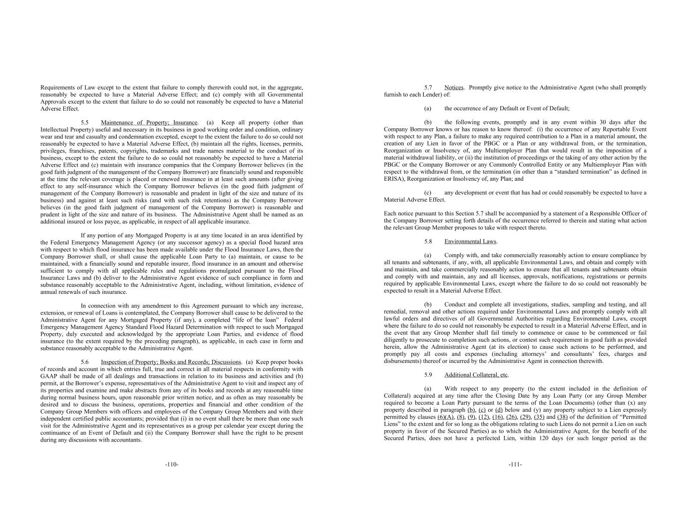 Requirements of Law except to the extent that failure to comply therewith could not, in the aggregate, reasonably be expected to have a Material Adverse Effect; and (c) comply with all Governmental Approvals except to the extent that failure to do so could not reasonably be expected to have a Material Adverse Effect. Maintenance of Property; Insurance. (a) Keep all property (other than5.5 Intellectual Property) useful and necessary in its business in good working order and condition, ordinary wear and tear and casualty and condemnation excepted, except to the extent the failure to do so could not reasonably be expected to have a Material Adverse Effect, (b) maintain all the rights, licenses, permits, privileges, franchises, patents, copyrights, trademarks and trade names material to the conduct of its business, except to the extent the failure to do so could not reasonably be expected to have a Material Adverse Effect and (c) maintain with insurance companies that the Company Borrower believes (in the good faith judgment of the management of the Company Borrower) are financially sound and responsible at the time the relevant coverage is placed or renewed insurance in at least such amounts (after giving effect to any self-insurance which the Company Borrower believes (in the good faith judgment of management of the Company Borrower) is reasonable and prudent in light of the size and nature of its business) and against at least such risks (and with such risk retentions) as the Company Borrower believes (in the good faith judgment of management of the Company Borrower) is reasonable and prudent in light of the size and nature of its business. The Administrative Agent shall be named as an additional insured or loss payee, as applicable, in respect of all applicable insurance. If any portion of any Mortgaged Property is at any time located in an area identified by the Federal Emergency Management Agency (or any successor agency) as a special flood hazard area with respect to which flood insurance has been made available under the Flood Insurance Laws, then the Company Borrower shall, or shall cause the applicable Loan Party to (a) maintain, or cause to be maintained, with a financially sound and reputable insurer, flood insurance in an amount and otherwise sufficient to comply with all applicable rules and regulations promulgated pursuant to the Flood Insurance Laws and (b) deliver to the Administrative Agent evidence of such compliance in form and substance reasonably acceptable to the Administrative Agent, including, without limitation, evidence of annual renewals of such insurance. In connection with any amendment to this Agreement pursuant to which any increase, extension, or renewal of Loans is contemplated, the Company Borrower shall cause to be delivered to the Administrative Agent for any Mortgaged Property (if any), a completed “life of the loan” Federal Emergency Management Agency Standard Flood Hazard Determination with respect to such Mortgaged Property, duly executed and acknowledged by the appropriate Loan Parties, and evidence of flood insurance (to the extent required by the preceding paragraph), as applicable, in each case in form and substance reasonably acceptable to the Administrative Agent. Inspection of Property; Books and Records; Discussions. (a) Keep proper books5.6 of records and account in which entries full, true and correct in all material respects in conformity with GAAP shall be made of all dealings and transactions in relation to its business and activities and (b) permit, at the Borrower’s expense, representatives of the Administrative Agent to visit and inspect any of its properties and examine and make abstracts from any of its books and records at any reasonable time during normal business hours, upon reasonable prior written notice, and as often as may reasonably be desired and to discuss the business, operations, properties and financial and other condition of the Company Group Members with officers and employees of the Company Group Members and with their independent certified public accountants; provided that (i) in no event shall there be more than one such visit for the Administrative Agent and its representatives as a group per calendar year except during the continuance of an Event of Default and (ii) the Company Borrower shall have the right to be present during any discussions with accountants. -110- Notices. Promptly give notice to the Administrative Agent (who shall promptly5.7 furnish to each Lender) of: the occurrence of any Default or Event of Default;(a) the following events, promptly and in any event within 30 days after the(b) Company Borrower knows or has reason to know thereof: (i) the occurrence of any Reportable Event with respect to any Plan, a failure to make any required contribution to a Plan in a material amount, the creation of any Lien in favor of the PBGC or a Plan or any withdrawal from, or the termination, Reorganization or Insolvency of, any Multiemployer Plan that would result in the imposition of a material withdrawal liability, or (ii) the institution of proceedings or the taking of any other action by the PBGC or the Company Borrower or any Commonly Controlled Entity or any Multiemployer Plan with respect to the withdrawal from, or the termination (in other than a “standard termination” as defined in ERISA), Reorganization or Insolvency of, any Plan; and any development or event that has had or could reasonably be expected to have a(c) Material Adverse Effect. Each notice pursuant to this Section 5.7 shall be accompanied by a statement of a Responsible Officer of the Company Borrower setting forth details of the occurrence referred to therein and stating what action the relevant Group Member proposes to take with respect thereto. Environmental Laws.5.8 Comply with, and take commercially reasonably action to ensure compliance by(a) all tenants and subtenants, if any, with, all applicable Environmental Laws, and 