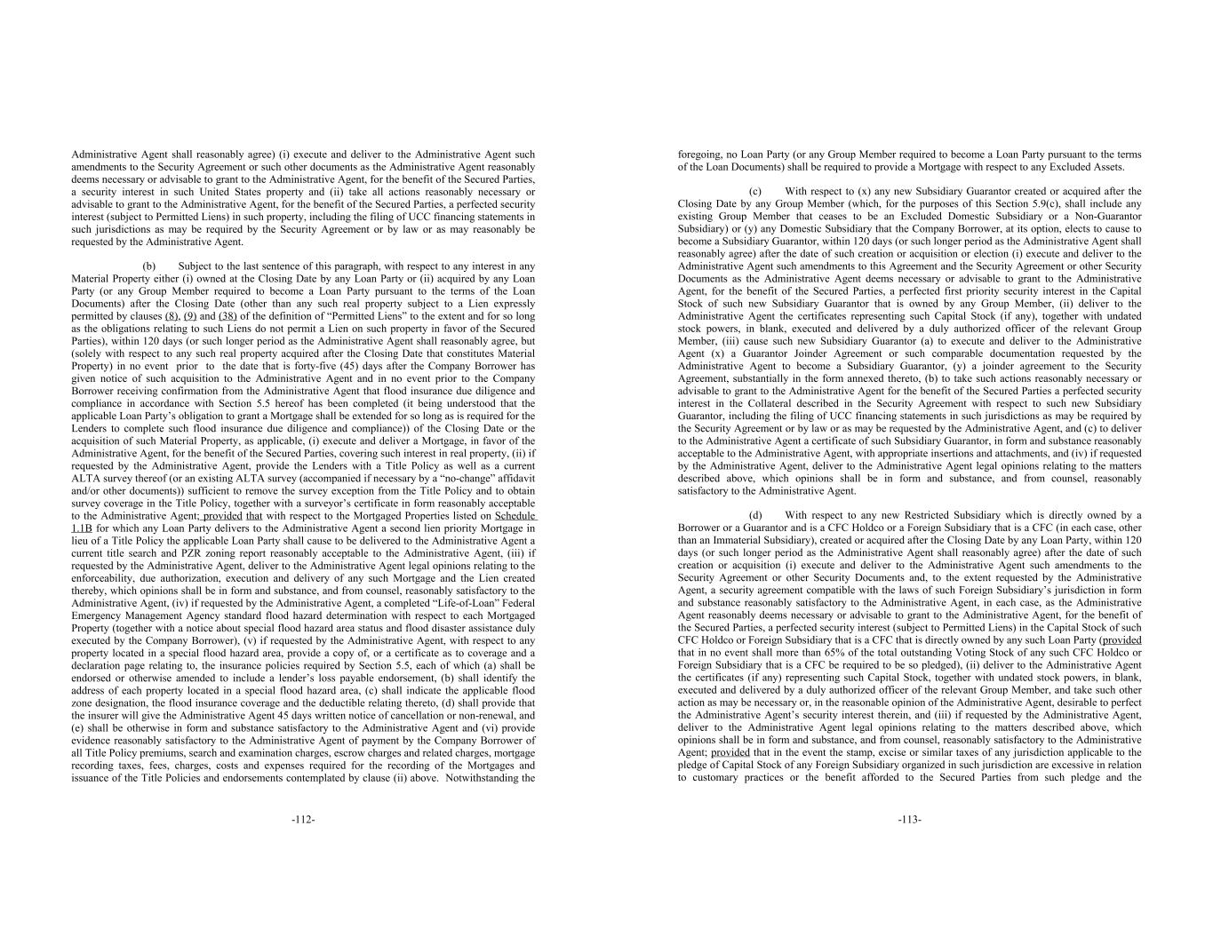 Administrative Agent shall reasonably agree) (i) execute and deliver to the Administrative Agent such amendments to the Security Agreement or such other documents as the Administrative Agent reasonably deems necessary or advisable to grant to the Administrative Agent, for the benefit of the Secured Parties, a security interest in such United States property and (ii) take all actions reasonably necessary or advisable to grant to the Administrative Agent, for the benefit of the Secured Parties, a perfected security interest (subject to Permitted Liens) in such property, including the filing of UCC financing statements in such jurisdictions as may be required by the Security Agreement or by law or as may reasonably be requested by the Administrative Agent. Subject to the last sentence of this paragraph, with respect to any interest in any(b) Material Property either (i) owned at the Closing Date by any Loan Party or (ii) acquired by any Loan Party (or any Group Member required to become a Loan Party pursuant to the terms of the Loan Documents) after the Closing Date (other than any such real property subject to a Lien expressly permitted by clauses (8), (9) and (38) of the definition of “Permitted Liens” to the extent and for so long as the obligations relating to such Liens do not permit a Lien on such property in favor of the Secured Parties), within 120 days (or such longer period as the Administrative Agent shall reasonably agree, but (solely with respect to any such real property acquired after the Closing Date that constitutes Material Property) in no event prior to the date that is forty-five (45) days after the Company Borrower has given notice of such acquisition to the Administrative Agent and in no event prior to the Company Borrower receiving confirmation from the Administrative Agent that flood insurance due diligence and compliance in accordance with Section 5.5 hereof has been completed (it being understood that the applicable Loan Party’s obligation to grant a Mortgage shall be extended for so long as is required for the Lenders to complete such flood insurance due diligence and compliance)) of the Closing Date or the acquisition of such Material Property, as applicable, (i) execute and deliver a Mortgage, in favor of the Administrative Agent, for the benefit of the Secured Parties, covering such interest in real property, (ii) if requested by the Administrative Agent, provide the Lenders with a Title Policy as well as a current ALTA survey thereof (or an existing ALTA survey (accompanied if necessary by a “no-change” affidavit and/or other documents)) sufficient to remove the survey exception from the Title Policy and to obtain survey coverage in the Title Policy, together with a surveyor’s certificate in form reasonably acceptable to the Administrative Agent; provided that with respect to the Mortgaged Properties listed on Schedule 1.1B for which any Loan Party delivers to the Administrative Agent a second lien priority Mortgage in lieu of a Title Policy the applicable Loan Party shall cause to be delivered to the Administrative Agent a current title search and PZR zoning report reasonably acceptable to the Administrative Agent, (iii) if requested by the Administrative Agent, deliver to the Administrative Agent legal opinions relating to the enforceability, due authorization, execution and delivery of any such Mortgage and the Lien created thereby, which opinions shall be in form and substance, and from counsel, reasonably satisfactory to the Administrative Agent, (iv) if requested by the Administrative Agent, a completed “Life-of-Loan” Federal Emergency Management Agency standard flood hazard determination with respect to each Mortgaged Property (together with a notice about special flood hazard area status and flood disaster assistance duly executed by the Company Borrower), (v) if requested by the Administrative Agent, with respect to any property located in a special flood hazard area, provide a copy of, or a certificate as to coverage and a declaration page relating to, the insurance policies required by Section 5.5, each of which (a) shall be endorsed or otherwise amended to include a lender’s loss payable endorsement, (b) shall identify the address of each property located in a special flood hazard area, (c) shall indicate the applicable flood zone designation, the flood insurance coverage and the deductible relating thereto, (d) shall provide that the insurer will give the Administrative Agent 45 days written notice of cancellation or non-renewal, and (e) shall be otherwise in form and substance satisfactory to the Administrative Agent and (vi) provide evidence reasonably satisfactory to the Administrative Agent of payment by the Company Borrower of all Title Policy premiums, search and examination charges, escrow charges and related charges, mortgage recording taxes, fees, charges, costs and expenses required for the recording of the Mortgages and issuance of the Title Policies and endorsements contemplated by clause (ii) above. Notwithstanding the -112- foregoing, no Loan Party (or any Group Member required to become a Loan Party pursuant to the terms of the Loan Documents) shall be required to provide a Mortgage with respect to any Excluded Assets. With respect to (x) any new Subsidiary Guarantor created or acquired after the(c) Closing Date by any Group Member (which, for the purposes of this Section 5.9(c), shall include any existing Group Member that ceases to be an Excluded Domestic Subsidiary or a Non-Guarantor Subsidiary) or (y) any Domestic Subsidiary that the Company Borrower, at its option, elects to cause to become a Subsidiary Guarantor, within 120 days (or such longer period as the Administrative Agent shall reasonably agree) after the date of such creation or acquisition or election (i) execute and deliver to the Administrative Agent such amendments to this Agreement and the Security Agreement or other Security Documents as the Adm