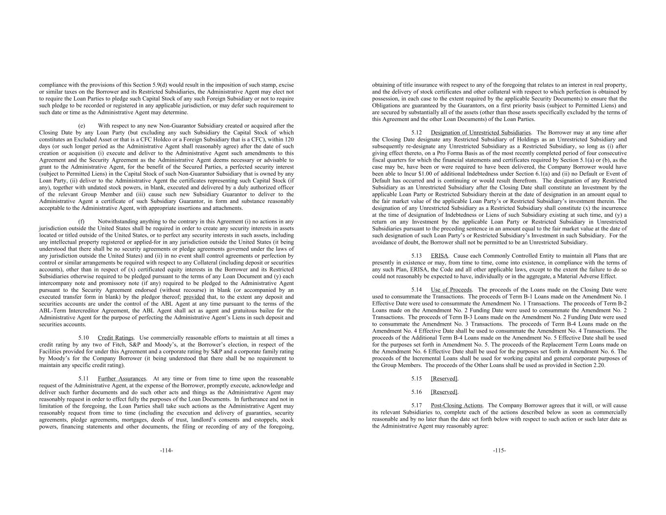 compliance with the provisions of this Section 5.9(d) would result in the imposition of such stamp, excise or similar taxes on the Borrower and its Restricted Subsidiaries, the Administrative Agent may elect not to require the Loan Parties to pledge such Capital Stock of any such Foreign Subsidiary or not to require such pledge to be recorded or registered in any applicable jurisdiction, or may defer such requirement to such date or time as the Administrative Agent may determine. With respect to any new Non-Guarantor Subsidiary created or acquired after the(e) Closing Date by any Loan Party (but excluding any such Subsidiary the Capital Stock of which constitutes an Excluded Asset or that is a CFC Holdco or a Foreign Subsidiary that is a CFC), within 120 days (or such longer period as the Administrative Agent shall reasonably agree) after the date of such creation or acquisition (i) execute and deliver to the Administrative Agent such amendments to this Agreement and the Security Agreement as the Administrative Agent deems necessary or advisable to grant to the Administrative Agent, for the benefit of the Secured Parties, a perfected security interest (subject to Permitted Liens) in the Capital Stock of such Non-Guarantor Subsidiary that is owned by any Loan Party, (ii) deliver to the Administrative Agent the certificates representing such Capital Stock (if any), together with undated stock powers, in blank, executed and delivered by a duly authorized officer of the relevant Group Member and (iii) cause such new Subsidiary Guarantor to deliver to the Administrative Agent a certificate of such Subsidiary Guarantor, in form and substance reasonably acceptable to the Administrative Agent, with appropriate insertions and attachments. Notwithstanding anything to the contrary in this Agreement (i) no actions in any(f) jurisdiction outside the United States shall be required in order to create any security interests in assets located or titled outside of the United States, or to perfect any security interests in such assets, including any intellectual property registered or applied-for in any jurisdiction outside the United States (it being understood that there shall be no security agreements or pledge agreements governed under the laws of any jurisdiction outside the United States) and (ii) in no event shall control agreements or perfection by control or similar arrangements be required with respect to any Collateral (including deposit or securities accounts), other than in respect of (x) certificated equity interests in the Borrower and its Restricted Subsidiaries otherwise required to be pledged pursuant to the terms of any Loan Document and (y) each intercompany note and promissory note (if any) required to be pledged to the Administrative Agent pursuant to the Security Agreement endorsed (without recourse) in blank (or accompanied by an executed transfer form in blank) by the pledgor thereof; provided that, to the extent any deposit and securities accounts are under the control of the ABL Agent at any time pursuant to the terms of the ABL-Term Intercreditor Agreement, the ABL Agent shall act as agent and gratuitous bailee for the Administrative Agent for the purpose of perfecting the Administrative Agent’s Liens in such deposit and securities accounts. Credit Ratings. Use commercially reasonable efforts to maintain at all times a5.10 credit rating by any two of Fitch, S&P and Moody’s, at the Borrower’s election, in respect of the Facilities provided for under this Agreement and a corporate rating by S&P and a corporate family rating by Moody’s for the Company Borrower (it being understood that there shall be no requirement to maintain any specific credit rating). Further Assurances. At any time or from time to time upon the reasonable5.11 request of the Administrative Agent, at the expense of the Borrower, promptly execute, acknowledge and deliver such further documents and do such other acts and things as the Administrative Agent may reasonably request in order to effect fully the purposes of the Loan Documents. In furtherance and not in limitation of the foregoing, the Loan Parties shall take such actions as the Administrative Agent may reasonably request from time to time (including the execution and delivery of guaranties, security agreements, pledge agreements, mortgages, deeds of trust, landlord’s consents and estoppels, stock powers, financing statements and other documents, the filing or recording of any of the foregoing, -114- obtaining of title insurance with respect to any of the foregoing that relates to an interest in real property, and the delivery of stock certificates and other collateral with respect to which perfection is obtained by possession, in each case to the extent required by the applicable Security Documents) to ensure that the Obligations are guaranteed by the Guarantors, on a first priority basis (subject to Permitted Liens) and are secured by substantially all of the assets (other than those assets specifically excluded by the terms of this Agreement and the other Loan Documents) of the Loan Parties. Designation of Unrestricted Subsidiaries. The Borrower may at any time after5.12 the Closing Date designate any Restricted Subsidiary of Holdings as an Unrestricted Subsidiary and subsequently re-designate any Unrestricted Subsidiary as a Restricted Subsidiary, so long as (i) after giving effect thereto, on a Pro Forma Basis as of the most recently completed period of four consecutive fiscal quarters for which the financial statements and certificates required by Section 5.1(a) or (b), as the case may be, have been or were required to have been delivered, the Company Borrower would have been able to Incur $1.00 of additional Indebtedness under Section 6.1(a) and (ii) no Default or Event of Default has occurred and is continuing or would result therefrom. The designation of any Restricted Subsidiary as an Unrestricted Subsidiary after the Closing Date sh