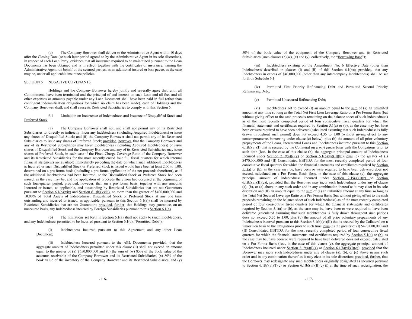 The Company Borrower shall deliver to the Administrative Agent within 10 days(a) after the Closing Date (or such later period agreed to by the Administrative Agent in its sole discretion), in respect of each Loan Party, evidence that all insurance required to be maintained pursuant to the Loan Documents has been obtained and is in effect, together with the certificates of insurance, naming the Administrative Agent, on behalf of the secured parties, as an additional insured or loss payee, as the case may be, under all applicable insurance policies. NEGATIVE COVENANTSSECTION 6 Holdings and the Company Borrower hereby jointly and severally agree that, until all Commitments have been terminated and the principal of and interest on each Loan and all fees and all other expenses or amounts payable under any Loan Document shall have been paid in full (other than contingent indemnification obligations for which no claim has been made), each of Holdings and the Company Borrower shall, and shall cause its Restricted Subsidiaries to comply with this Section 6. Limitation on Incurrence of Indebtedness and Issuance of Disqualified Stock and6.1 Preferred Stock. The Company Borrower shall not, and shall not permit any of its Restricted(a) Subsidiaries to, directly or indirectly, Incur any Indebtedness (including Acquired Indebtedness) or issue any shares of Disqualified Stock; and (ii) the Company Borrower shall not permit any of its Restricted Subsidiaries to issue any shares of Preferred Stock; provided, however, that the Company Borrower and any of its Restricted Subsidiaries may Incur Indebtedness (including Acquired Indebtedness) or issue shares of Disqualified Stock and the Company Borrower and any of its Restricted Subsidiaries may issue shares of Preferred Stock, in each case if the Fixed Charge Coverage Ratio of the Company Borrower and its Restricted Subsidiaries for the most recently ended four full fiscal quarters for which internal financial statements are available immediately preceding the date on which such additional Indebtedness is Incurred or such Disqualified Stock or Preferred Stock is issued would have been at least 2.00 to 1.00, determined on a pro forma basis (including a pro forma application of the net proceeds therefrom), as if the additional Indebtedness had been Incurred, or the Disqualified Stock or Preferred Stock had been issued, as the case may be, and the application of proceeds therefrom had occurred at the beginning of such four-quarter period; provided, however, that, on a pro forma basis, together with any amounts Incurred or issued, as applicable, and outstanding by Restricted Subsidiaries that are not Guarantors pursuant to Section 6.1(b)(xiv) and Section 6.1(b)(xxiii), no more than the greater of $400,000,000 and 10.00% of Total Assets of Indebtedness, Disqualified Stock or Preferred Stock at any one time outstanding and incurred or issued, as applicable, pursuant to this Section 6.1(a)) shall be incurred by Restricted Subsidiaries that are not Guarantors; provided, further, that Holdings may guarantee, on an unsecured basis, any Indebtedness incurred by Foreign Subsidiaries pursuant to this Section 6.1(a). The limitations set forth in Section 6.1(a) shall not apply to (such Indebtedness,(b) and any Indebtedness permitted to be Incurred pursuant to Section 6.1(a), “Permitted Debt”): Indebtedness Incurred pursuant to this Agreement and any other Loan(i) Document; Indebtedness Incurred pursuant to the ABL Documents; provided, that the(ii) aggregate amount of Indebtedness permitted under this clause (ii) shall not exceed an amount equal to the greater of (a) $650,000,000 and (b) the sum of (w) 85% of the book value of the accounts receivable of the Company Borrower and its Restricted Subsidiaries, (x) 80% of the book value of the inventory of the Company Borrower and its Restricted Subsidiaries, and (y) -116- 50% of the book value of the equipment of the Company Borrower and its Restricted Subsidiaries (such clauses (b)(w), (x) and (y), collectively, the “Borrowing Base”); Indebtedness existing on the Amendment No. 6 Effective Date (other than(iii) Indebtedness described in clauses (i) and (ii) of this Section 6.1(b)); provided, that any Indebtedness in excess of $40,000,000 (other than any intercompany Indebtedness) shall be set forth on Schedule 6.1; Permitted First Priority Refinancing Debt and Permitted Second Priority(iv) Refinancing Debt; Permitted Unsecured Refinancing Debt;(v) Indebtedness not to exceed (I) an amount equal to the sum of (a) an unlimited(vi) amount at any time so long as the Total Net First Lien Leverage Ratio on a Pro Forma Basis (but without giving effect to the cash proceeds remaining on the balance sheet of such Indebtedness) as of the most recently completed period of four consecutive fiscal quarters for which the financial statements and certificates required by Section 5.1(a) or (b), as the case may be, have been or were required to have been delivered (calculated assuming that such Indebtedness is fully drawn throughout such period) does not exceed 4.35 to 1.00 (without giving effect to any contemporaneous borrowing under clause (c) below), plus (b) the amount of all prior voluntary prepayments of the Loans, Incremental Loans and Indebtedness incurred pursuant to this Section 6.1(b)(vi)(I) that is secured by the Collateral on a pari passu basis with the Obligations prior to such time (less, in the case of this clause (b), the aggregate principal amount of Indebtedness Incurred under Section 2.19(a)(i)(y) or Section 6.1(b)(vi)(II)(b)), plus (c) the greater of (I) $470,000,000 and (II) Consolidated EBITDA for the most recently completed period of four consecutive fiscal quarters for which the financial statements and certificates required by Section 5.1(a) or (b), as the case may be, have been or were required to have been delivered does not exceed, calculated on a Pro Forma Basis (less, in the case of this clause (c), the aggre