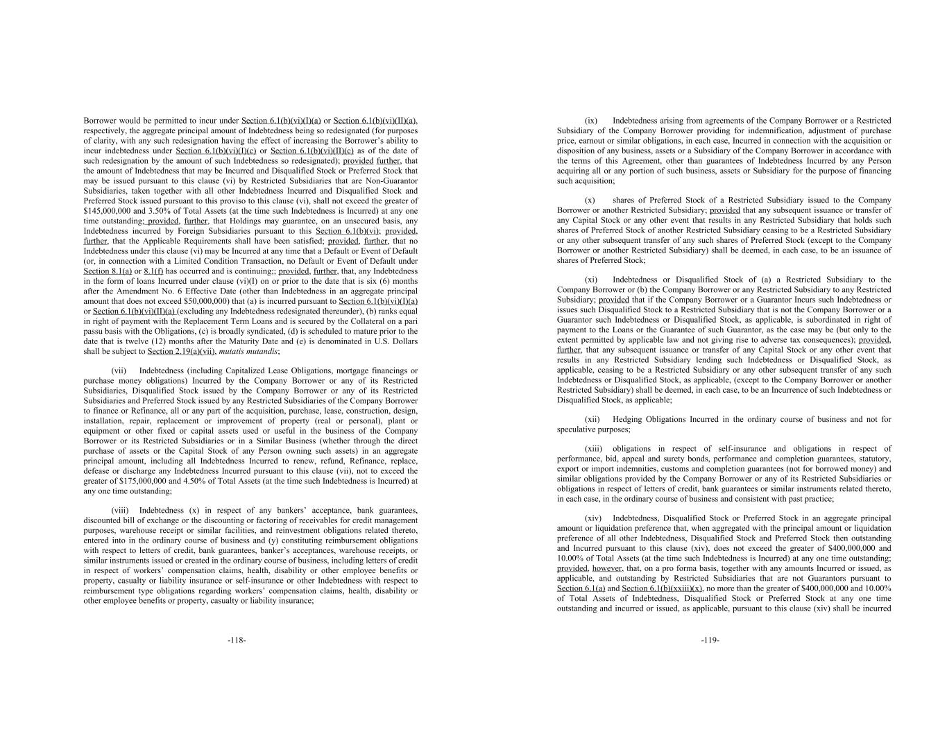 Borrower would be permitted to incur under Section 6.1(b)(vi)(I)(a) or Section 6.1(b)(vi)(II)(a), respectively, the aggregate principal amount of Indebtedness being so redesignated (for purposes of clarity, with any such redesignation having the effect of increasing the Borrower’s ability to incur indebtedness under Section 6.1(b)(vi)(I)(c) or Section 6.1(b)(vi)(II)(c) as of the date of such redesignation by the amount of such Indebtedness so redesignated); provided further, that the amount of Indebtedness that may be Incurred and Disqualified Stock or Preferred Stock that may be issued pursuant to this clause (vi) by Restricted Subsidiaries that are Non-Guarantor Subsidiaries, taken together with all other Indebtedness Incurred and Disqualified Stock and Preferred Stock issued pursuant to this proviso to this clause (vi), shall not exceed the greater of $145,000,000 and 3.50% of Total Assets (at the time such Indebtedness is Incurred) at any one time outstanding; provided, further, that Holdings may guarantee, on an unsecured basis, any Indebtedness incurred by Foreign Subsidiaries pursuant to this Section 6.1(b)(vi); provided, further, that the Applicable Requirements shall have been satisfied; provided, further, that no Indebtedness under this clause (vi) may be Incurred at any time that a Default or Event of Default (or, in connection with a Limited Condition Transaction, no Default or Event of Default under Section 8.1(a) or 8.1(f) has occurred and is continuing;; provided, further, that, any Indebtedness in the form of loans Incurred under clause (vi)(I) on or prior to the date that is six (6) months after the Amendment No. 6 Effective Date (other than Indebtedness in an aggregate principal amount that does not exceed $50,000,000) that (a) is incurred pursuant to Section 6.1(b)(vi)(I)(a) or Section 6.1(b)(vi)(II)(a) (excluding any Indebtedness redesignated thereunder), (b) ranks equal in right of payment with the Replacement Term Loans and is secured by the Collateral on a pari passu basis with the Obligations, (c) is broadly syndicated, (d) is scheduled to mature prior to the date that is twelve (12) months after the Maturity Date and (e) is denominated in U.S. Dollars shall be subject to Section 2.19(a)(vii), mutatis mutandis; Indebtedness (including Capitalized Lease Obligations, mortgage financings or(vii) purchase money obligations) Incurred by the Company Borrower or any of its Restricted Subsidiaries, Disqualified Stock issued by the Company Borrower or any of its Restricted Subsidiaries and Preferred Stock issued by any Restricted Subsidiaries of the Company Borrower to finance or Refinance, all or any part of the acquisition, purchase, lease, construction, design, installation, repair, replacement or improvement of property (real or personal), plant or equipment or other fixed or capital assets used or useful in the business of the Company Borrower or its Restricted Subsidiaries or in a Similar Business (whether through the direct purchase of assets or the Capital Stock of any Person owning such assets) in an aggregate principal amount, including all Indebtedness Incurred to renew, refund, Refinance, replace, defease or discharge any Indebtedness Incurred pursuant to this clause (vii), not to exceed the greater of $175,000,000 and 4.50% of Total Assets (at the time such Indebtedness is Incurred) at any one time outstanding; Indebtedness (x) in respect of any bankers’ acceptance, bank guarantees,(viii) discounted bill of exchange or the discounting or factoring of receivables for credit management purposes, warehouse receipt or similar facilities, and reinvestment obligations related thereto, entered into in the ordinary course of business and (y) constituting reimbursement obligations with respect to letters of credit, bank guarantees, banker’s acceptances, warehouse receipts, or similar instruments issued or created in the ordinary course of business, including letters of credit in respect of workers’ compensation claims, health, disability or other employee benefits or property, casualty or liability insurance or self-insurance or other Indebtedness with respect to reimbursement type obligations regarding workers’ compensation claims, health, disability or other employee benefits or property, casualty or liability insurance; -118- Indebtedness arising from agreements of the Company Borrower or a Restricted(ix) Subsidiary of the Company Borrower providing for indemnification, adjustment of purchase price, earnout or similar obligations, in each case, Incurred in connection with the acquisition or disposition of any business, assets or a Subsidiary of the Company Borrower in accordance with the terms of this Agreement, other than guarantees of Indebtedness Incurred by any Person acquiring all or any portion of such business, assets or Subsidiary for the purpose of financing such acquisition; shares of Preferred Stock of a Restricted Subsidiary issued to the Company(x) Borrower or another Restricted Subsidiary; provided that any subsequent issuance or transfer of any Capital Stock or any other event that results in any Restricted Subsidiary that holds such shares of Preferred Stock of another Restricted Subsidiary ceasing to be a Restricted Subsidiary or any other subsequent transfer of any such shares of Preferred Stock (except to the Company Borrower or another Restricted Subsidiary) shall be deemed, in each case, to be an issuance of shares of Preferred Stock; Indebtedness or Disqualified Stock of (a) a Restricted Subsidiary to the(xi) Company Borrower or (b) the Company Borrower or any Restricted Subsidiary to any Restricted Subsidiary; provided that if the Company Borrower or a Guarantor Incurs such Indebtedness or issues such Disqualified Stock to a Restricted Subsidiary that is not the Company Borrower or a Guarantor such Indebtedness or Disqualified Stock, as applicable, is subordinated in right of payment to the Loans or the Guarantee of such Guarantor, a