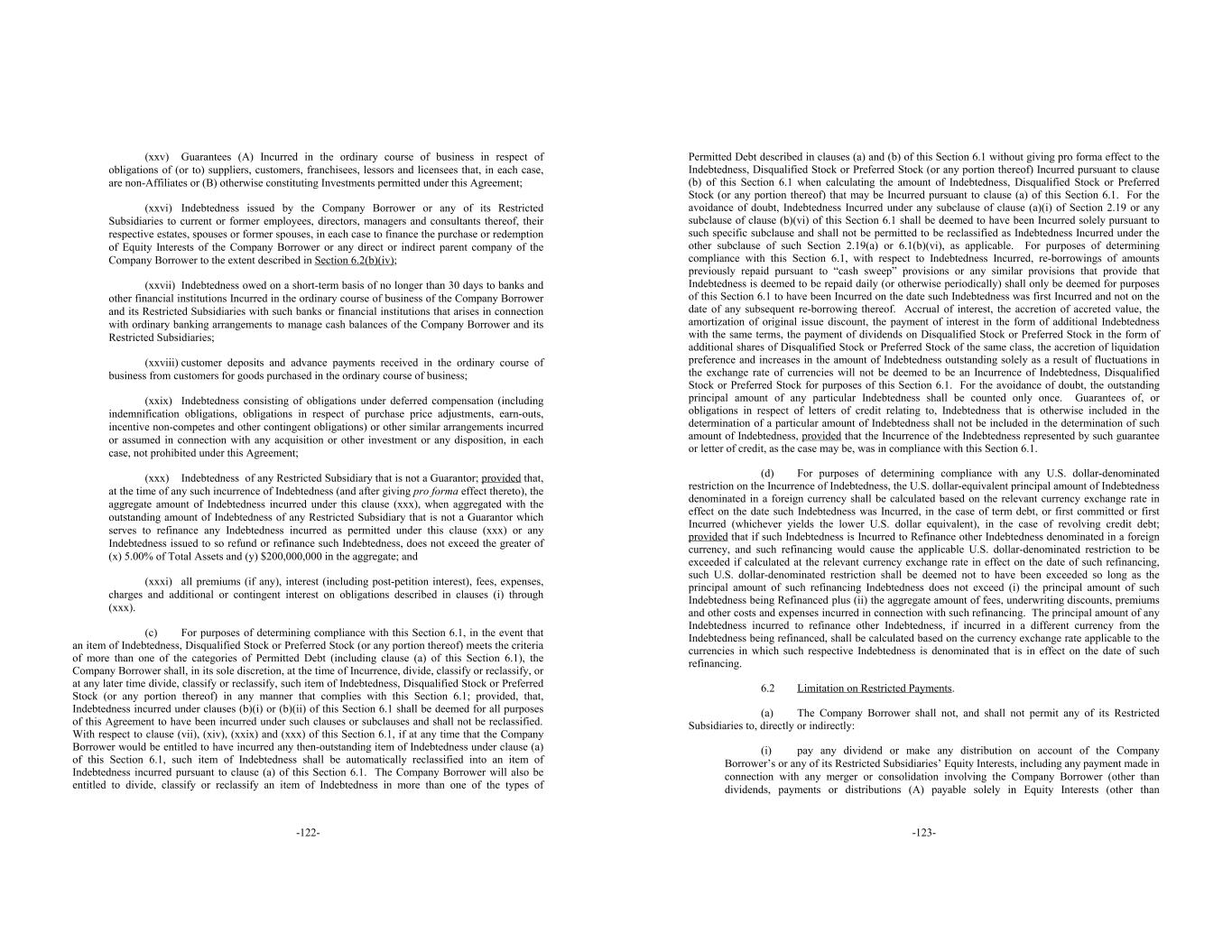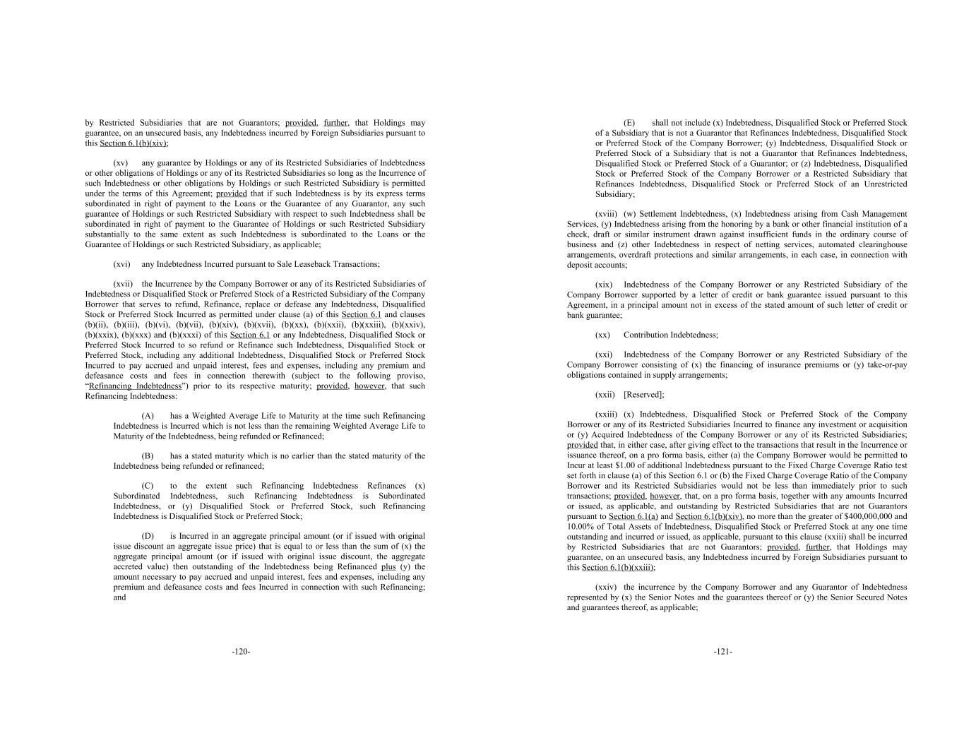 by Restricted Subsidiaries that are not Guarantors; provided, further, that Holdings may guarantee, on an unsecured basis, any Indebtedness incurred by Foreign Subsidiaries pursuant to this Section 6.1(b)(xiv); any guarantee by Holdings or any of its Restricted Subsidiaries of Indebtedness(xv) or other obligations of Holdings or any of its Restricted Subsidiaries so long as the Incurrence of such Indebtedness or other obligations by Holdings or such Restricted Subsidiary is permitted under the terms of this Agreement; provided that if such Indebtedness is by its express terms subordinated in right of payment to the Loans or the Guarantee of any Guarantor, any such guarantee of Holdings or such Restricted Subsidiary with respect to such Indebtedness shall be subordinated in right of payment to the Guarantee of Holdings or such Restricted Subsidiary substantially to the same extent as such Indebtedness is subordinated to the Loans or the Guarantee of Holdings or such Restricted Subsidiary, as applicable; any Indebtedness Incurred pursuant to Sale Leaseback Transactions;(xvi) the Incurrence by the Company Borrower or any of its Restricted Subsidiaries of(xvii) Indebtedness or Disqualified Stock or Preferred Stock of a Restricted Subsidiary of the Company Borrower that serves to refund, Refinance, replace or defease any Indebtedness, Disqualified Stock or Preferred Stock Incurred as permitted under clause (a) of this Section 6.1 and clauses (b)(ii), (b)(iii), (b)(vi), (b)(vii), (b)(xiv), (b)(xvii), (b)(xx), (b)(xxii), (b)(xxiii), (b)(xxiv), (b)(xxix), (b)(xxx) and (b)(xxxi) of this Section 6.1 or any Indebtedness, Disqualified Stock or Preferred Stock Incurred to so refund or Refinance such Indebtedness, Disqualified Stock or Preferred Stock, including any additional Indebtedness, Disqualified Stock or Preferred Stock Incurred to pay accrued and unpaid interest, fees and expenses, including any premium and defeasance costs and fees in connection therewith (subject to the following proviso, “Refinancing Indebtedness”) prior to its respective maturity; provided, however, that such Refinancing Indebtedness: has a Weighted Average Life to Maturity at the time such Refinancing(A) Indebtedness is Incurred which is not less than the remaining Weighted Average Life to Maturity of the Indebtedness, being refunded or Refinanced; has a stated maturity which is no earlier than the stated maturity of the(B) Indebtedness being refunded or refinanced; to the extent such Refinancing Indebtedness Refinances (x)(C) Subordinated Indebtedness, such Refinancing Indebtedness is Subordinated Indebtedness, or (y) Disqualified Stock or Preferred Stock, such Refinancing Indebtedness is Disqualified Stock or Preferred Stock; is Incurred in an aggregate principal amount (or if issued with original(D) issue discount an aggregate issue price) that is equal to or less than the sum of (x) the aggregate principal amount (or if issued with original issue discount, the aggregate accreted value) then outstanding of the Indebtedness being Refinanced plus (y) the amount necessary to pay accrued and unpaid interest, fees and expenses, including any premium and defeasance costs and fees Incurred in connection with such Refinancing; and -120- shall not include (x) Indebtedness, Disqualified Stock or Preferred Stock(E) of a Subsidiary that is not a Guarantor that Refinances Indebtedness, Disqualified Stock or Preferred Stock of the Company Borrower; (y) Indebtedness, Disqualified Stock or Preferred Stock of a Subsidiary that is not a Guarantor that Refinances Indebtedness, Disqualified Stock or Preferred Stock of a Guarantor; or (z) Indebtedness, Disqualified Stock or Preferred Stock of the Company Borrower or a Restricted Subsidiary that Refinances Indebtedness, Disqualified Stock or Preferred Stock of an Unrestricted Subsidiary; (w) Settlement Indebtedness, (x) Indebtedness arising from Cash Management(xviii) Services, (y) Indebtedness arising from the honoring by a bank or other financial institution of a check, draft or similar instrument drawn against insufficient funds in the ordinary course of business and (z) other Indebtedness in respect of netting services, automated clearinghouse arrangements, overdraft protections and similar arrangements, in each case, in connection with deposit accounts; Indebtedness of the Company Borrower or any Restricted Subsidiary of the(xix) Company Borrower supported by a letter of credit or bank guarantee issued pursuant to this Agreement, in a principal amount not in excess of the stated amount of such letter of credit or bank guarantee; Contribution Indebtedness;(xx) Indebtedness of the Company Borrower or any Restricted Subsidiary of the(xxi) Company Borrower consisting of (x) the financing of insurance premiums or (y) take-or-pay obligations contained in supply arrangements; [Reserved];(xxii) (x) Indebtedness, Disqualified Stock or Preferred Stock of the Company(xxiii) Borrower or any of its Restricted Subsidiaries Incurred to finance any investment or acquisition or (y) Acquired Indebtedness of the Company Borrower or any of its Restricted Subsidiaries; provided that, in either case, after giving effect to the transactions that result in the Incurrence or issuance thereof, on a pro forma basis, either (a) the Company Borrower would be permitted to Incur at least $1.00 of additional Indebtedness pursuant to the Fixed Charge Coverage Ratio test set forth in clause (a) of this Section 6.1 or (b) the Fixed Charge Coverage Ratio of the Company Borrower and its Restricted Subsidiaries would not be less than immediately prior to such transactions; provided, however, that, on a pro forma basis, together with any amounts Incurred or issued, as applicable, and outstanding by Restricted Subsidiaries that are not Guarantors pursuant to Section 6.1(a) and Section 6.1(b)(xiv), no more than the greater of $400,000,000 and 10.00% of Total Assets of Indebtedness, Disqualified Stock or Preferred Stock a