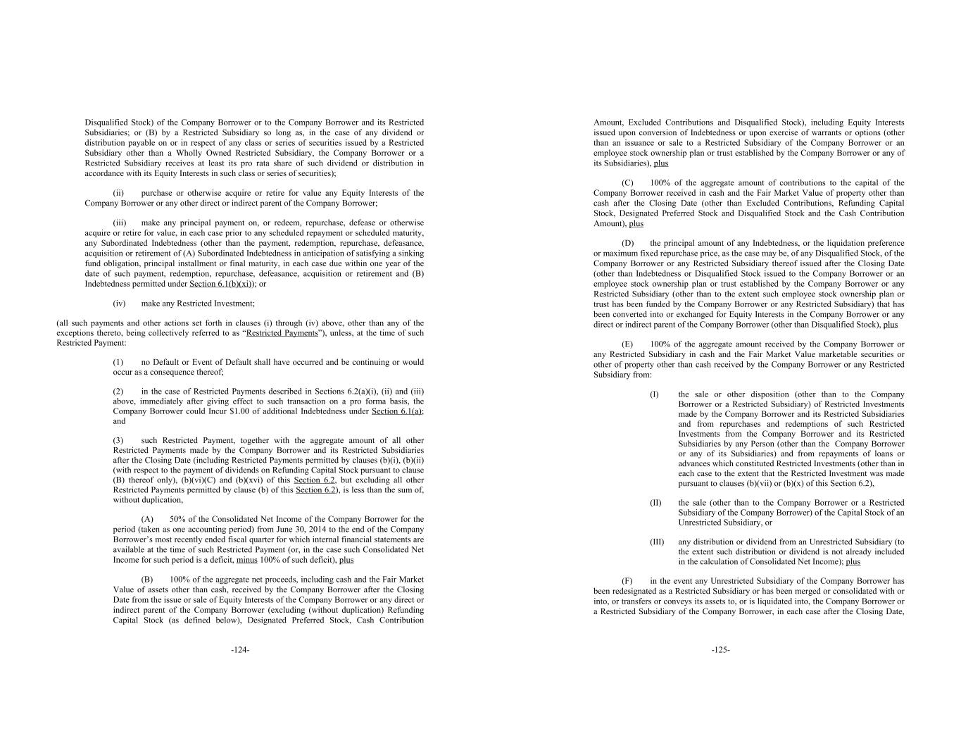 Disqualified Stock) of the Company Borrower or to the Company Borrower and its Restricted Subsidiaries; or (B) by a Restricted Subsidiary so long as, in the case of any dividend or distribution payable on or in respect of any class or series of securities issued by a Restricted Subsidiary other than a Wholly Owned Restricted Subsidiary, the Company Borrower or a Restricted Subsidiary receives at least its pro rata share of such dividend or distribution in accordance with its Equity Interests in such class or series of securities); purchase or otherwise acquire or retire for value any Equity Interests of the(ii) Company Borrower or any other direct or indirect parent of the Company Borrower; make any principal payment on, or redeem, repurchase, defease or otherwise(iii) acquire or retire for value, in each case prior to any scheduled repayment or scheduled maturity, any Subordinated Indebtedness (other than the payment, redemption, repurchase, defeasance, acquisition or retirement of (A) Subordinated Indebtedness in anticipation of satisfying a sinking fund obligation, principal installment or final maturity, in each case due within one year of the date of such payment, redemption, repurchase, defeasance, acquisition or retirement and (B) Indebtedness permitted under Section 6.1(b)(xi)); or make any Restricted Investment;(iv) (all such payments and other actions set forth in clauses (i) through (iv) above, other than any of the exceptions thereto, being collectively referred to as “Restricted Payments”), unless, at the time of such Restricted Payment: (1) no Default or Event of Default shall have occurred and be continuing or would occur as a consequence thereof; (2) in the case of Restricted Payments described in Sections 6.2(a)(i), (ii) and (iii) above, immediately after giving effect to such transaction on a pro forma basis, the Company Borrower could Incur $1.00 of additional Indebtedness under Section 6.1(a); and (3) such Restricted Payment, together with the aggregate amount of all other Restricted Payments made by the Company Borrower and its Restricted Subsidiaries after the Closing Date (including Restricted Payments permitted by clauses (b)(i), (b)(ii) (with respect to the payment of dividends on Refunding Capital Stock pursuant to clause (B) thereof only), (b)(vi)(C) and (b)(xvi) of this Section 6.2, but excluding all other Restricted Payments permitted by clause (b) of this Section 6.2), is less than the sum of, without duplication, 50% of the Consolidated Net Income of the Company Borrower for the(A) period (taken as one accounting period) from June 30, 2014 to the end of the Company Borrower’s most recently ended fiscal quarter for which internal financial statements are available at the time of such Restricted Payment (or, in the case such Consolidated Net Income for such period is a deficit, minus 100% of such deficit), plus 100% of the aggregate net proceeds, including cash and the Fair Market(B) Value of assets other than cash, received by the Company Borrower after the Closing Date from the issue or sale of Equity Interests of the Company Borrower or any direct or indirect parent of the Company Borrower (excluding (without duplication) Refunding Capital Stock (as defined below), Designated Preferred Stock, Cash Contribution -124- Amount, Excluded Contributions and Disqualified Stock), including Equity Interests issued upon conversion of Indebtedness or upon exercise of warrants or options (other than an issuance or sale to a Restricted Subsidiary of the Company Borrower or an employee stock ownership plan or trust established by the Company Borrower or any of its Subsidiaries), plus 100% of the aggregate amount of contributions to the capital of the(C) Company Borrower received in cash and the Fair Market Value of property other than cash after the Closing Date (other than Excluded Contributions, Refunding Capital Stock, Designated Preferred Stock and Disqualified Stock and the Cash Contribution Amount), plus the principal amount of any Indebtedness, or the liquidation preference(D) or maximum fixed repurchase price, as the case may be, of any Disqualified Stock, of the Company Borrower or any Restricted Subsidiary thereof issued after the Closing Date (other than Indebtedness or Disqualified Stock issued to the Company Borrower or an employee stock ownership plan or trust established by the Company Borrower or any Restricted Subsidiary (other than to the extent such employee stock ownership plan or trust has been funded by the Company Borrower or any Restricted Subsidiary) that has been converted into or exchanged for Equity Interests in the Company Borrower or any direct or indirect parent of the Company Borrower (other than Disqualified Stock), plus 100% of the aggregate amount received by the Company Borrower or(E) any Restricted Subsidiary in cash and the Fair Market Value marketable securities or other of property other than cash received by the Company Borrower or any Restricted Subsidiary from: the sale or other disposition (other than to the Company(I) Borrower or a Restricted Subsidiary) of Restricted Investments made by the Company Borrower and its Restricted Subsidiaries and from repurchases and redemptions of such Restricted Investments from the Company Borrower and its Restricted Subsidiaries by any Person (other than the Company Borrower or any of its Subsidiaries) and from repayments of loans or advances which constituted Restricted Investments (other than in each case to the extent that the Restricted Investment was made pursuant to clauses (b)(vii) or (b)(x) of this Section 6.2), the sale (other than to the Company Borrower or a Restricted(II) Subsidiary of the Company Borrower) of the Capital Stock of an Unrestricted Subsidiary, or any distribution or dividend from an Unrestricted Subsidiary (to(III) the extent such distribution or dividend is not already included in the calculation of Consolidated Net Income); plus in the event any Unrestricted