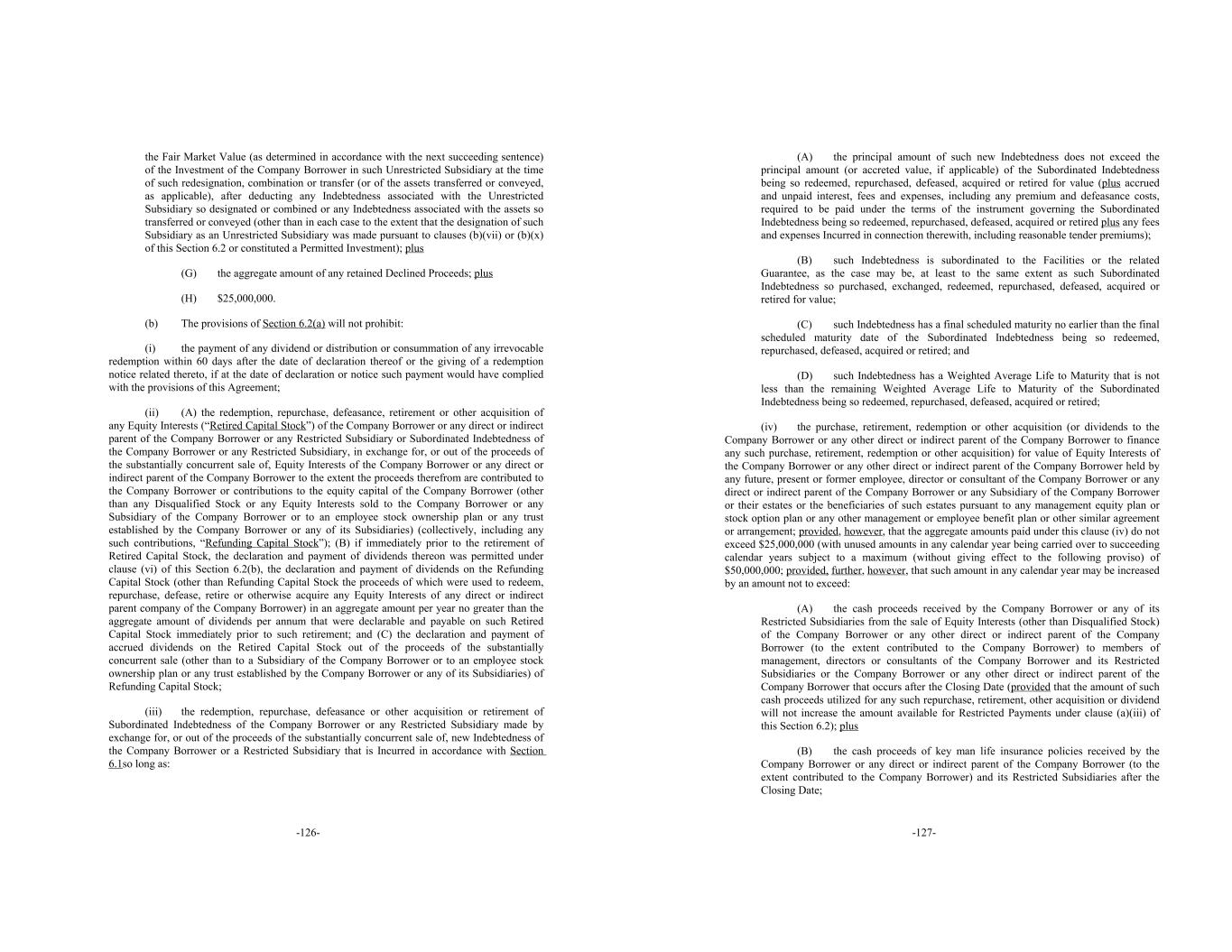 the Fair Market Value (as determined in accordance with the next succeeding sentence) of the Investment of the Company Borrower in such Unrestricted Subsidiary at the time of such redesignation, combination or transfer (or of the assets transferred or conveyed, as applicable), after deducting any Indebtedness associated with the Unrestricted Subsidiary so designated or combined or any Indebtedness associated with the assets so transferred or conveyed (other than in each case to the extent that the designation of such Subsidiary as an Unrestricted Subsidiary was made pursuant to clauses (b)(vii) or (b)(x) of this Section 6.2 or constituted a Permitted Investment); plus the aggregate amount of any retained Declined Proceeds; plus(G) $25,000,000.(H) The provisions of Section 6.2(a) will not prohibit:(b) the payment of any dividend or distribution or consummation of any irrevocable(i) redemption within 60 days after the date of declaration thereof or the giving of a redemption notice related thereto, if at the date of declaration or notice such payment would have complied with the provisions of this Agreement; (A) the redemption, repurchase, defeasance, retirement or other acquisition of(ii) any Equity Interests (“Retired Capital Stock”) of the Company Borrower or any direct or indirect parent of the Company Borrower or any Restricted Subsidiary or Subordinated Indebtedness of the Company Borrower or any Restricted Subsidiary, in exchange for, or out of the proceeds of the substantially concurrent sale of, Equity Interests of the Company Borrower or any direct or indirect parent of the Company Borrower to the extent the proceeds therefrom are contributed to the Company Borrower or contributions to the equity capital of the Company Borrower (other than any Disqualified Stock or any Equity Interests sold to the Company Borrower or any Subsidiary of the Company Borrower or to an employee stock ownership plan or any trust established by the Company Borrower or any of its Subsidiaries) (collectively, including any such contributions, “Refunding Capital Stock”); (B) if immediately prior to the retirement of Retired Capital Stock, the declaration and payment of dividends thereon was permitted under clause (vi) of this Section 6.2(b), the declaration and payment of dividends on the Refunding Capital Stock (other than Refunding Capital Stock the proceeds of which were used to redeem, repurchase, defease, retire or otherwise acquire any Equity Interests of any direct or indirect parent company of the Company Borrower) in an aggregate amount per year no greater than the aggregate amount of dividends per annum that were declarable and payable on such Retired Capital Stock immediately prior to such retirement; and (C) the declaration and payment of accrued dividends on the Retired Capital Stock out of the proceeds of the substantially concurrent sale (other than to a Subsidiary of the Company Borrower or to an employee stock ownership plan or any trust established by the Company Borrower or any of its Subsidiaries) of Refunding Capital Stock; the redemption, repurchase, defeasance or other acquisition or retirement of(iii) Subordinated Indebtedness of the Company Borrower or any Restricted Subsidiary made by exchange for, or out of the proceeds of the substantially concurrent sale of, new Indebtedness of the Company Borrower or a Restricted Subsidiary that is Incurred in accordance with Section 6.1so long as: -126- the principal amount of such new Indebtedness does not exceed the(A) principal amount (or accreted value, if applicable) of the Subordinated Indebtedness being so redeemed, repurchased, defeased, acquired or retired for value (plus accrued and unpaid interest, fees and expenses, including any premium and defeasance costs, required to be paid under the terms of the instrument governing the Subordinated Indebtedness being so redeemed, repurchased, defeased, acquired or retired plus any fees and expenses Incurred in connection therewith, including reasonable tender premiums); such Indebtedness is subordinated to the Facilities or the related(B) Guarantee, as the case may be, at least to the same extent as such Subordinated Indebtedness so purchased, exchanged, redeemed, repurchased, defeased, acquired or retired for value; such Indebtedness has a final scheduled maturity no earlier than the final(C) scheduled maturity date of the Subordinated Indebtedness being so redeemed, repurchased, defeased, acquired or retired; and such Indebtedness has a Weighted Average Life to Maturity that is not(D) less than the remaining Weighted Average Life to Maturity of the Subordinated Indebtedness being so redeemed, repurchased, defeased, acquired or retired; the purchase, retirement, redemption or other acquisition (or dividends to the(iv) Company Borrower or any other direct or indirect parent of the Company Borrower to finance any such purchase, retirement, redemption or other acquisition) for value of Equity Interests of the Company Borrower or any other direct or indirect parent of the Company Borrower held by any future, present or former employee, director or consultant of the Company Borrower or any direct or indirect parent of the Company Borrower or any Subsidiary of the Company Borrower or their estates or the beneficiaries of such estates pursuant to any management equity plan or stock option plan or any other management or employee benefit plan or other similar agreement or arrangement; provided, however, that the aggregate amounts paid under this clause (iv) do not exceed $25,000,000 (with unused amounts in any calendar year being carried over to succeeding calendar years subject to a maximum (without giving effect to the following proviso) of $50,000,000; provided, further, however, that such amount in any calendar year may be increased by an amount not to exceed: the cash proceeds received by the Company Borrower or any of its(A) Restricted Subsidiaries from the sale of Equity Interests (