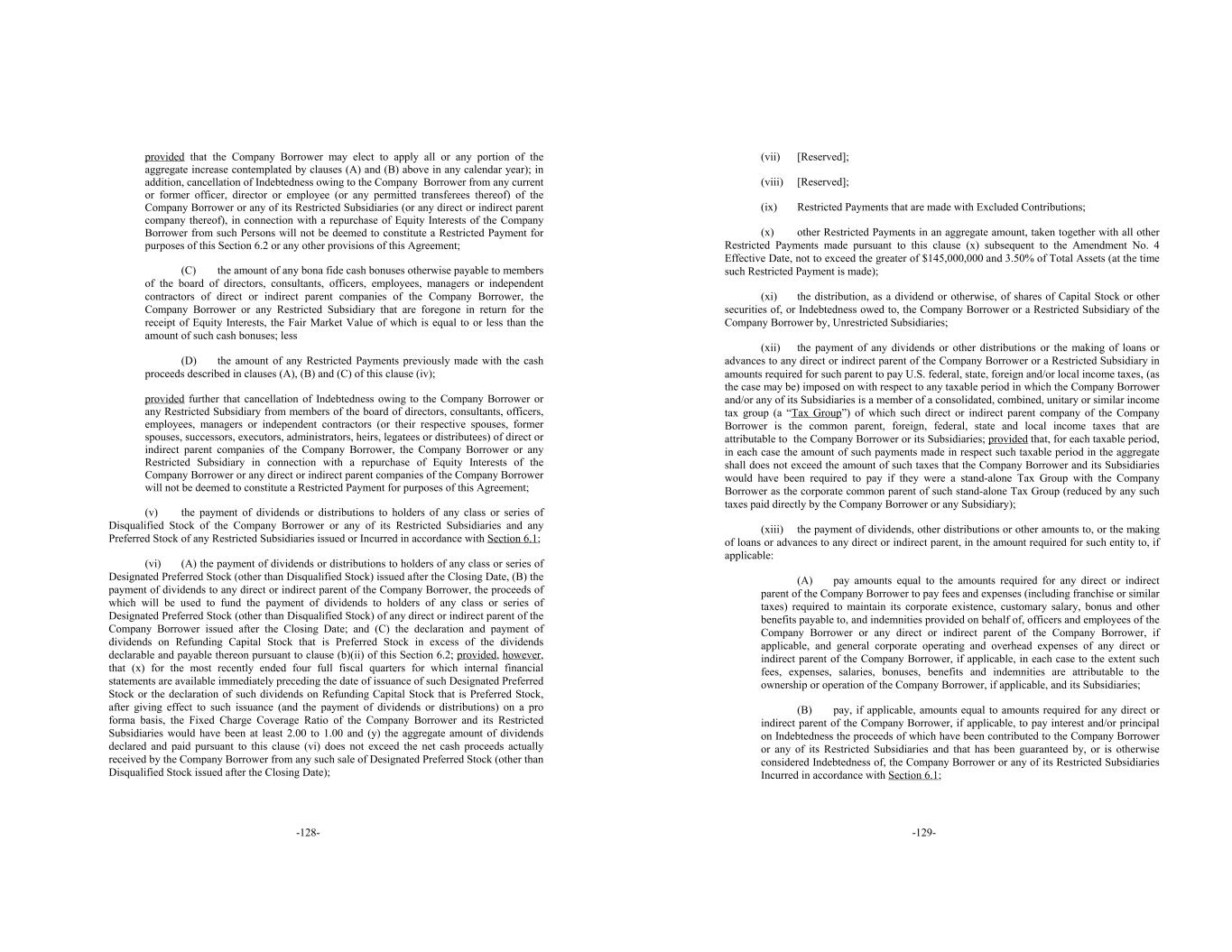 provided that the Company Borrower may elect to apply all or any portion of the aggregate increase contemplated by clauses (A) and (B) above in any calendar year); in addition, cancellation of Indebtedness owing to the Company Borrower from any current or former officer, director or employee (or any permitted transferees thereof) of the Company Borrower or any of its Restricted Subsidiaries (or any direct or indirect parent company thereof), in connection with a repurchase of Equity Interests of the Company Borrower from such Persons will not be deemed to constitute a Restricted Payment for purposes of this Section 6.2 or any other provisions of this Agreement; the amount of any bona fide cash bonuses otherwise payable to members(C) of the board of directors, consultants, officers, employees, managers or independent contractors of direct or indirect parent companies of the Company Borrower, the Company Borrower or any Restricted Subsidiary that are foregone in return for the receipt of Equity Interests, the Fair Market Value of which is equal to or less than the amount of such cash bonuses; less the amount of any Restricted Payments previously made with the cash(D) proceeds described in clauses (A), (B) and (C) of this clause (iv); provided further that cancellation of Indebtedness owing to the Company Borrower or any Restricted Subsidiary from members of the board of directors, consultants, officers, employees, managers or independent contractors (or their respective spouses, former spouses, successors, executors, administrators, heirs, legatees or distributees) of direct or indirect parent companies of the Company Borrower, the Company Borrower or any Restricted Subsidiary in connection with a repurchase of Equity Interests of the Company Borrower or any direct or indirect parent companies of the Company Borrower will not be deemed to constitute a Restricted Payment for purposes of this Agreement; the payment of dividends or distributions to holders of any class or series of(v) Disqualified Stock of the Company Borrower or any of its Restricted Subsidiaries and any Preferred Stock of any Restricted Subsidiaries issued or Incurred in accordance with Section 6.1; (A) the payment of dividends or distributions to holders of any class or series of(vi) Designated Preferred Stock (other than Disqualified Stock) issued after the Closing Date, (B) the payment of dividends to any direct or indirect parent of the Company Borrower, the proceeds of which will be used to fund the payment of dividends to holders of any class or series of Designated Preferred Stock (other than Disqualified Stock) of any direct or indirect parent of the Company Borrower issued after the Closing Date; and (C) the declaration and payment of dividends on Refunding Capital Stock that is Preferred Stock in excess of the dividends declarable and payable thereon pursuant to clause (b)(ii) of this Section 6.2; provided, however, that (x) for the most recently ended four full fiscal quarters for which internal financial statements are available immediately preceding the date of issuance of such Designated Preferred Stock or the declaration of such dividends on Refunding Capital Stock that is Preferred Stock, after giving effect to such issuance (and the payment of dividends or distributions) on a pro forma basis, the Fixed Charge Coverage Ratio of the Company Borrower and its Restricted Subsidiaries would have been at least 2.00 to 1.00 and (y) the aggregate amount of dividends declared and paid pursuant to this clause (vi) does not exceed the net cash proceeds actually received by the Company Borrower from any such sale of Designated Preferred Stock (other than Disqualified Stock issued after the Closing Date); -128- [Reserved];(vii) [Reserved];(viii) Restricted Payments that are made with Excluded Contributions;(ix) other Restricted Payments in an aggregate amount, taken together with all other(x) Restricted Payments made pursuant to this clause (x) subsequent to the Amendment No. 4 Effective Date, not to exceed the greater of $145,000,000 and 3.50% of Total Assets (at the time such Restricted Payment is made); the distribution, as a dividend or otherwise, of shares of Capital Stock or other(xi) securities of, or Indebtedness owed to, the Company Borrower or a Restricted Subsidiary of the Company Borrower by, Unrestricted Subsidiaries; the payment of any dividends or other distributions or the making of loans or(xii) advances to any direct or indirect parent of the Company Borrower or a Restricted Subsidiary in amounts required for such parent to pay U.S. federal, state, foreign and/or local income taxes, (as the case may be) imposed on with respect to any taxable period in which the Company Borrower and/or any of its Subsidiaries is a member of a consolidated, combined, unitary or similar income tax group (a “Tax Group”) of which such direct or indirect parent company of the Company Borrower is the common parent, foreign, federal, state and local income taxes that are attributable to the Company Borrower or its Subsidiaries; provided that, for each taxable period, in each case the amount of such payments made in respect such taxable period in the aggregate shall does not exceed the amount of such taxes that the Company Borrower and its Subsidiaries would have been required to pay if they were a stand-alone Tax Group with the Company Borrower as the corporate common parent of such stand-alone Tax Group (reduced by any such taxes paid directly by the Company Borrower or any Subsidiary); the payment of dividends, other distributions or other amounts to, or the making(xiii) of loans or advances to any direct or indirect parent, in the amount required for such entity to, if applicable: pay amounts equal to the amounts required for any direct or indirect(A) parent of the Company Borrower to pay fees and expenses (including franchise or similar taxes) required to maintain its corporate existence, customary salary, bonus and oth