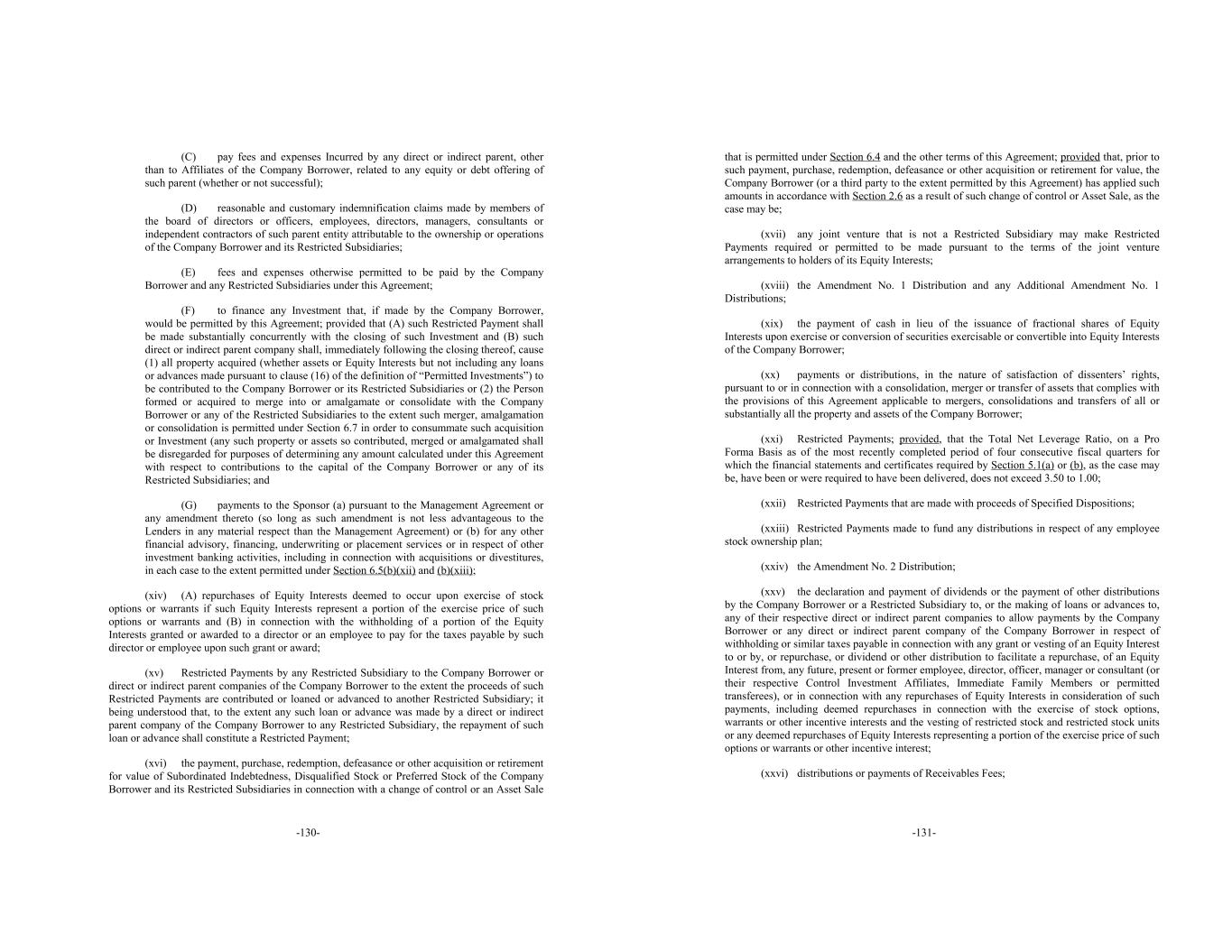 pay fees and expenses Incurred by any direct or indirect parent, other(C) than to Affiliates of the Company Borrower, related to any equity or debt offering of such parent (whether or not successful); reasonable and customary indemnification claims made by members of(D) the board of directors or officers, employees, directors, managers, consultants or independent contractors of such parent entity attributable to the ownership or operations of the Company Borrower and its Restricted Subsidiaries; fees and expenses otherwise permitted to be paid by the Company(E) Borrower and any Restricted Subsidiaries under this Agreement; to finance any Investment that, if made by the Company Borrower,(F) would be permitted by this Agreement; provided that (A) such Restricted Payment shall be made substantially concurrently with the closing of such Investment and (B) such direct or indirect parent company shall, immediately following the closing thereof, cause (1) all property acquired (whether assets or Equity Interests but not including any loans or advances made pursuant to clause (16) of the definition of “Permitted Investments”) to be contributed to the Company Borrower or its Restricted Subsidiaries or (2) the Person formed or acquired to merge into or amalgamate or consolidate with the Company Borrower or any of the Restricted Subsidiaries to the extent such merger, amalgamation or consolidation is permitted under Section 6.7 in order to consummate such acquisition or Investment (any such property or assets so contributed, merged or amalgamated shall be disregarded for purposes of determining any amount calculated under this Agreement with respect to contributions to the capital of the Company Borrower or any of its Restricted Subsidiaries; and payments to the Sponsor (a) pursuant to the Management Agreement or(G) any amendment thereto (so long as such amendment is not less advantageous to the Lenders in any material respect than the Management Agreement) or (b) for any other financial advisory, financing, underwriting or placement services or in respect of other investment banking activities, including in connection with acquisitions or divestitures, in each case to the extent permitted under Section 6.5(b)(xii) and (b)(xiii); (A) repurchases of Equity Interests deemed to occur upon exercise of stock(xiv) options or warrants if such Equity Interests represent a portion of the exercise price of such options or warrants and (B) in connection with the withholding of a portion of the Equity Interests granted or awarded to a director or an employee to pay for the taxes payable by such director or employee upon such grant or award; Restricted Payments by any Restricted Subsidiary to the Company Borrower or(xv) direct or indirect parent companies of the Company Borrower to the extent the proceeds of such Restricted Payments are contributed or loaned or advanced to another Restricted Subsidiary; it being understood that, to the extent any such loan or advance was made by a direct or indirect parent company of the Company Borrower to any Restricted Subsidiary, the repayment of such loan or advance shall constitute a Restricted Payment; the payment, purchase, redemption, defeasance or other acquisition or retirement(xvi) for value of Subordinated Indebtedness, Disqualified Stock or Preferred Stock of the Company Borrower and its Restricted Subsidiaries in connection with a change of control or an Asset Sale -130- that is permitted under Section 6.4 and the other terms of this Agreement; provided that, prior to such payment, purchase, redemption, defeasance or other acquisition or retirement for value, the Company Borrower (or a third party to the extent permitted by this Agreement) has applied such amounts in accordance with Section 2.6 as a result of such change of control or Asset Sale, as the case may be; any joint venture that is not a Restricted Subsidiary may make Restricted(xvii) Payments required or permitted to be made pursuant to the terms of the joint venture arrangements to holders of its Equity Interests; the Amendment No. 1 Distribution and any Additional Amendment No. 1(xviii) Distributions; the payment of cash in lieu of the issuance of fractional shares of Equity(xix) Interests upon exercise or conversion of securities exercisable or convertible into Equity Interests of the Company Borrower; payments or distributions, in the nature of satisfaction of dissenters’ rights,(xx) pursuant to or in connection with a consolidation, merger or transfer of assets that complies with the provisions of this Agreement applicable to mergers, consolidations and transfers of all or substantially all the property and assets of the Company Borrower; Restricted Payments; provided, that the Total Net Leverage Ratio, on a Pro(xxi) Forma Basis as of the most recently completed period of four consecutive fiscal quarters for which the financial statements and certificates required by Section 5.1(a) or (b), as the case may be, have been or were required to have been delivered, does not exceed 3.50 to 1.00; Restricted Payments that are made with proceeds of Specified Dispositions;(xxii) Restricted Payments made to fund any distributions in respect of any employee(xxiii) stock ownership plan; the Amendment No. 2 Distribution;(xxiv) the declaration and payment of dividends or the payment of other distributions(xxv) by the Company Borrower or a Restricted Subsidiary to, or the making of loans or advances to, any of their respective direct or indirect parent companies to allow payments by the Company Borrower or any direct or indirect parent company of the Company Borrower in respect of withholding or similar taxes payable in connection with any grant or vesting of an Equity Interest to or by, or repurchase, or dividend or other distribution to facilitate a repurchase, of an Equity Interest from, any future, present or former employee, director, officer, manager or consultant (or their respective Control Investmen