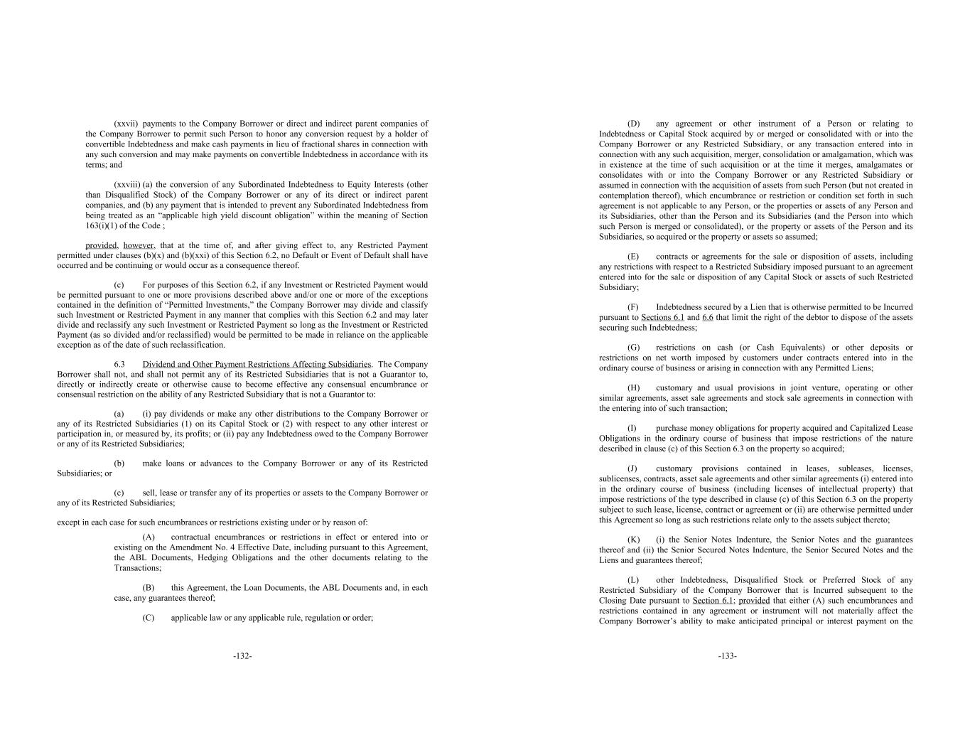 payments to the Company Borrower or direct and indirect parent companies of(xxvii) the Company Borrower to permit such Person to honor any conversion request by a holder of convertible Indebtedness and make cash payments in lieu of fractional shares in connection with any such conversion and may make payments on convertible Indebtedness in accordance with its terms; and (a) the conversion of any Subordinated Indebtedness to Equity Interests (other(xxviii) than Disqualified Stock) of the Company Borrower or any of its direct or indirect parent companies, and (b) any payment that is intended to prevent any Subordinated Indebtedness from being treated as an “applicable high yield discount obligation” within the meaning of Section 163(i)(1) of the Code ; provided, however, that at the time of, and after giving effect to, any Restricted Payment permitted under clauses (b)(x) and (b)(xxi) of this Section 6.2, no Default or Event of Default shall have occurred and be continuing or would occur as a consequence thereof. For purposes of this Section 6.2, if any Investment or Restricted Payment would(c) be permitted pursuant to one or more provisions described above and/or one or more of the exceptions contained in the definition of “Permitted Investments,” the Company Borrower may divide and classify such Investment or Restricted Payment in any manner that complies with this Section 6.2 and may later divide and reclassify any such Investment or Restricted Payment so long as the Investment or Restricted Payment (as so divided and/or reclassified) would be permitted to be made in reliance on the applicable exception as of the date of such reclassification. Dividend and Other Payment Restrictions Affecting Subsidiaries. The Company6.3 Borrower shall not, and shall not permit any of its Restricted Subsidiaries that is not a Guarantor to, directly or indirectly create or otherwise cause to become effective any consensual encumbrance or consensual restriction on the ability of any Restricted Subsidiary that is not a Guarantor to: (i) pay dividends or make any other distributions to the Company Borrower or(a) any of its Restricted Subsidiaries (1) on its Capital Stock or (2) with respect to any other interest or participation in, or measured by, its profits; or (ii) pay any Indebtedness owed to the Company Borrower or any of its Restricted Subsidiaries; make loans or advances to the Company Borrower or any of its Restricted(b) Subsidiaries; or sell, lease or transfer any of its properties or assets to the Company Borrower or(c) any of its Restricted Subsidiaries; except in each case for such encumbrances or restrictions existing under or by reason of: contractual encumbrances or restrictions in effect or entered into or(A) existing on the Amendment No. 4 Effective Date, including pursuant to this Agreement, the ABL Documents, Hedging Obligations and the other documents relating to the Transactions; this Agreement, the Loan Documents, the ABL Documents and, in each(B) case, any guarantees thereof; applicable law or any applicable rule, regulation or order;(C) -132- any agreement or other instrument of a Person or relating to(D) Indebtedness or Capital Stock acquired by or merged or consolidated with or into the Company Borrower or any Restricted Subsidiary, or any transaction entered into in connection with any such acquisition, merger, consolidation or amalgamation, which was in existence at the time of such acquisition or at the time it merges, amalgamates or consolidates with or into the Company Borrower or any Restricted Subsidiary or assumed in connection with the acquisition of assets from such Person (but not created in contemplation thereof), which encumbrance or restriction or condition set forth in such agreement is not applicable to any Person, or the properties or assets of any Person and its Subsidiaries, other than the Person and its Subsidiaries (and the Person into which such Person is merged or consolidated), or the property or assets of the Person and its Subsidiaries, so acquired or the property or assets so assumed; contracts or agreements for the sale or disposition of assets, including(E) any restrictions with respect to a Restricted Subsidiary imposed pursuant to an agreement entered into for the sale or disposition of any Capital Stock or assets of such Restricted Subsidiary; Indebtedness secured by a Lien that is otherwise permitted to be Incurred(F) pursuant to Sections 6.1 and 6.6 that limit the right of the debtor to dispose of the assets securing such Indebtedness; restrictions on cash (or Cash Equivalents) or other deposits or(G) restrictions on net worth imposed by customers under contracts entered into in the ordinary course of business or arising in connection with any Permitted Liens; customary and usual provisions in joint venture, operating or other(H) similar agreements, asset sale agreements and stock sale agreements in connection with the entering into of such transaction; purchase money obligations for property acquired and Capitalized Lease(I) Obligations in the ordinary course of business that impose restrictions of the nature described in clause (c) of this Section 6.3 on the property so acquired; customary provisions contained in leases, subleases, licenses,(J) sublicenses, contracts, asset sale agreements and other similar agreements (i) entered into in the ordinary course of business (including licenses of intellectual property) that impose restrictions of the type described in clause (c) of this Section 6.3 on the property subject to such lease, license, contract or agreement or (ii) are otherwise permitted under this Agreement so long as such restrictions relate only to the assets subject thereto; (i) the Senior Notes Indenture, the Senior Notes and the guarantees(K) thereof and (ii) the Senior Secured Notes Indenture, the Senior Secured Notes and the Liens and guarantees thereof; other Indebtedness, Disqualified Stock or Preferred Stock of any(L) Re