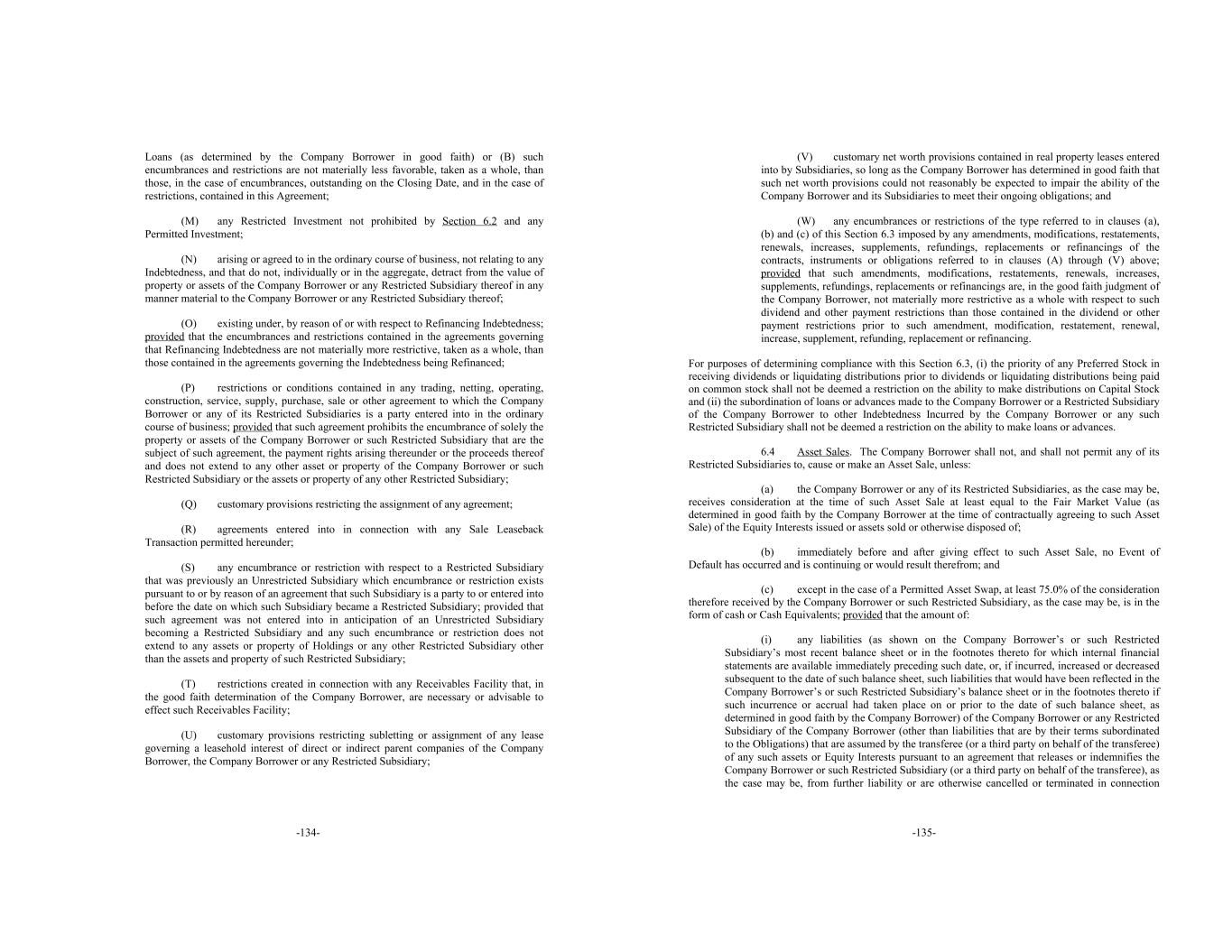 Loans (as determined by the Company Borrower in good faith) or (B) such encumbrances and restrictions are not materially less favorable, taken as a whole, than those, in the case of encumbrances, outstanding on the Closing Date, and in the case of restrictions, contained in this Agreement; any Restricted Investment not prohibited by Section 6.2 and any(M) Permitted Investment; arising or agreed to in the ordinary course of business, not relating to any(N) Indebtedness, and that do not, individually or in the aggregate, detract from the value of property or assets of the Company Borrower or any Restricted Subsidiary thereof in any manner material to the Company Borrower or any Restricted Subsidiary thereof; existing under, by reason of or with respect to Refinancing Indebtedness;(O) provided that the encumbrances and restrictions contained in the agreements governing that Refinancing Indebtedness are not materially more restrictive, taken as a whole, than those contained in the agreements governing the Indebtedness being Refinanced; restrictions or conditions contained in any trading, netting, operating,(P) construction, service, supply, purchase, sale or other agreement to which the Company Borrower or any of its Restricted Subsidiaries is a party entered into in the ordinary course of business; provided that such agreement prohibits the encumbrance of solely the property or assets of the Company Borrower or such Restricted Subsidiary that are the subject of such agreement, the payment rights arising thereunder or the proceeds thereof and does not extend to any other asset or property of the Company Borrower or such Restricted Subsidiary or the assets or property of any other Restricted Subsidiary; customary provisions restricting the assignment of any agreement;(Q) agreements entered into in connection with any Sale Leaseback(R) Transaction permitted hereunder; any encumbrance or restriction with respect to a Restricted Subsidiary(S) that was previously an Unrestricted Subsidiary which encumbrance or restriction exists pursuant to or by reason of an agreement that such Subsidiary is a party to or entered into before the date on which such Subsidiary became a Restricted Subsidiary; provided that such agreement was not entered into in anticipation of an Unrestricted Subsidiary becoming a Restricted Subsidiary and any such encumbrance or restriction does not extend to any assets or property of Holdings or any other Restricted Subsidiary other than the assets and property of such Restricted Subsidiary; restrictions created in connection with any Receivables Facility that, in(T) the good faith determination of the Company Borrower, are necessary or advisable to effect such Receivables Facility; customary provisions restricting subletting or assignment of any lease(U) governing a leasehold interest of direct or indirect parent companies of the Company Borrower, the Company Borrower or any Restricted Subsidiary; -134- customary net worth provisions contained in real property leases entered(V) into by Subsidiaries, so long as the Company Borrower has determined in good faith that such net worth provisions could not reasonably be expected to impair the ability of the Company Borrower and its Subsidiaries to meet their ongoing obligations; and any encumbrances or restrictions of the type referred to in clauses (a),(W) (b) and (c) of this Section 6.3 imposed by any amendments, modifications, restatements, renewals, increases, supplements, refundings, replacements or refinancings of the contracts, instruments or obligations referred to in clauses (A) through (V) above; provided that such amendments, modifications, restatements, renewals, increases, supplements, refundings, replacements or refinancings are, in the good faith judgment of the Company Borrower, not materially more restrictive as a whole with respect to such dividend and other payment restrictions than those contained in the dividend or other payment restrictions prior to such amendment, modification, restatement, renewal, increase, supplement, refunding, replacement or refinancing. For purposes of determining compliance with this Section 6.3, (i) the priority of any Preferred Stock in receiving dividends or liquidating distributions prior to dividends or liquidating distributions being paid on common stock shall not be deemed a restriction on the ability to make distributions on Capital Stock and (ii) the subordination of loans or advances made to the Company Borrower or a Restricted Subsidiary of the Company Borrower to other Indebtedness Incurred by the Company Borrower or any such Restricted Subsidiary shall not be deemed a restriction on the ability to make loans or advances. Asset Sales. The Company Borrower shall not, and shall not permit any of its6.4 Restricted Subsidiaries to, cause or make an Asset Sale, unless: the Company Borrower or any of its Restricted Subsidiaries, as the case may be,(a) receives consideration at the time of such Asset Sale at least equal to the Fair Market Value (as determined in good faith by the Company Borrower at the time of contractually agreeing to such Asset Sale) of the Equity Interests issued or assets sold or otherwise disposed of; immediately before and after giving effect to such Asset Sale, no Event of(b) Default has occurred and is continuing or would result therefrom; and except in the case of a Permitted Asset Swap, at least 75.0% of the consideration(c) therefore received by the Company Borrower or such Restricted Subsidiary, as the case may be, is in the form of cash or Cash Equivalents; provided that the amount of: any liabilities (as shown on the Company Borrower’s or such Restricted(i) Subsidiary’s most recent balance sheet or in the footnotes thereto for which internal financial statements are available immediately preceding such date, or, if incurred, increased or decreased subsequent to the date of such balance sheet, such liabilities that would have been reflected in the Co