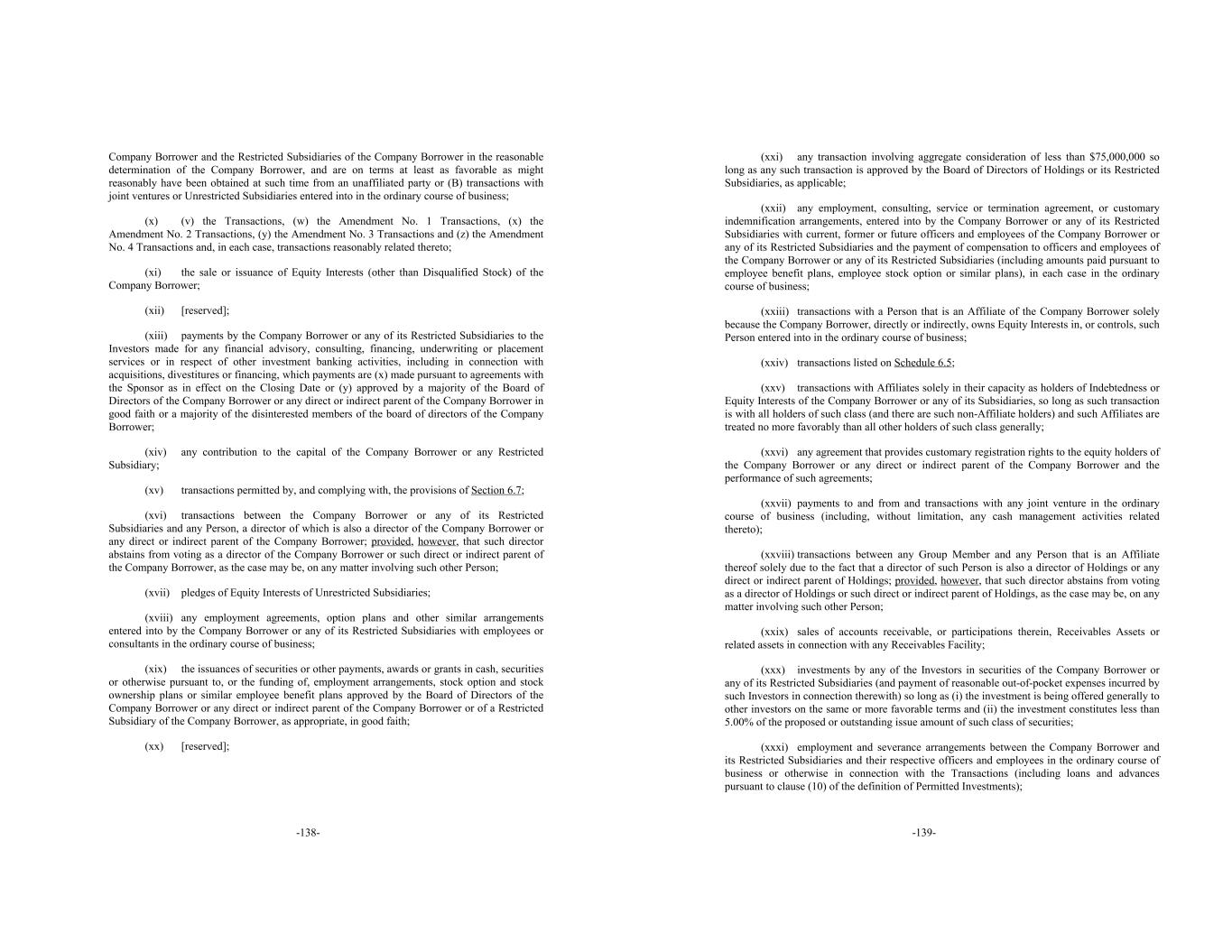 Company Borrower and the Restricted Subsidiaries of the Company Borrower in the reasonable determination of the Company Borrower, and are on terms at least as favorable as might reasonably have been obtained at such time from an unaffiliated party or (B) transactions with joint ventures or Unrestricted Subsidiaries entered into in the ordinary course of business; (v) the Transactions, (w) the Amendment No. 1 Transactions, (x) the(x) Amendment No. 2 Transactions, (y) the Amendment No. 3 Transactions and (z) the Amendment No. 4 Transactions and, in each case, transactions reasonably related thereto; the sale or issuance of Equity Interests (other than Disqualified Stock) of the(xi) Company Borrower; [reserved];(xii) payments by the Company Borrower or any of its Restricted Subsidiaries to the(xiii) Investors made for any financial advisory, consulting, financing, underwriting or placement services or in respect of other investment banking activities, including in connection with acquisitions, divestitures or financing, which payments are (x) made pursuant to agreements with the Sponsor as in effect on the Closing Date or (y) approved by a majority of the Board of Directors of the Company Borrower or any direct or indirect parent of the Company Borrower in good faith or a majority of the disinterested members of the board of directors of the Company Borrower; any contribution to the capital of the Company Borrower or any Restricted(xiv) Subsidiary; transactions permitted by, and complying with, the provisions of Section 6.7;(xv) transactions between the Company Borrower or any of its Restricted(xvi) Subsidiaries and any Person, a director of which is also a director of the Company Borrower or any direct or indirect parent of the Company Borrower; provided, however, that such director abstains from voting as a director of the Company Borrower or such direct or indirect parent of the Company Borrower, as the case may be, on any matter involving such other Person; pledges of Equity Interests of Unrestricted Subsidiaries;(xvii) any employment agreements, option plans and other similar arrangements(xviii) entered into by the Company Borrower or any of its Restricted Subsidiaries with employees or consultants in the ordinary course of business; the issuances of securities or other payments, awards or grants in cash, securities(xix) or otherwise pursuant to, or the funding of, employment arrangements, stock option and stock ownership plans or similar employee benefit plans approved by the Board of Directors of the Company Borrower or any direct or indirect parent of the Company Borrower or of a Restricted Subsidiary of the Company Borrower, as appropriate, in good faith; [reserved];(xx) -138- any transaction involving aggregate consideration of less than $75,000,000 so(xxi) long as any such transaction is approved by the Board of Directors of Holdings or its Restricted Subsidiaries, as applicable; any employment, consulting, service or termination agreement, or customary(xxii) indemnification arrangements, entered into by the Company Borrower or any of its Restricted Subsidiaries with current, former or future officers and employees of the Company Borrower or any of its Restricted Subsidiaries and the payment of compensation to officers and employees of the Company Borrower or any of its Restricted Subsidiaries (including amounts paid pursuant to employee benefit plans, employee stock option or similar plans), in each case in the ordinary course of business; transactions with a Person that is an Affiliate of the Company Borrower solely(xxiii) because the Company Borrower, directly or indirectly, owns Equity Interests in, or controls, such Person entered into in the ordinary course of business; transactions listed on Schedule 6.5;(xxiv) transactions with Affiliates solely in their capacity as holders of Indebtedness or(xxv) Equity Interests of the Company Borrower or any of its Subsidiaries, so long as such transaction is with all holders of such class (and there are such non-Affiliate holders) and such Affiliates are treated no more favorably than all other holders of such class generally; any agreement that provides customary registration rights to the equity holders of(xxvi) the Company Borrower or any direct or indirect parent of the Company Borrower and the performance of such agreements; payments to and from and transactions with any joint venture in the ordinary(xxvii) course of business (including, without limitation, any cash management activities related thereto); transactions between any Group Member and any Person that is an Affiliate(xxviii) thereof solely due to the fact that a director of such Person is also a director of Holdings or any direct or indirect parent of Holdings; provided, however, that such director abstains from voting as a director of Holdings or such direct or indirect parent of Holdings, as the case may be, on any matter involving such other Person; sales of accounts receivable, or participations therein, Receivables Assets or(xxix) related assets in connection with any Receivables Facility; investments by any of the Investors in securities of the Company Borrower or(xxx) any of its Restricted Subsidiaries (and payment of reasonable out-of-pocket expenses incurred by such Investors in connection therewith) so long as (i) the investment is being offered generally to other investors on the same or more favorable terms and (ii) the investment constitutes less than 5.00% of the proposed or outstanding issue amount of such class of securities; employment and severance arrangements between the Company Borrower and(xxxi) its Restricted Subsidiaries and their respective officers and employees in the ordinary course of business or otherwise in connection with the Transactions (including loans and advances pursuant to clause (10) of the definition of Permitted Investments); -139-