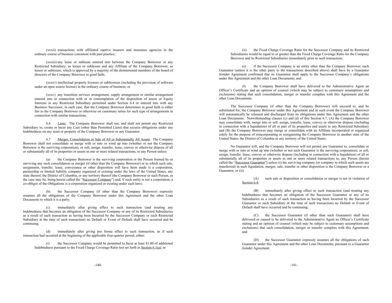 transactions with affiliated captive insurers and insurance agencies in the(xxxii) ordinary course of business consistent with past practice; any lease or sublease entered into between the Company Borrower or any(xxxiii) Restricted Subsidiary, as lessee or sublessee and any Affiliate of the Company Borrower, as lessor or sublessor, which is approved by a majority of the disinterested members of the board of directors of the Company Borrower in good faith; intellectual property licenses or sublicenses (including the provision of software(xxxiv) under an open source license) in the ordinary course of business; or any transition services arrangement, supply arrangement or similar arrangement(xxxv) entered into in connection with or in contemplation of the disposition of assets or Equity Interests in any Restricted Subsidiary permitted under Section 6.4 or entered into with any Business Successor, in each case, that the Company Borrower determines in good faith is either fair to the Company Borrower or otherwise on customary terms for such type of arrangements in connection with similar transactions. Liens. The Company Borrower shall not, and shall not permit any Restricted6.6 Subsidiary to, create or Incur any Lien (other than Permitted Liens) that secures obligations under any Indebtedness on any asset or property of the Company Borrower or any Guarantor. Merger, Consolidation or Sale of All or Substantially All Assets. The Company6.7 Borrower shall not consolidate or merge with or into or wind up into (whether or not the Company Borrower is the surviving corporation), or sell, assign, transfer, lease, convey or otherwise dispose of all or substantially all of its properties or assets in one or more related transactions, to any Person unless: the Company Borrower is the surviving corporation or the Person formed by or(a) surviving any such consolidation or merger (if other than the Company Borrower) or to which such sale, assignment, transfer, lease, conveyance or other disposition will have been made is a corporation, partnership or limited liability company organized or existing under the laws of the United States, any state thereof, the District of Columbia, or any territory thereof (the Company Borrower or such Person, as the case may be, being herein called the “Successor Company”) and, if such entity is not a corporation, a co-obligor of the Obligations is a corporation organized or existing under such laws; the Successor Company (if other than the Company Borrower) expressly(b) assumes all the obligations of the Company Borrower under this Agreement and the other Loan Documents to which it is a party; immediately after giving effect to such transaction (and treating any(c) Indebtedness that becomes an obligation of the Successor Company or any of its Restricted Subsidiaries as a result of such transaction as having been Incurred by the Successor Company or such Restricted Subsidiary at the time of such transaction) no Default or Event of Default shall have occurred and be continuing; immediately after giving pro forma effect to such transaction, as if such(d) transaction had occurred at the beginning of the applicable four-quarter period, either: the Successor Company would be permitted to Incur at least $1.00 of additional(i) Indebtedness pursuant to the Fixed Charge Coverage Ratio test set forth in Section 6.1(a); or -140- the Fixed Charge Coverage Ratio for the Successor Company and its Restricted(ii) Subsidiaries would be equal to or greater than the Fixed Charge Coverage Ratio for the Company Borrower and its Restricted Subsidiaries immediately prior to such transaction; if the Successor Company is an entity other than the Company Borrower, each(e) Guarantor (unless it is the other party to the transactions described above) shall have by a Guarantor Joinder Agreement confirmed that its Guarantee shall apply to the Successor Company’s obligations under this Agreement and the other Loan Documents; and the Company Borrower shall have delivered to the Administrative Agent an(f) Officer’s Certificate and an opinion of counsel (which may be subject to customary assumptions and exclusions) stating that such consolidation, merger or transfer complies with this Agreement and the other Loan Documents. The Successor Company (if other than the Company Borrower) will succeed to, and be substituted for, the Company Borrower under this Agreement and in such event the Company Borrower will automatically be released and discharged from its obligations under this Agreement and the other Loan Documents. Notwithstanding clauses (c) and (d) of this Section 6.7, (A) the Company Borrower may consolidate with, merge into or sell, assign, transfer, lease, convey or otherwise dispose (including in connection with a liquidation) of all or part of its properties and assets to any Restricted Subsidiary and (B) the Company Borrower may merge or consolidate with an Affiliate incorporated or organized solely for the purpose of reincorporating or reorganizing the Company Borrower in another state of the United States, the District of Columbia or any territory of the United States. No Guarantor will, and the Company Borrower will not permit any Guarantor to, consolidate or merge with or into or wind up into (whether or not such Guarantor is the surviving corporation), or sell, assign, transfer, lease, convey or otherwise dispose (including in connection with a liquidation) of all or substantially all of its properties or assets in one or more related transactions to, any Person (herein called the “Successor Guarantor”) unless (i) the surviving company (or company to which such assets are transferred) in such liquidation, merger, sale, transfer or other disposition is the Company Borrower or a Guarantor; or (ii): such sale or disposition or consolidation or merger is not in violation of(A) Section 6.4; immediately after giving effect to such transaction (and treating any(B) Indebtedness that becomes 