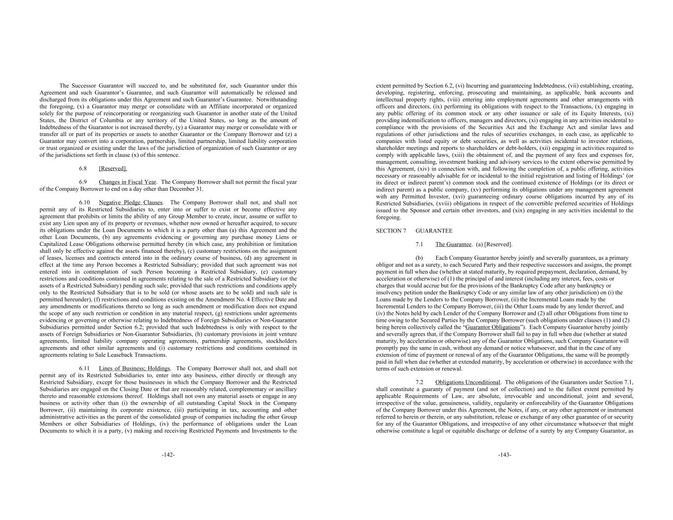 The Successor Guarantor will succeed to, and be substituted for, such Guarantor under this Agreement and such Guarantor’s Guarantee, and such Guarantor will automatically be released and discharged from its obligations under this Agreement and such Guarantor’s Guarantee. Notwithstanding the foregoing, (x) a Guarantor may merge or consolidate with an Affiliate incorporated or organized solely for the purpose of reincorporating or reorganizing such Guarantor in another state of the United States, the District of Columbia or any territory of the United States, so long as the amount of Indebtedness of the Guarantor is not increased thereby, (y) a Guarantor may merge or consolidate with or transfer all or part of its properties or assets to another Guarantor or the Company Borrower and (z) a Guarantor may convert into a corporation, partnership, limited partnership, limited liability corporation or trust organized or existing under the laws of the jurisdiction of organization of such Guarantor or any of the jurisdictions set forth in clause (x) of this sentence. [Reserved].6.8 Changes in Fiscal Year. The Company Borrower shall not permit the fiscal year6.9 of the Company Borrower to end on a day other than December 31. Negative Pledge Clauses. The Company Borrower shall not, and shall not6.10 permit any of its Restricted Subsidiaries to, enter into or suffer to exist or become effective any agreement that prohibits or limits the ability of any Group Member to create, incur, assume or suffer to exist any Lien upon any of its property or revenues, whether now owned or hereafter acquired, to secure its obligations under the Loan Documents to which it is a party other than (a) this Agreement and the other Loan Documents, (b) any agreements evidencing or governing any purchase money Liens or Capitalized Lease Obligations otherwise permitted hereby (in which case, any prohibition or limitation shall only be effective against the assets financed thereby), (c) customary restrictions on the assignment of leases, licenses and contracts entered into in the ordinary course of business, (d) any agreement in effect at the time any Person becomes a Restricted Subsidiary; provided that such agreement was not entered into in contemplation of such Person becoming a Restricted Subsidiary, (e) customary restrictions and conditions contained in agreements relating to the sale of a Restricted Subsidiary (or the assets of a Restricted Subsidiary) pending such sale; provided that such restrictions and conditions apply only to the Restricted Subsidiary that is to be sold (or whose assets are to be sold) and such sale is permitted hereunder), (f) restrictions and conditions existing on the Amendment No. 4 Effective Date and any amendments or modifications thereto so long as such amendment or modification does not expand the scope of any such restriction or condition in any material respect, (g) restrictions under agreements evidencing or governing or otherwise relating to Indebtedness of Foreign Subsidiaries or Non-Guarantor Subsidiaries permitted under Section 6.2; provided that such Indebtedness is only with respect to the assets of Foreign Subsidiaries or Non-Guarantor Subsidiaries, (h) customary provisions in joint venture agreements, limited liability company operating agreements, partnership agreements, stockholders agreements and other similar agreements and (i) customary restrictions and conditions contained in agreements relating to Sale Leaseback Transactions. Lines of Business; Holdings. The Company Borrower shall not, and shall not6.11 permit any of its Restricted Subsidiaries to, enter into any business, either directly or through any Restricted Subsidiary, except for those businesses in which the Company Borrower and the Restricted Subsidiaries are engaged on the Closing Date or that are reasonably related, complementary or ancillary thereto and reasonable extensions thereof. Holdings shall not own any material assets or engage in any business or activity other than (i) the ownership of all outstanding Capital Stock in the Company Borrower, (ii) maintaining its corporate existence, (iii) participating in tax, accounting and other administrative activities as the parent of the consolidated group of companies including the other Group Members or other Subsidiaries of Holdings, (iv) the performance of obligations under the Loan Documents to which it is a party, (v) making and receiving Restricted Payments and Investments to the -142- extent permitted by Section 6.2, (vi) Incurring and guaranteeing Indebtedness, (vii) establishing, creating, developing, registering, enforcing, prosecuting and maintaining, as applicable, bank accounts and intellectual property rights, (viii) entering into employment agreements and other arrangements with officers and directors, (ix) performing its obligations with respect to the Transactions, (x) engaging in any public offering of its common stock or any other issuance or sale of its Equity Interests, (xi) providing indemnification to officers, managers and directors, (xi) engaging in any activities incidental to compliance with the provisions of the Securities Act and the Exchange Act and similar laws and regulations of other jurisdictions and the rules of securities exchanges, in each case, as applicable to companies with listed equity or debt securities, as well as activities incidental to investor relations, shareholder meetings and reports to shareholders or debt-holders, (xii) engaging in activities required to comply with applicable laws, (xiii) the obtainment of, and the payment of any fees and expenses for, management, consulting, investment banking and advisory services to the extent otherwise permitted by this Agreement, (xiv) in connection with, and following the completion of, a public offering, activities necessary or reasonably advisable for or incidental to the initial registration and listing of Holdings’ (or its direct or indirect parent’s) common st