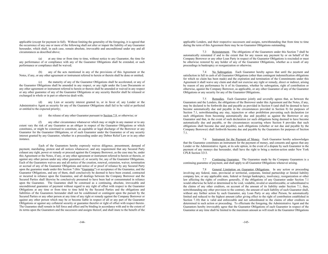 applicable (except for payment in full). Without limiting the generality of the foregoing, it is agreed that the occurrence of any one or more of the following shall not alter or impair the liability of any Guarantor hereunder, which shall, in each case, remain absolute, irrevocable and unconditional under any and all circumstances as described above; at any time or from time to time, without notice to any Guarantor, the time for(a) any performance of or compliance with any of the Guarantor Obligations shall be extended, or such performance or compliance shall be waived; any of the acts mentioned in any of the provisions of this Agreement or the(b) Notes, if any, or any other agreement or instrument referred to herein or therein shall be done or omitted; the maturity of any of the Guarantor Obligations shall be accelerated, or any of(c) the Guarantor Obligations shall be amended in any respect, or any right under the Loan Documents or any other agreement or instrument referred to herein or therein shall be amended or waived in any respect or any other guarantee of any of the Guarantor Obligations or any security therefor shall be released or exchanged in whole or in part or otherwise dealt with; any Lien or security interest granted to, or in favor of, any Lender or the(d) Administrative Agent as security for any of the Guarantor Obligations shall fail to be valid or perfected or entitled to the expected priority; the release of any other Guarantor pursuant to Section 7.9, or otherwise; or(e) any other circumstance whatsoever which may or might in any manner or to any(f) extent vary the risk of any Guarantor as an obligor in respect of the Guarantor Obligations or which constitutes, or might be construed to constitute, an equitable or legal discharge of the Borrower or any Guarantor for the Guarantor Obligations, or of such Guarantor under the Guarantee or of any security interest granted by any Guarantor, whether in a proceeding under any Debtor Relief Law or in any other instance. Each of the Guarantors hereby expressly waives diligence, presentment, demand of payment, marshaling, protest and all notices whatsoever, and any requirement that any Secured Party exhaust any right, power or remedy or proceed against the Company Borrower, as the case may be, under this Agreement or the Notes, if any, or any other agreement or instrument referred to herein or therein, or against any other person under any other guarantee of, or security for, any of the Guarantor Obligations. Each of the Guarantors waives any and all notice of the creation, renewal, extension, waiver, termination or accrual of any of the Guarantor Obligations and notice of or proof of reliance by any Secured Party upon the guarantee made under this Section 7 (this “Guarantee”) or acceptance of the Guarantee, and the Guarantor Obligations, and any of them, shall conclusively be deemed to have been created, contracted or incurred in reliance upon the Guarantee, and all dealings between the Company Borrower and the Secured Parties shall likewise be conclusively presumed to have been had or consummated in reliance upon the Guarantee. The Guarantee shall be construed as a continuing, absolute, irrevocable and unconditional guarantee of payment without regard to any right of offset with respect to the Guarantor Obligations at any time or from time to time held by the Secured Parties and the obligations and liabilities of the Guarantors hereunder shall not be conditioned or contingent upon the pursuit by the Secured Parties or any other person at any time of any right or remedy against the Company Borrower or against any other person which may be or become liable in respect of all or any part of the Guarantor Obligations or against any collateral security or guarantee therefor or right of offset with respect thereto. The Guarantee shall remain in full force and effect and be binding in accordance with and to the extent of its terms upon the Guarantors and the successors and assigns thereof, and shall inure to the benefit of the -144- applicable Lenders, and their respective successors and assigns, notwithstanding that from time to time during the term of this Agreement there may be no Guarantor Obligations outstanding. Reinstatement. The obligations of the Guarantors under this Section 7 shall be7.3 automatically reinstated if and to the extent that for any reason any payment by or on behalf of the Company Borrower or any other Loan Party in respect of the Guarantor Obligations is rescinded or must be otherwise restored by any holder of any of the Guarantor Obligations, whether as a result of any proceedings in bankruptcy or reorganization or otherwise. No Subrogation. Each Guarantor hereby agrees that until the payment and7.4 satisfaction in full in cash of all Guarantor Obligations (other than contingent indemnification obligations for which no claim has been made) and the expiration and termination of the Commitments under this Agreement it shall waive any claim and shall not exercise any right or remedy, direct or indirect, arising by reason of any performance by it of its Guarantee, whether by subrogation, right of contribution or otherwise, against the Company Borrower, as applicable, or any other Guarantor of any of the Guarantor Obligations or any security for any of the Guarantor Obligations. Remedies. Each Guarantor jointly and severally agrees that, as between the7.5 Guarantors and the Lenders, the obligations of the Borrower under this Agreement and the Notes, if any, may be declared to be forthwith due and payable as provided in Section 8 (and shall be deemed to have become automatically due and payable in the circumstances provided in Section 8) for purposes of Section 7.1, notwithstanding any stay, injunction or other prohibition preventing such declaration (or such obligations from becoming automatically due and payable) as against the Borrower or any Guarantor and that, in the event of such declaration (or such o