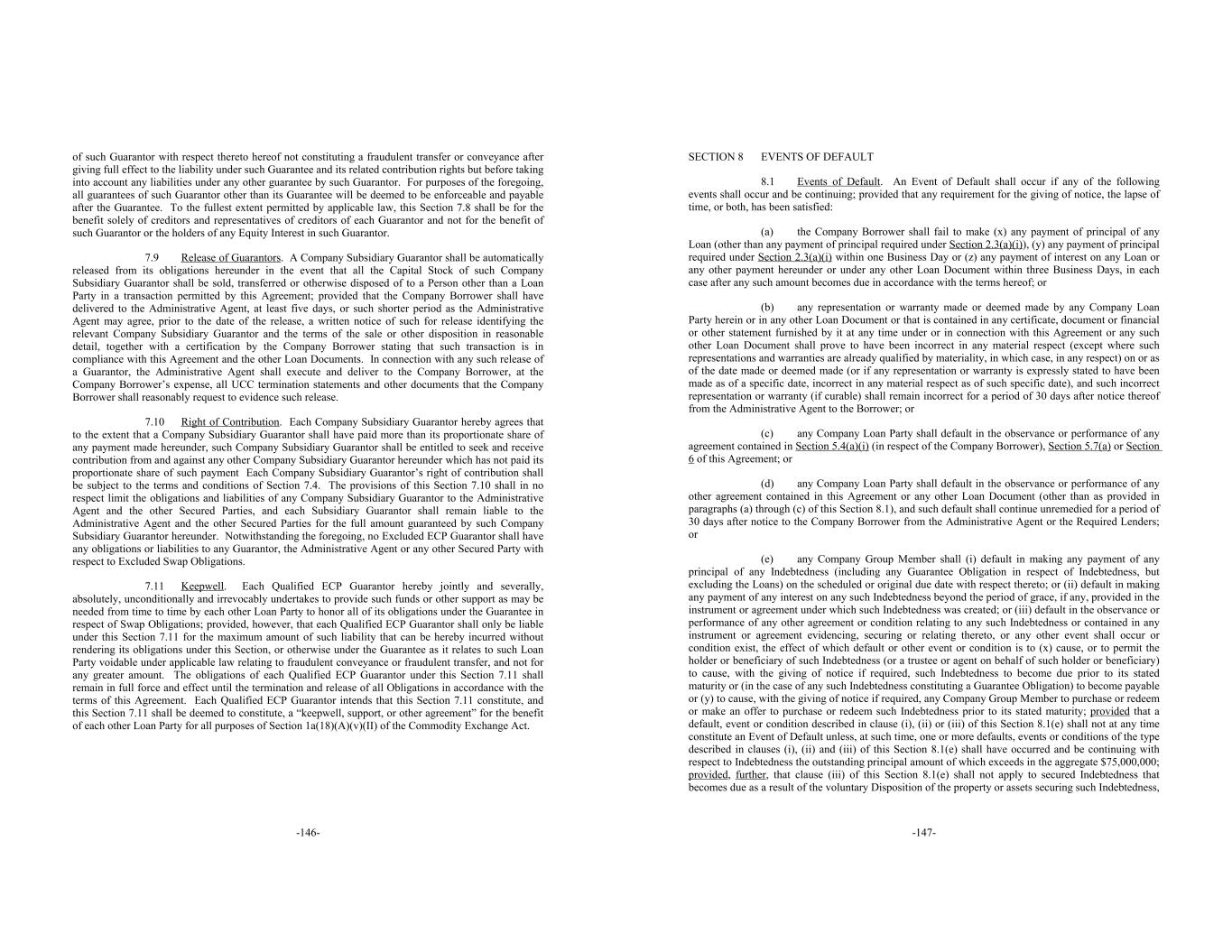 of such Guarantor with respect thereto hereof not constituting a fraudulent transfer or conveyance after giving full effect to the liability under such Guarantee and its related contribution rights but before taking into account any liabilities under any other guarantee by such Guarantor. For purposes of the foregoing, all guarantees of such Guarantor other than its Guarantee will be deemed to be enforceable and payable after the Guarantee. To the fullest extent permitted by applicable law, this Section 7.8 shall be for the benefit solely of creditors and representatives of creditors of each Guarantor and not for the benefit of such Guarantor or the holders of any Equity Interest in such Guarantor. Release of Guarantors. A Company Subsidiary Guarantor shall be automatically7.9 released from its obligations hereunder in the event that all the Capital Stock of such Company Subsidiary Guarantor shall be sold, transferred or otherwise disposed of to a Person other than a Loan Party in a transaction permitted by this Agreement; provided that the Company Borrower shall have delivered to the Administrative Agent, at least five days, or such shorter period as the Administrative Agent may agree, prior to the date of the release, a written notice of such for release identifying the relevant Company Subsidiary Guarantor and the terms of the sale or other disposition in reasonable detail, together with a certification by the Company Borrower stating that such transaction is in compliance with this Agreement and the other Loan Documents. In connection with any such release of a Guarantor, the Administrative Agent shall execute and deliver to the Company Borrower, at the Company Borrower’s expense, all UCC termination statements and other documents that the Company Borrower shall reasonably request to evidence such release. Right of Contribution. Each Company Subsidiary Guarantor hereby agrees that7.10 to the extent that a Company Subsidiary Guarantor shall have paid more than its proportionate share of any payment made hereunder, such Company Subsidiary Guarantor shall be entitled to seek and receive contribution from and against any other Company Subsidiary Guarantor hereunder which has not paid its proportionate share of such payment Each Company Subsidiary Guarantor’s right of contribution shall be subject to the terms and conditions of Section 7.4. The provisions of this Section 7.10 shall in no respect limit the obligations and liabilities of any Company Subsidiary Guarantor to the Administrative Agent and the other Secured Parties, and each Subsidiary Guarantor shall remain liable to the Administrative Agent and the other Secured Parties for the full amount guaranteed by such Company Subsidiary Guarantor hereunder. Notwithstanding the foregoing, no Excluded ECP Guarantor shall have any obligations or liabilities to any Guarantor, the Administrative Agent or any other Secured Party with respect to Excluded Swap Obligations. Keepwell. Each Qualified ECP Guarantor hereby jointly and severally,7.11 absolutely, unconditionally and irrevocably undertakes to provide such funds or other support as may be needed from time to time by each other Loan Party to honor all of its obligations under the Guarantee in respect of Swap Obligations; provided, however, that each Qualified ECP Guarantor shall only be liable under this Section 7.11 for the maximum amount of such liability that can be hereby incurred without rendering its obligations under this Section, or otherwise under the Guarantee as it relates to such Loan Party voidable under applicable law relating to fraudulent conveyance or fraudulent transfer, and not for any greater amount. The obligations of each Qualified ECP Guarantor under this Section 7.11 shall remain in full force and effect until the termination and release of all Obligations in accordance with the terms of this Agreement. Each Qualified ECP Guarantor intends that this Section 7.11 constitute, and this Section 7.11 shall be deemed to constitute, a “keepwell, support, or other agreement” for the benefit of each other Loan Party for all purposes of Section 1a(18)(A)(v)(II) of the Commodity Exchange Act. -146- EVENTS OF DEFAULTSECTION 8 Events of Default. An Event of Default shall occur if any of the following8.1 events shall occur and be continuing; provided that any requirement for the giving of notice, the lapse of time, or both, has been satisfied: the Company Borrower shall fail to make (x) any payment of principal of any(a) Loan (other than any payment of principal required under Section 2.3(a)(i)), (y) any payment of principal required under Section 2.3(a)(i) within one Business Day or (z) any payment of interest on any Loan or any other payment hereunder or under any other Loan Document within three Business Days, in each case after any such amount becomes due in accordance with the terms hereof; or any representation or warranty made or deemed made by any Company Loan(b) Party herein or in any other Loan Document or that is contained in any certificate, document or financial or other statement furnished by it at any time under or in connection with this Agreement or any such other Loan Document shall prove to have been incorrect in any material respect (except where such representations and warranties are already qualified by materiality, in which case, in any respect) on or as of the date made or deemed made (or if any representation or warranty is expressly stated to have been made as of a specific date, incorrect in any material respect as of such specific date), and such incorrect representation or warranty (if curable) shall remain incorrect for a period of 30 days after notice thereof from the Administrative Agent to the Borrower; or any Company Loan Party shall default in the observance or performance of any(c) agreement contained in Section 5.4(a)(i) (in respect of the Company Borrower), Section 5.7(a) or Section 6 of this Agreement; or any Company Loan Party sh