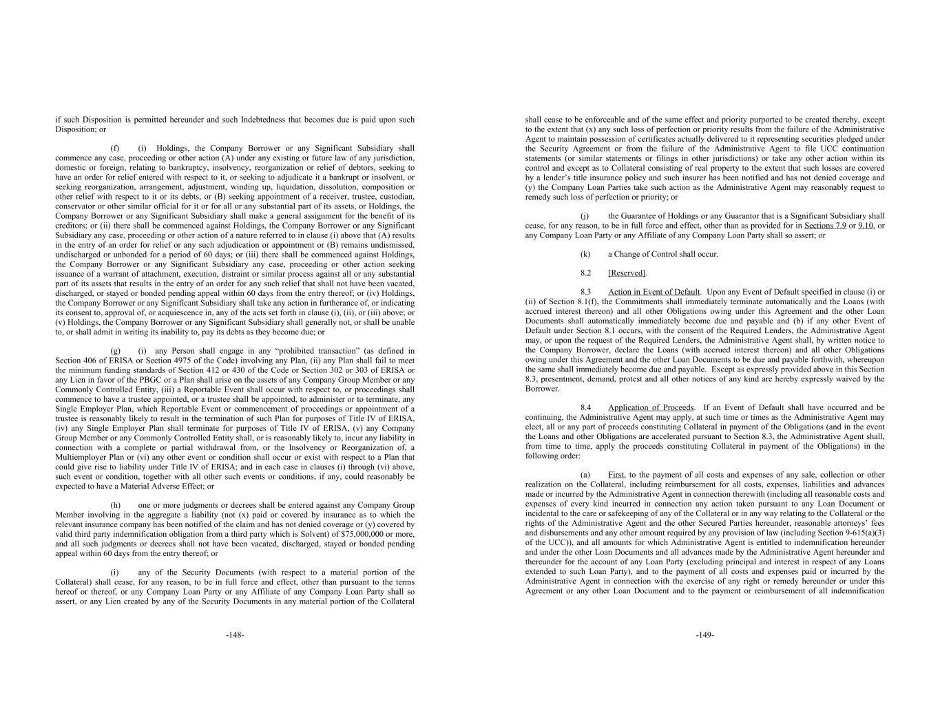 if such Disposition is permitted hereunder and such Indebtedness that becomes due is paid upon such Disposition; or (i) Holdings, the Company Borrower or any Significant Subsidiary shall(f) commence any case, proceeding or other action (A) under any existing or future law of any jurisdiction, domestic or foreign, relating to bankruptcy, insolvency, reorganization or relief of debtors, seeking to have an order for relief entered with respect to it, or seeking to adjudicate it a bankrupt or insolvent, or seeking reorganization, arrangement, adjustment, winding up, liquidation, dissolution, composition or other relief with respect to it or its debts, or (B) seeking appointment of a receiver, trustee, custodian, conservator or other similar official for it or for all or any substantial part of its assets, or Holdings, the Company Borrower or any Significant Subsidiary shall make a general assignment for the benefit of its creditors; or (ii) there shall be commenced against Holdings, the Company Borrower or any Significant Subsidiary any case, proceeding or other action of a nature referred to in clause (i) above that (A) results in the entry of an order for relief or any such adjudication or appointment or (B) remains undismissed, undischarged or unbonded for a period of 60 days; or (iii) there shall be commenced against Holdings, the Company Borrower or any Significant Subsidiary any case, proceeding or other action seeking issuance of a warrant of attachment, execution, distraint or similar process against all or any substantial part of its assets that results in the entry of an order for any such relief that shall not have been vacated, discharged, or stayed or bonded pending appeal within 60 days from the entry thereof; or (iv) Holdings, the Company Borrower or any Significant Subsidiary shall take any action in furtherance of, or indicating its consent to, approval of, or acquiescence in, any of the acts set forth in clause (i), (ii), or (iii) above; or (v) Holdings, the Company Borrower or any Significant Subsidiary shall generally not, or shall be unable to, or shall admit in writing its inability to, pay its debts as they become due; or (i) any Person shall engage in any “prohibited transaction” (as defined in(g) Section 406 of ERISA or Section 4975 of the Code) involving any Plan, (ii) any Plan shall fail to meet the minimum funding standards of Section 412 or 430 of the Code or Section 302 or 303 of ERISA or any Lien in favor of the PBGC or a Plan shall arise on the assets of any Company Group Member or any Commonly Controlled Entity, (iii) a Reportable Event shall occur with respect to, or proceedings shall commence to have a trustee appointed, or a trustee shall be appointed, to administer or to terminate, any Single Employer Plan, which Reportable Event or commencement of proceedings or appointment of a trustee is reasonably likely to result in the termination of such Plan for purposes of Title IV of ERISA, (iv) any Single Employer Plan shall terminate for purposes of Title IV of ERISA, (v) any Company Group Member or any Commonly Controlled Entity shall, or is reasonably likely to, incur any liability in connection with a complete or partial withdrawal from, or the Insolvency or Reorganization of, a Multiemployer Plan or (vi) any other event or condition shall occur or exist with respect to a Plan that could give rise to liability under Title IV of ERISA; and in each case in clauses (i) through (vi) above, such event or condition, together with all other such events or conditions, if any, could reasonably be expected to have a Material Adverse Effect; or one or more judgments or decrees shall be entered against any Company Group(h) Member involving in the aggregate a liability (not (x) paid or covered by insurance as to which the relevant insurance company has been notified of the claim and has not denied coverage or (y) covered by valid third party indemnification obligation from a third party which is Solvent) of $75,000,000 or more, and all such judgments or decrees shall not have been vacated, discharged, stayed or bonded pending appeal within 60 days from the entry thereof; or any of the Security Documents (with respect to a material portion of the(i) Collateral) shall cease, for any reason, to be in full force and effect, other than pursuant to the terms hereof or thereof, or any Company Loan Party or any Affiliate of any Company Loan Party shall so assert, or any Lien created by any of the Security Documents in any material portion of the Collateral -148- shall cease to be enforceable and of the same effect and priority purported to be created thereby, except to the extent that (x) any such loss of perfection or priority results from the failure of the Administrative Agent to maintain possession of certificates actually delivered to it representing securities pledged under the Security Agreement or from the failure of the Administrative Agent to file UCC continuation statements (or similar statements or filings in other jurisdictions) or take any other action within its control and except as to Collateral consisting of real property to the extent that such losses are covered by a lender’s title insurance policy and such insurer has been notified and has not denied coverage and (y) the Company Loan Parties take such action as the Administrative Agent may reasonably request to remedy such loss of perfection or priority; or the Guarantee of Holdings or any Guarantor that is a Significant Subsidiary shall(j) cease, for any reason, to be in full force and effect, other than as provided for in Sections 7.9 or 9.10, or any Company Loan Party or any Affiliate of any Company Loan Party shall so assert; or a Change of Control shall occur.(k) [Reserved].8.2 Action in Event of Default. Upon any Event of Default specified in clause (i) or8.3 (ii) of Section 8.1(f), the Commitments shall immediately terminate automatically and the Loans (with accrued interest thereon) and all ot