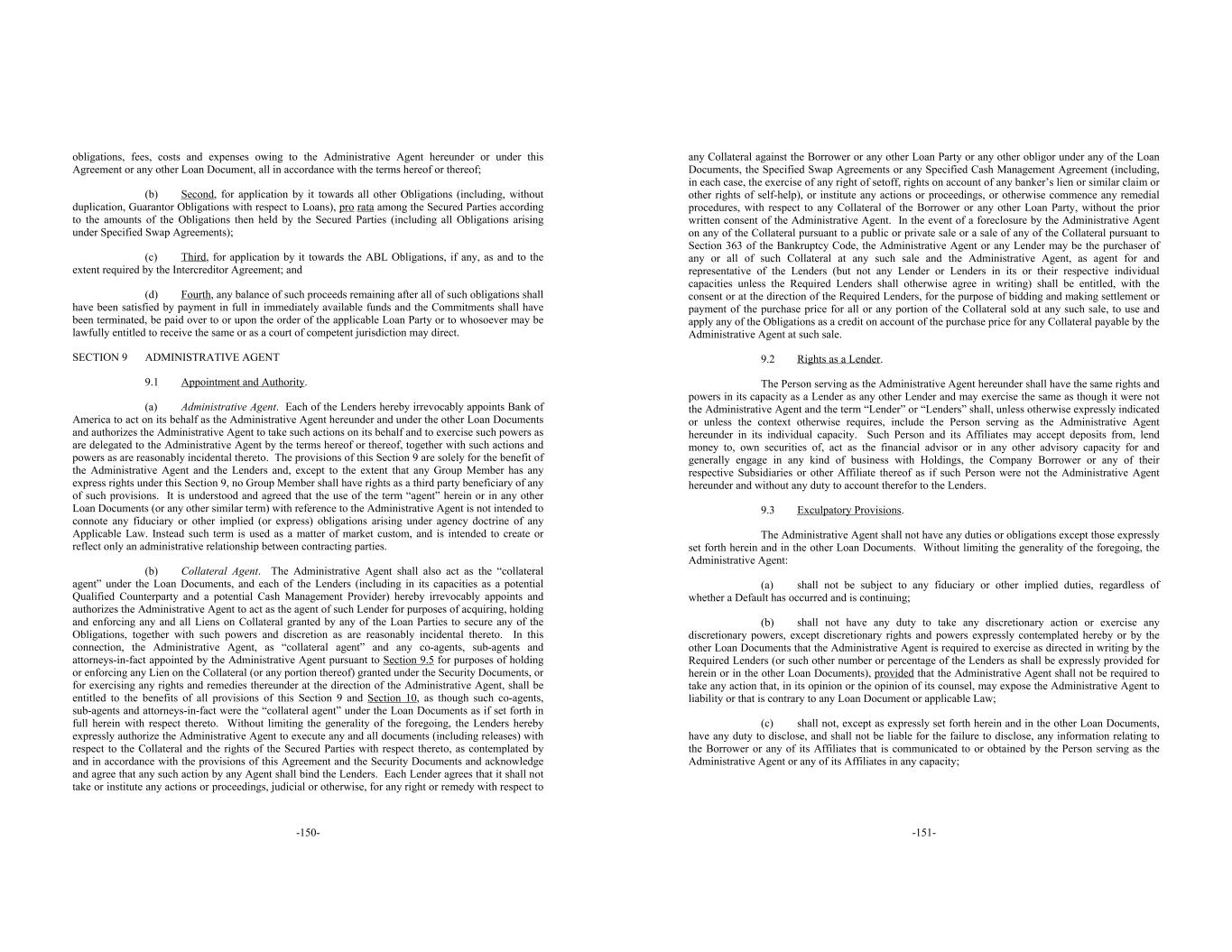 obligations, fees, costs and expenses owing to the Administrative Agent hereunder or under this Agreement or any other Loan Document, all in accordance with the terms hereof or thereof; Second, for application by it towards all other Obligations (including, without(b) duplication, Guarantor Obligations with respect to Loans), pro rata among the Secured Parties according to the amounts of the Obligations then held by the Secured Parties (including all Obligations arising under Specified Swap Agreements); Third, for application by it towards the ABL Obligations, if any, as and to the(c) extent required by the Intercreditor Agreement; and Fourth, any balance of such proceeds remaining after all of such obligations shall(d) have been satisfied by payment in full in immediately available funds and the Commitments shall have been terminated, be paid over to or upon the order of the applicable Loan Party or to whosoever may be lawfully entitled to receive the same or as a court of competent jurisdiction may direct. ADMINISTRATIVE AGENTSECTION 9 Appointment and Authority.9.1 Administrative Agent. Each of the Lenders hereby irrevocably appoints Bank of(a) America to act on its behalf as the Administrative Agent hereunder and under the other Loan Documents and authorizes the Administrative Agent to take such actions on its behalf and to exercise such powers as are delegated to the Administrative Agent by the terms hereof or thereof, together with such actions and powers as are reasonably incidental thereto. The provisions of this Section 9 are solely for the benefit of the Administrative Agent and the Lenders and, except to the extent that any Group Member has any express rights under this Section 9, no Group Member shall have rights as a third party beneficiary of any of such provisions. It is understood and agreed that the use of the term “agent” herein or in any other Loan Documents (or any other similar term) with reference to the Administrative Agent is not intended to connote any fiduciary or other implied (or express) obligations arising under agency doctrine of any Applicable Law. Instead such term is used as a matter of market custom, and is intended to create or reflect only an administrative relationship between contracting parties. Collateral Agent. The Administrative Agent shall also act as the “collateral(b) agent” under the Loan Documents, and each of the Lenders (including in its capacities as a potential Qualified Counterparty and a potential Cash Management Provider) hereby irrevocably appoints and authorizes the Administrative Agent to act as the agent of such Lender for purposes of acquiring, holding and enforcing any and all Liens on Collateral granted by any of the Loan Parties to secure any of the Obligations, together with such powers and discretion as are reasonably incidental thereto. In this connection, the Administrative Agent, as “collateral agent” and any co-agents, sub-agents and attorneys-in-fact appointed by the Administrative Agent pursuant to Section 9.5 for purposes of holding or enforcing any Lien on the Collateral (or any portion thereof) granted under the Security Documents, or for exercising any rights and remedies thereunder at the direction of the Administrative Agent, shall be entitled to the benefits of all provisions of this Section 9 and Section 10, as though such co-agents, sub-agents and attorneys-in-fact were the “collateral agent” under the Loan Documents as if set forth in full herein with respect thereto. Without limiting the generality of the foregoing, the Lenders hereby expressly authorize the Administrative Agent to execute any and all documents (including releases) with respect to the Collateral and the rights of the Secured Parties with respect thereto, as contemplated by and in accordance with the provisions of this Agreement and the Security Documents and acknowledge and agree that any such action by any Agent shall bind the Lenders. Each Lender agrees that it shall not take or institute any actions or proceedings, judicial or otherwise, for any right or remedy with respect to -150- any Collateral against the Borrower or any other Loan Party or any other obligor under any of the Loan Documents, the Specified Swap Agreements or any Specified Cash Management Agreement (including, in each case, the exercise of any right of setoff, rights on account of any banker’s lien or similar claim or other rights of self-help), or institute any actions or proceedings, or otherwise commence any remedial procedures, with respect to any Collateral of the Borrower or any other Loan Party, without the prior written consent of the Administrative Agent. In the event of a foreclosure by the Administrative Agent on any of the Collateral pursuant to a public or private sale or a sale of any of the Collateral pursuant to Section 363 of the Bankruptcy Code, the Administrative Agent or any Lender may be the purchaser of any or all of such Collateral at any such sale and the Administrative Agent, as agent for and representative of the Lenders (but not any Lender or Lenders in its or their respective individual capacities unless the Required Lenders shall otherwise agree in writing) shall be entitled, with the consent or at the direction of the Required Lenders, for the purpose of bidding and making settlement or payment of the purchase price for all or any portion of the Collateral sold at any such sale, to use and apply any of the Obligations as a credit on account of the purchase price for any Collateral payable by the Administrative Agent at such sale. Rights as a Lender.9.2 The Person serving as the Administrative Agent hereunder shall have the same rights and powers in its capacity as a Lender as any other Lender and may exercise the same as though it were not the Administrative Agent and the term “Lender” or “Lenders” shall, unless otherwise expressly indicated or unless the context otherwise requires, include the Person serving as the