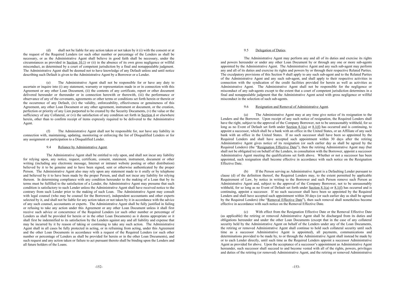 shall not be liable for any action taken or not taken by it (i) with the consent or at(d) the request of the Required Lenders (or such other number or percentage of the Lenders as shall be necessary, or as the Administrative Agent shall believe in good faith shall be necessary, under the circumstances as provided in Section 10.1) or (ii) in the absence of its own gross negligence or willful misconduct, as determined by a court of competent jurisdiction by a final and nonappealable judgment. The Administrative Agent shall be deemed not to have knowledge of any Default unless and until notice describing such Default is given to the Administrative Agent by a Borrower or a Lender. The Administrative Agent shall not be responsible for or have any duty to(e) ascertain or inquire into (i) any statement, warranty or representation made in or in connection with this Agreement or any other Loan Document, (ii) the contents of any certificate, report or other document delivered hereunder or thereunder or in connection herewith or therewith, (iii) the performance or observance of any of the covenants, agreements or other terms or conditions set forth herein or therein or the occurrence of any Default, (iv) the validity, enforceability, effectiveness or genuineness of this Agreement, any other Loan Document or any other agreement, instrument or document, or the creation, perfection or priority of any Lien purported to be created by the Security Documents, (v) the value or the sufficiency of any Collateral, or (vi) the satisfaction of any condition set forth in Section 4 or elsewhere herein, other than to confirm receipt of items expressly required to be delivered to the Administrative Agent. The Administrative Agent shall not be responsible for, nor have any liability in(f) connection with, maintaining, updating, monitoring or enforcing the list of Disqualified Lenders or for any assignment or participation to a Disqualified Lender. Reliance by Administrative Agent.9.4 The Administrative Agent shall be entitled to rely upon, and shall not incur any liability for relying upon, any notice, request, certificate, consent, statement, instrument, document or other writing (including any electronic message, Internet or intranet website posting or other distribution) believed by it to be genuine and to have been signed, sent or otherwise authenticated by the proper Person. The Administrative Agent also may rely upon any statement made to it orally or by telephone and believed by it to have been made by the proper Person, and shall not incur any liability for relying thereon. In determining compliance with any condition hereunder to the making of a Loan that by its terms must be fulfilled to the satisfaction of a Lender, the Administrative Agent may presume that such condition is satisfactory to such Lender unless the Administrative Agent shall have received notice to the contrary from such Lender prior to the making of such Loan. The Administrative Agent may consult with legal counsel (who may be counsel for the Borrower), independent accountants and other experts selected by it, and shall not be liable for any action taken or not taken by it in accordance with the advice of any such counsel, accountants or experts. The Administrative Agent shall be fully justified in failing or refusing to take any action under this Agreement or any other Loan Document unless it shall first receive such advice or concurrence of the Required Lenders (or such other number or percentage of Lenders as shall be provided for herein or in the other Loan Documents) as it deems appropriate or it shall first be indemnified to its satisfaction by the Lenders against any and all liability and expense that may be incurred by it by reason of taking or continuing to take any such action. The Administrative Agent shall in all cases be fully protected in acting, or in refraining from acting, under this Agreement and the other Loan Documents in accordance with a request of the Required Lenders (or such other number or percentage of Lenders as shall be provided for herein or in the other Loan Documents), and such request and any action taken or failure to act pursuant thereto shall be binding upon the Lenders and all future holders of the Loans. -152- Delegation of Duties.9.5 The Administrative Agent may perform any and all of its duties and exercise its rights and powers hereunder or under any other Loan Document by or through any one or more sub-agents appointed by the Administrative Agent. The Administrative Agent and any such sub-agent may perform any and all of its duties and exercise its rights and powers by or through their respective Related Parties. The exculpatory provisions of this Section 9 shall apply to any such sub-agent and to the Related Parties of the Administrative Agent and any such sub-agent, and shall apply to their respective activities in connection with the syndication of the credit facilities provided for herein as well as activities as Administrative Agent. The Administrative Agent shall not be responsible for the negligence or misconduct of any sub-agents except to the extent that a court of competent jurisdiction determines in a final and nonappealable judgment that the Administrative Agent acted with gross negligence or willful misconduct in the selection of such sub-agents. Resignation and Removal of Administrative Agent.9.6 The Administrative Agent may at any time give notice of its resignation to the(a) Lenders and the Borrower. Upon receipt of any such notice of resignation, the Required Lenders shall have the right, subject to the approval of the Company Borrower, not to be unreasonably withheld, for so long as no Event of Default set forth under Section 8.1(a) or 8.1(f) has occurred and is continuing, to appoint a successor, which shall be a bank with an office in the United States, or an Affiliate of any such bank with an office in the United States. If no such successor shall have been so appointed by the 