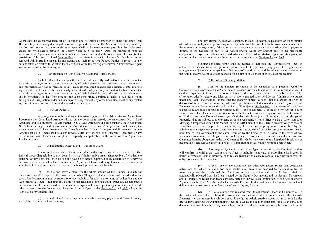 Agent shall be discharged from all of its duties and obligations hereunder or under the other Loan Documents (if not already discharged therefrom as provided above in this Section). The fees payable by the Borrower to a successor Administrative Agent shall be the same as those payable to its predecessor unless otherwise agreed between the Borrower and such successor. After the retiring or removed Administrative Agent’s resignation or removal hereunder and under the other Loan Documents, the provisions of this Section 9 and Section 10.5 shall continue in effect for the benefit of such retiring or removed Administrative Agent, its sub agents and their respective Related Parties in respect of any actions taken or omitted to be taken by any of them while the retiring or removed Administrative Agent was acting as Administrative Agent. Non-Reliance on Administrative Agent and Other Lenders.9.7 Each Lender acknowledges that it has, independently and without reliance upon the Administrative Agent or any other Lender or any of their Related Parties and based on such documents and information as it has deemed appropriate, made its own credit analysis and decision to enter into this Agreement. Each Lender also acknowledges that it will, independently and without reliance upon the Administrative Agent or any other Lender or any of their Related Parties and based on such documents and information as it shall from time to time deem appropriate, continue to make its own decisions in taking or not taking action under or based upon this Agreement, any other Loan Document or any related agreement or any document furnished hereunder or thereunder. No Other Duties, Etc.9.8 Anything herein to the contrary notwithstanding, none of the Administrative Agent, Joint Bookrunners or Joint Lead Arrangers listed on the cover page hereof, the Amendment No. 1 Lead Arrangers and Bookrunners, the Amendment No. 2 Lead Arrangers and Bookrunners, the Amendment No. 3 Lead Arrangers and Bookrunners, the Amendment No. 4 Lead Arrangers and Bookrunners, the Amendment No. 5 Lead Arrangers, the Amendment No. 6 Lead Arrangers and Bookrunners or the Amendment No. 6 Agents shall have any powers, duties or responsibilities under this Agreement or any of the other Loan Documents, except in its capacity, as applicable, as the Administrative Agent or a Lender hereunder. Administrative Agent May File Proofs of Claim.9.9 In case of the pendency of any proceeding under any Debtor Relief Law or any other judicial proceeding relative to any Loan Party, the Administrative Agent (irrespective of whether the principal of any Loan shall then be due and payable as herein expressed or by declaration or otherwise and irrespective of whether the Administrative Agent shall have made any demand on the Borrower) shall be entitled and empowered, by intervention in such proceeding or otherwise: to file and prove a claim for the whole amount of the principal and interest(a) owing and unpaid in respect of the Loans and all other Obligations that are owing and unpaid and to file such other documents as may be necessary or advisable in order to have the claims of the Lenders and the Administrative Agent (including any claim for the reasonable compensation, expenses, disbursements and advances of the Lenders and the Administrative Agent and their respective agents and counsel and all other amounts due the Lenders and the Administrative Agent under Sections 2.8 and 10.5) allowed in such judicial proceeding; and to collect and receive any monies or other property payable or deliverable on any(b) such claims and to distribute the same; -154- and any custodian, receiver, assignee, trustee, liquidator, sequestrator or other similar official in any such judicial proceeding is hereby authorized by each Lender to make such payments to the Administrative Agent and, if the Administrative Agent shall consent to the making of such payments directly to the Lenders, to pay to the Administrative Agent any amount due for the reasonable compensation, expenses, disbursements and advances of the Administrative Agent and its agents and counsel, and any other amounts due the Administrative Agent under Sections 2.8 and 10.5. Nothing contained herein shall be deemed to authorize the Administrative Agent to authorize or consent to or accept or adopt on behalf of any Lender any plan of reorganization, arrangement, adjustment or composition affecting the Obligations or the rights of any Lender to authorize the Administrative Agent to vote in respect of the claim of any Lender or in any such proceeding. Collateral and Guaranty Matters.9.10 Each of the Lenders (including in its capacities as a potential Qualified(a) Counterparty and a potential Cash Management Provider) irrevocably authorize the Administrative Agent (without requirement of notice to or consent of any Lender except as expressly required by Section 10.1): (i) to automatically release any Lien on any property granted to or held by the Administrative Agent under any Loan Document (1) at the time the property subject to such Lien is disposed of or to be disposed of as part of or in connection with any disposition permitted hereunder or under any other Loan Document to any Person other than a Loan Party, (2) subject to Section 10.1, if the release of such Lien is approved, authorized or ratified in writing by the Required Lenders, (3) if the property subject to such Lien is owned by a Guarantor, upon release of such Guarantor from its obligations under the Guarantee or (4) that constitutes Excluded Assets; provided, that this clause (4) shall not apply to any Mortgaged Properties that are subject to a Mortgage as of the Amendment No. 6 Effective Date other than such Mortgaged Properties with a Fair Market Value of $10,000,000 or less; (ii) to automatically release or subordinate, as expressly permitted hereunder, any Lien on any property granted to or held by the Administrative Agent under any Loan Document to the holder of 