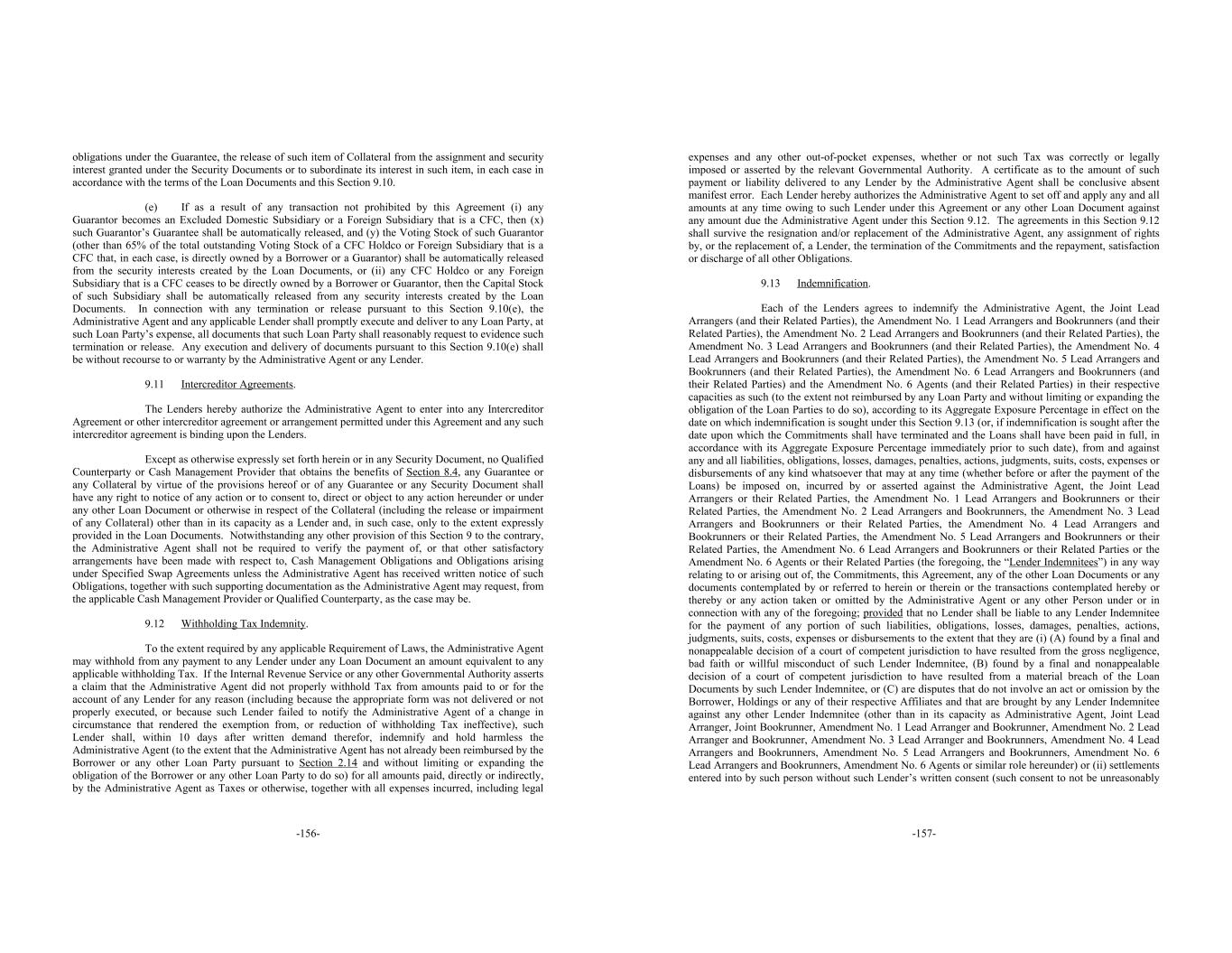 obligations under the Guarantee, the release of such item of Collateral from the assignment and security interest granted under the Security Documents or to subordinate its interest in such item, in each case in accordance with the terms of the Loan Documents and this Section 9.10. If as a result of any transaction not prohibited by this Agreement (i) any(e) Guarantor becomes an Excluded Domestic Subsidiary or a Foreign Subsidiary that is a CFC, then (x) such Guarantor’s Guarantee shall be automatically released, and (y) the Voting Stock of such Guarantor (other than 65% of the total outstanding Voting Stock of a CFC Holdco or Foreign Subsidiary that is a CFC that, in each case, is directly owned by a Borrower or a Guarantor) shall be automatically released from the security interests created by the Loan Documents, or (ii) any CFC Holdco or any Foreign Subsidiary that is a CFC ceases to be directly owned by a Borrower or Guarantor, then the Capital Stock of such Subsidiary shall be automatically released from any security interests created by the Loan Documents. In connection with any termination or release pursuant to this Section 9.10(e), the Administrative Agent and any applicable Lender shall promptly execute and deliver to any Loan Party, at such Loan Party’s expense, all documents that such Loan Party shall reasonably request to evidence such termination or release. Any execution and delivery of documents pursuant to this Section 9.10(e) shall be without recourse to or warranty by the Administrative Agent or any Lender. Intercreditor Agreements.9.11 The Lenders hereby authorize the Administrative Agent to enter into any Intercreditor Agreement or other intercreditor agreement or arrangement permitted under this Agreement and any such intercreditor agreement is binding upon the Lenders. Except as otherwise expressly set forth herein or in any Security Document, no Qualified Counterparty or Cash Management Provider that obtains the benefits of Section 8.4, any Guarantee or any Collateral by virtue of the provisions hereof or of any Guarantee or any Security Document shall have any right to notice of any action or to consent to, direct or object to any action hereunder or under any other Loan Document or otherwise in respect of the Collateral (including the release or impairment of any Collateral) other than in its capacity as a Lender and, in such case, only to the extent expressly provided in the Loan Documents. Notwithstanding any other provision of this Section 9 to the contrary, the Administrative Agent shall not be required to verify the payment of, or that other satisfactory arrangements have been made with respect to, Cash Management Obligations and Obligations arising under Specified Swap Agreements unless the Administrative Agent has received written notice of such Obligations, together with such supporting documentation as the Administrative Agent may request, from the applicable Cash Management Provider or Qualified Counterparty, as the case may be. Withholding Tax Indemnity.9.12 To the extent required by any applicable Requirement of Laws, the Administrative Agent may withhold from any payment to any Lender under any Loan Document an amount equivalent to any applicable withholding Tax. If the Internal Revenue Service or any other Governmental Authority asserts a claim that the Administrative Agent did not properly withhold Tax from amounts paid to or for the account of any Lender for any reason (including because the appropriate form was not delivered or not properly executed, or because such Lender failed to notify the Administrative Agent of a change in circumstance that rendered the exemption from, or reduction of withholding Tax ineffective), such Lender shall, within 10 days after written demand therefor, indemnify and hold harmless the Administrative Agent (to the extent that the Administrative Agent has not already been reimbursed by the Borrower or any other Loan Party pursuant to Section 2.14 and without limiting or expanding the obligation of the Borrower or any other Loan Party to do so) for all amounts paid, directly or indirectly, by the Administrative Agent as Taxes or otherwise, together with all expenses incurred, including legal -156- expenses and any other out-of-pocket expenses, whether or not such Tax was correctly or legally imposed or asserted by the relevant Governmental Authority. A certificate as to the amount of such payment or liability delivered to any Lender by the Administrative Agent shall be conclusive absent manifest error. Each Lender hereby authorizes the Administrative Agent to set off and apply any and all amounts at any time owing to such Lender under this Agreement or any other Loan Document against any amount due the Administrative Agent under this Section 9.12. The agreements in this Section 9.12 shall survive the resignation and/or replacement of the Administrative Agent, any assignment of rights by, or the replacement of, a Lender, the termination of the Commitments and the repayment, satisfaction or discharge of all other Obligations. Indemnification.9.13 Each of the Lenders agrees to indemnify the Administrative Agent, the Joint Lead Arrangers (and their Related Parties), the Amendment No. 1 Lead Arrangers and Bookrunners (and their Related Parties), the Amendment No. 2 Lead Arrangers and Bookrunners (and their Related Parties), the Amendment No. 3 Lead Arrangers and Bookrunners (and their Related Parties), the Amendment No. 4 Lead Arrangers and Bookrunners (and their Related Parties), the Amendment No. 5 Lead Arrangers and Bookrunners (and their Related Parties), the Amendment No. 6 Lead Arrangers and Bookrunners (and their Related Parties) and the Amendment No. 6 Agents (and their Related Parties) in their respective capacities as such (to the extent not reimbursed by any Loan Party and without limiting or expanding the obligation of the Loan Parties to do so), according to its Aggregate Exposure Percentage in effect on t