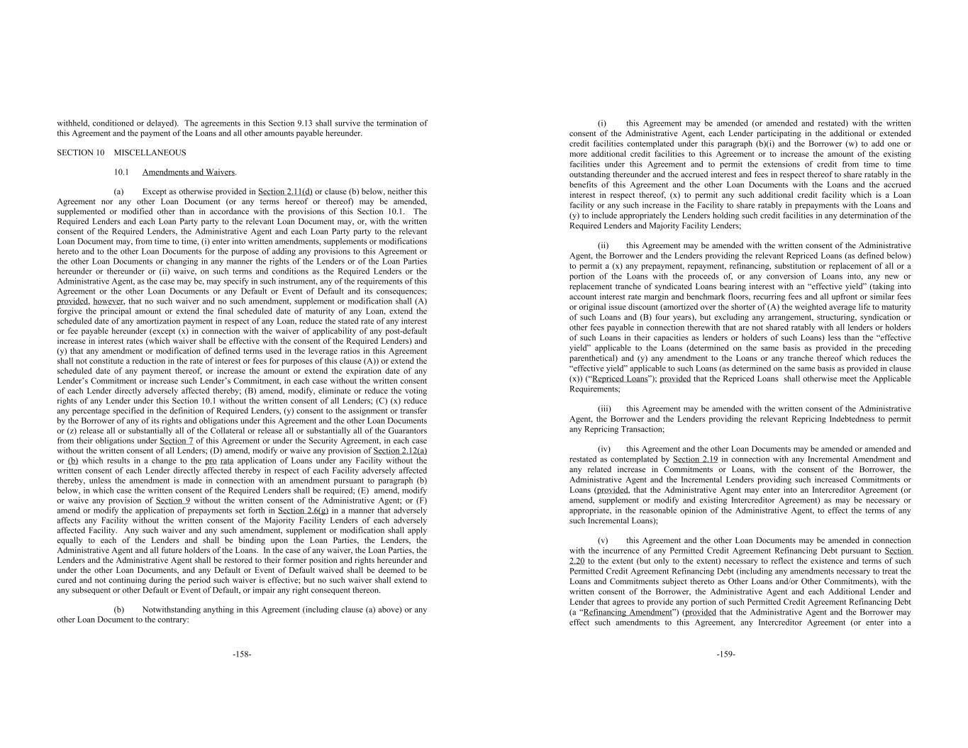 withheld, conditioned or delayed). The agreements in this Section 9.13 shall survive the termination of this Agreement and the payment of the Loans and all other amounts payable hereunder. MISCELLANEOUSSECTION 10 Amendments and Waivers.10.1 Except as otherwise provided in Section 2.11(d) or clause (b) below, neither this(a) Agreement nor any other Loan Document (or any terms hereof or thereof) may be amended, supplemented or modified other than in accordance with the provisions of this Section 10.1. The Required Lenders and each Loan Party party to the relevant Loan Document may, or, with the written consent of the Required Lenders, the Administrative Agent and each Loan Party party to the relevant Loan Document may, from time to time, (i) enter into written amendments, supplements or modifications hereto and to the other Loan Documents for the purpose of adding any provisions to this Agreement or the other Loan Documents or changing in any manner the rights of the Lenders or of the Loan Parties hereunder or thereunder or (ii) waive, on such terms and conditions as the Required Lenders or the Administrative Agent, as the case may be, may specify in such instrument, any of the requirements of this Agreement or the other Loan Documents or any Default or Event of Default and its consequences; provided, however, that no such waiver and no such amendment, supplement or modification shall (A) forgive the principal amount or extend the final scheduled date of maturity of any Loan, extend the scheduled date of any amortization payment in respect of any Loan, reduce the stated rate of any interest or fee payable hereunder (except (x) in connection with the waiver of applicability of any post-default increase in interest rates (which waiver shall be effective with the consent of the Required Lenders) and (y) that any amendment or modification of defined terms used in the leverage ratios in this Agreement shall not constitute a reduction in the rate of interest or fees for purposes of this clause (A)) or extend the scheduled date of any payment thereof, or increase the amount or extend the expiration date of any Lender’s Commitment or increase such Lender’s Commitment, in each case without the written consent of each Lender directly adversely affected thereby; (B) amend, modify, eliminate or reduce the voting rights of any Lender under this Section 10.1 without the written consent of all Lenders; (C) (x) reduce any percentage specified in the definition of Required Lenders, (y) consent to the assignment or transfer by the Borrower of any of its rights and obligations under this Agreement and the other Loan Documents or (z) release all or substantially all of the Collateral or release all or substantially all of the Guarantors from their obligations under Section 7 of this Agreement or under the Security Agreement, in each case without the written consent of all Lenders; (D) amend, modify or waive any provision of Section 2.12(a) or (b) which results in a change to the pro rata application of Loans under any Facility without the written consent of each Lender directly affected thereby in respect of each Facility adversely affected thereby, unless the amendment is made in connection with an amendment pursuant to paragraph (b) below, in which case the written consent of the Required Lenders shall be required; (E) amend, modify or waive any provision of Section 9 without the written consent of the Administrative Agent; or (F) amend or modify the application of prepayments set forth in Section 2.6(g) in a manner that adversely affects any Facility without the written consent of the Majority Facility Lenders of each adversely affected Facility. Any such waiver and any such amendment, supplement or modification shall apply equally to each of the Lenders and shall be binding upon the Loan Parties, the Lenders, the Administrative Agent and all future holders of the Loans. In the case of any waiver, the Loan Parties, the Lenders and the Administrative Agent shall be restored to their former position and rights hereunder and under the other Loan Documents, and any Default or Event of Default waived shall be deemed to be cured and not continuing during the period such waiver is effective; but no such waiver shall extend to any subsequent or other Default or Event of Default, or impair any right consequent thereon. Notwithstanding anything in this Agreement (including clause (a) above) or any(b) other Loan Document to the contrary: -158- this Agreement may be amended (or amended and restated) with the written(i) consent of the Administrative Agent, each Lender participating in the additional or extended credit facilities contemplated under this paragraph (b)(i) and the Borrower (w) to add one or more additional credit facilities to this Agreement or to increase the amount of the existing facilities under this Agreement and to permit the extensions of credit from time to time outstanding thereunder and the accrued interest and fees in respect thereof to share ratably in the benefits of this Agreement and the other Loan Documents with the Loans and the accrued interest in respect thereof, (x) to permit any such additional credit facility which is a Loan facility or any such increase in the Facility to share ratably in prepayments with the Loans and (y) to include appropriately the Lenders holding such credit facilities in any determination of the Required Lenders and Majority Facility Lenders; this Agreement may be amended with the written consent of the Administrative(ii) Agent, the Borrower and the Lenders providing the relevant Repriced Loans (as defined below) to permit a (x) any prepayment, repayment, refinancing, substitution or replacement of all or a portion of the Loans with the proceeds of, or any conversion of Loans into, any new or replacement tranche of syndicated Loans bearing interest with an “effective yield” (taking into account interest rate margin and benchmark floors, recurring fees an
