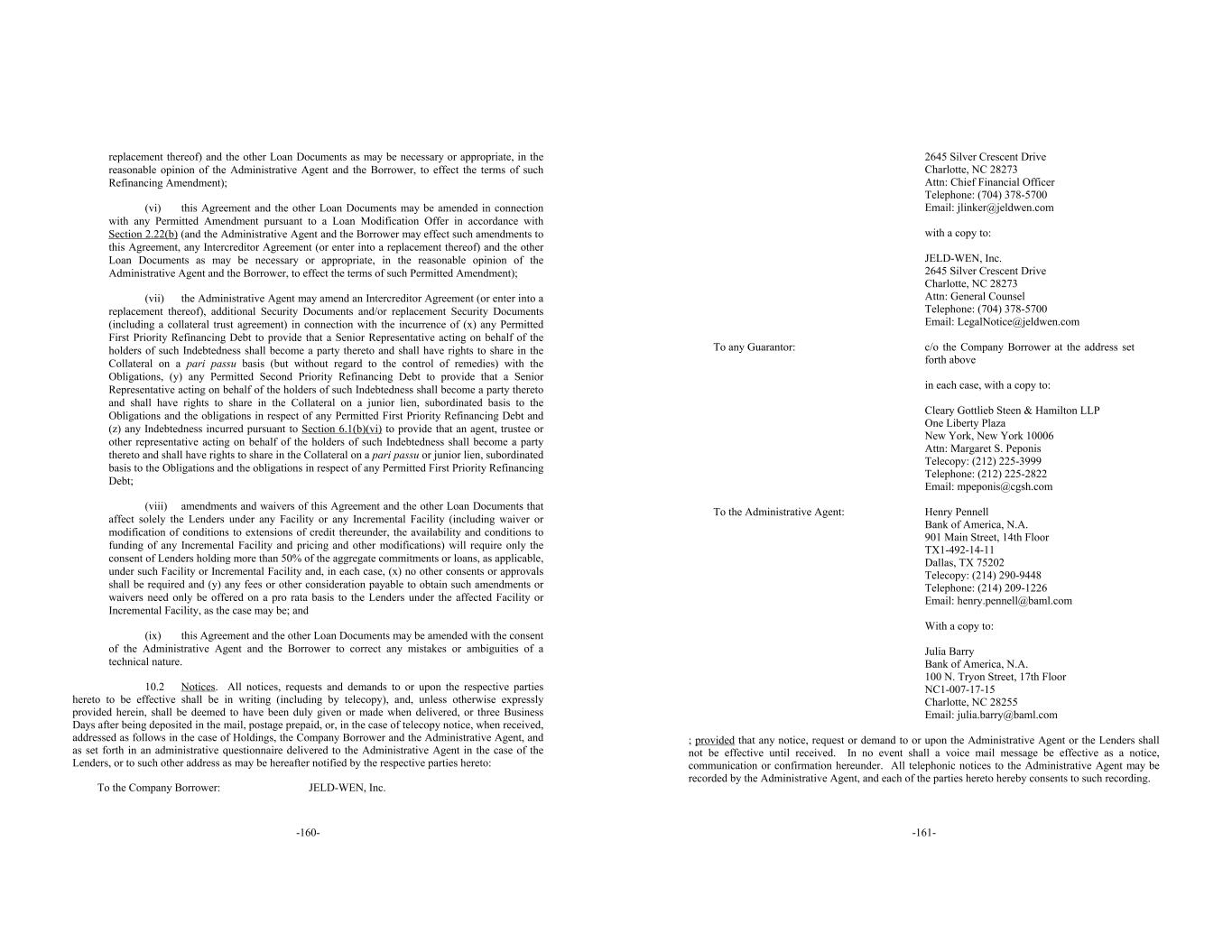 replacement thereof) and the other Loan Documents as may be necessary or appropriate, in the reasonable opinion of the Administrative Agent and the Borrower, to effect the terms of such Refinancing Amendment); this Agreement and the other Loan Documents may be amended in connection(vi) with any Permitted Amendment pursuant to a Loan Modification Offer in accordance with Section 2.22(b) (and the Administrative Agent and the Borrower may effect such amendments to this Agreement, any Intercreditor Agreement (or enter into a replacement thereof) and the other Loan Documents as may be necessary or appropriate, in the reasonable opinion of the Administrative Agent and the Borrower, to effect the terms of such Permitted Amendment); the Administrative Agent may amend an Intercreditor Agreement (or enter into a(vii) replacement thereof), additional Security Documents and/or replacement Security Documents (including a collateral trust agreement) in connection with the incurrence of (x) any Permitted First Priority Refinancing Debt to provide that a Senior Representative acting on behalf of the holders of such Indebtedness shall become a party thereto and shall have rights to share in the Collateral on a pari passu basis (but without regard to the control of remedies) with the Obligations, (y) any Permitted Second Priority Refinancing Debt to provide that a Senior Representative acting on behalf of the holders of such Indebtedness shall become a party thereto and shall have rights to share in the Collateral on a junior lien, subordinated basis to the Obligations and the obligations in respect of any Permitted First Priority Refinancing Debt and (z) any Indebtedness incurred pursuant to Section 6.1(b)(vi) to provide that an agent, trustee or other representative acting on behalf of the holders of such Indebtedness shall become a party thereto and shall have rights to share in the Collateral on a pari passu or junior lien, subordinated basis to the Obligations and the obligations in respect of any Permitted First Priority Refinancing Debt; amendments and waivers of this Agreement and the other Loan Documents that(viii) affect solely the Lenders under any Facility or any Incremental Facility (including waiver or modification of conditions to extensions of credit thereunder, the availability and conditions to funding of any Incremental Facility and pricing and other modifications) will require only the consent of Lenders holding more than 50% of the aggregate commitments or loans, as applicable, under such Facility or Incremental Facility and, in each case, (x) no other consents or approvals shall be required and (y) any fees or other consideration payable to obtain such amendments or waivers need only be offered on a pro rata basis to the Lenders under the affected Facility or Incremental Facility, as the case may be; and this Agreement and the other Loan Documents may be amended with the consent(ix) of the Administrative Agent and the Borrower to correct any mistakes or ambiguities of a technical nature. Notices. All notices, requests and demands to or upon the respective parties10.2 hereto to be effective shall be in writing (including by telecopy), and, unless otherwise expressly provided herein, shall be deemed to have been duly given or made when delivered, or three Business Days after being deposited in the mail, postage prepaid, or, in the case of telecopy notice, when received, addressed as follows in the case of Holdings, the Company Borrower and the Administrative Agent, and as set forth in an administrative questionnaire delivered to the Administrative Agent in the case of the Lenders, or to such other address as may be hereafter notified by the respective parties hereto: To the Company Borrower: JELD-WEN, Inc. -160- 2645 Silver Crescent Drive Charlotte, NC 28273 Attn: Chief Financial Officer Telephone: (704) 378-5700 Email: jlinker@jeldwen.com with a copy to: JELD-WEN, Inc. 2645 Silver Crescent Drive Charlotte, NC 28273 Attn: General Counsel Telephone: (704) 378-5700 Email: LegalNotice@jeldwen.com To any Guarantor: c/o the Company Borrower at the address set forth above in each case, with a copy to: Cleary Gottlieb Steen & Hamilton LLP One Liberty Plaza New York, New York 10006 Attn: Margaret S. Peponis Telecopy: (212) 225-3999 Telephone: (212) 225-2822 Email: mpeponis@cgsh.com To the Administrative Agent: Henry Pennell Bank of America, N.A. 901 Main Street, 14th Floor TX1-492-14-11 Dallas, TX 75202 Telecopy: (214) 290-9448 Telephone: (214) 209-1226 Email: henry.pennell@baml.com With a copy to: Julia Barry Bank of America, N.A. 100 N. Tryon Street, 17th Floor NC1-007-17-15 Charlotte, NC 28255 Email: julia.barry@baml.com ; provided that any notice, request or demand to or upon the Administrative Agent or the Lenders shall not be effective until received. In no event shall a voice mail message be effective as a notice, communication or confirmation hereunder. All telephonic notices to the Administrative Agent may be recorded by the Administrative Agent, and each of the parties hereto hereby consents to such recording. -161-