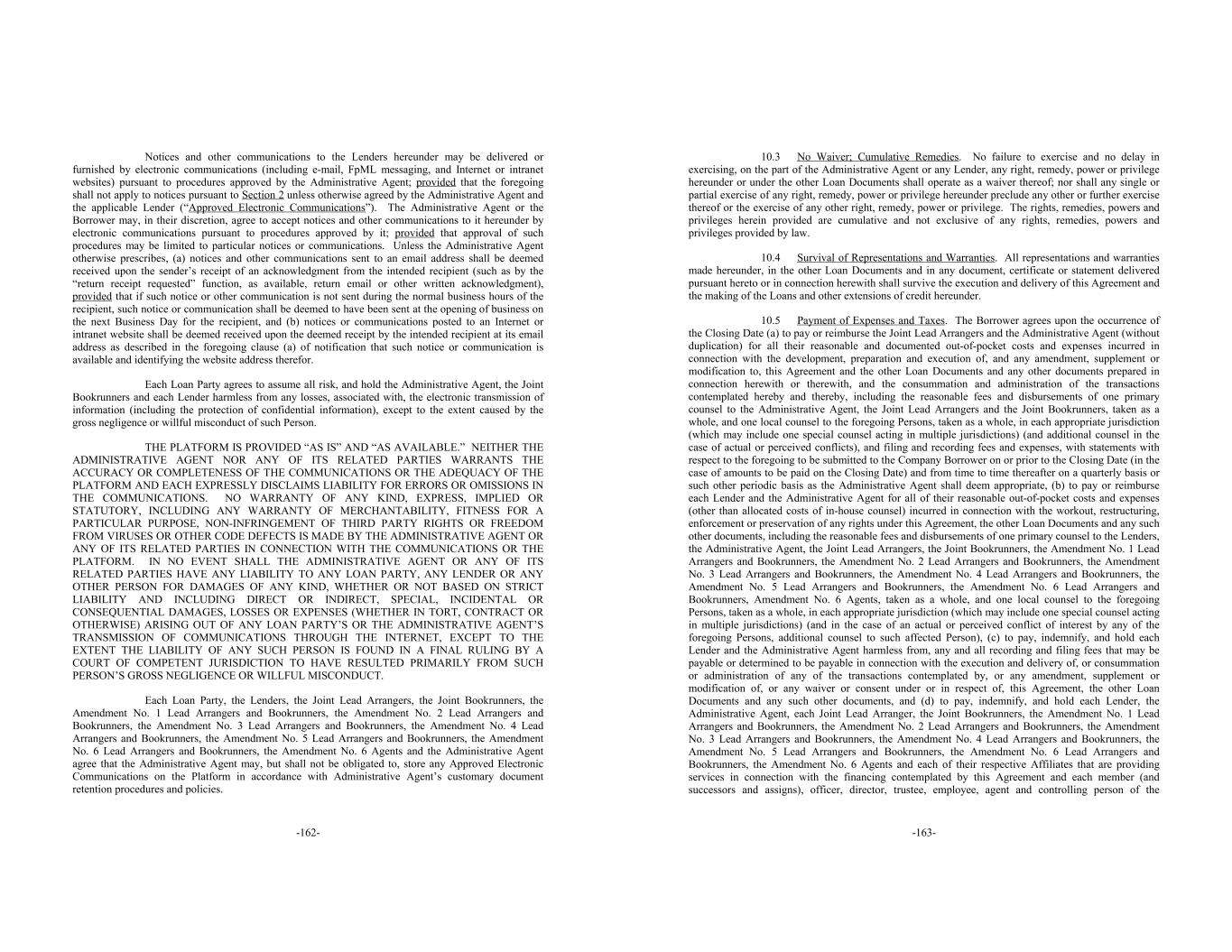 Notices and other communications to the Lenders hereunder may be delivered or furnished by electronic communications (including e-mail, FpML messaging, and Internet or intranet websites) pursuant to procedures approved by the Administrative Agent; provided that the foregoing shall not apply to notices pursuant to Section 2 unless otherwise agreed by the Administrative Agent and the applicable Lender (“Approved Electronic Communications”). The Administrative Agent or the Borrower may, in their discretion, agree to accept notices and other communications to it hereunder by electronic communications pursuant to procedures approved by it; provided that approval of such procedures may be limited to particular notices or communications. Unless the Administrative Agent otherwise prescribes, (a) notices and other communications sent to an email address shall be deemed received upon the sender’s receipt of an acknowledgment from the intended recipient (such as by the “return receipt requested” function, as available, return email or other written acknowledgment), provided that if such notice or other communication is not sent during the normal business hours of the recipient, such notice or communication shall be deemed to have been sent at the opening of business on the next Business Day for the recipient, and (b) notices or communications posted to an Internet or intranet website shall be deemed received upon the deemed receipt by the intended recipient at its email address as described in the foregoing clause (a) of notification that such notice or communication is available and identifying the website address therefor. Each Loan Party agrees to assume all risk, and hold the Administrative Agent, the Joint Bookrunners and each Lender harmless from any losses, associated with, the electronic transmission of information (including the protection of confidential information), except to the extent caused by the gross negligence or willful misconduct of such Person. THE PLATFORM IS PROVIDED “AS IS” AND “AS AVAILABLE.” NEITHER THE ADMINISTRATIVE AGENT NOR ANY OF ITS RELATED PARTIES WARRANTS THE ACCURACY OR COMPLETENESS OF THE COMMUNICATIONS OR THE ADEQUACY OF THE PLATFORM AND EACH EXPRESSLY DISCLAIMS LIABILITY FOR ERRORS OR OMISSIONS IN THE COMMUNICATIONS. NO WARRANTY OF ANY KIND, EXPRESS, IMPLIED OR STATUTORY, INCLUDING ANY WARRANTY OF MERCHANTABILITY, FITNESS FOR A PARTICULAR PURPOSE, NON-INFRINGEMENT OF THIRD PARTY RIGHTS OR FREEDOM FROM VIRUSES OR OTHER CODE DEFECTS IS MADE BY THE ADMINISTRATIVE AGENT OR ANY OF ITS RELATED PARTIES IN CONNECTION WITH THE COMMUNICATIONS OR THE PLATFORM. IN NO EVENT SHALL THE ADMINISTRATIVE AGENT OR ANY OF ITS RELATED PARTIES HAVE ANY LIABILITY TO ANY LOAN PARTY, ANY LENDER OR ANY OTHER PERSON FOR DAMAGES OF ANY KIND, WHETHER OR NOT BASED ON STRICT LIABILITY AND INCLUDING DIRECT OR INDIRECT, SPECIAL, INCIDENTAL OR CONSEQUENTIAL DAMAGES, LOSSES OR EXPENSES (WHETHER IN TORT, CONTRACT OR OTHERWISE) ARISING OUT OF ANY LOAN PARTY’S OR THE ADMINISTRATIVE AGENT’S TRANSMISSION OF COMMUNICATIONS THROUGH THE INTERNET, EXCEPT TO THE EXTENT THE LIABILITY OF ANY SUCH PERSON IS FOUND IN A FINAL RULING BY A COURT OF COMPETENT JURISDICTION TO HAVE RESULTED PRIMARILY FROM SUCH PERSON’S GROSS NEGLIGENCE OR WILLFUL MISCONDUCT. Each Loan Party, the Lenders, the Joint Lead Arrangers, the Joint Bookrunners, the Amendment No. 1 Lead Arrangers and Bookrunners, the Amendment No. 2 Lead Arrangers and Bookrunners, the Amendment No. 3 Lead Arrangers and Bookrunners, the Amendment No. 4 Lead Arrangers and Bookrunners, the Amendment No. 5 Lead Arrangers and Bookrunners, the Amendment No. 6 Lead Arrangers and Bookrunners, the Amendment No. 6 Agents and the Administrative Agent agree that the Administrative Agent may, but shall not be obligated to, store any Approved Electronic Communications on the Platform in accordance with Administrative Agent’s customary document retention procedures and policies. -162- No Waiver; Cumulative Remedies. No failure to exercise and no delay in10.3 exercising, on the part of the Administrative Agent or any Lender, any right, remedy, power or privilege hereunder or under the other Loan Documents shall operate as a waiver thereof; nor shall any single or partial exercise of any right, remedy, power or privilege hereunder preclude any other or further exercise thereof or the exercise of any other right, remedy, power or privilege. The rights, remedies, powers and privileges herein provided are cumulative and not exclusive of any rights, remedies, powers and privileges provided by law. Survival of Representations and Warranties. All representations and warranties10.4 made hereunder, in the other Loan Documents and in any document, certificate or statement delivered pursuant hereto or in connection herewith shall survive the execution and delivery of this Agreement and the making of the Loans and other extensions of credit hereunder. Payment of Expenses and Taxes. The Borrower agrees upon the occurrence of10.5 the Closing Date (a) to pay or reimburse the Joint Lead Arrangers and the Administrative Agent (without duplication) for all their reasonable and documented out-of-pocket costs and expenses incurred in connection with the development, preparation and execution of, and any amendment, supplement or modification to, this Agreement and the other Loan Documents and any other documents prepared in connection herewith or therewith, and the consummation and administration of the transactions contemplated hereby and thereby, including the reasonable fees and disbursements of one primary counsel to the Administrative Agent, the Joint Lead Arrangers and the Joint Bookrunners, taken as a whole, and one local counsel to the foregoing Persons, taken as a whole, in each appropriate jurisdiction (which may include one special counsel acting in multiple jurisdictions) (and additional counsel in the case of actual or perceived conflicts), and filing and 