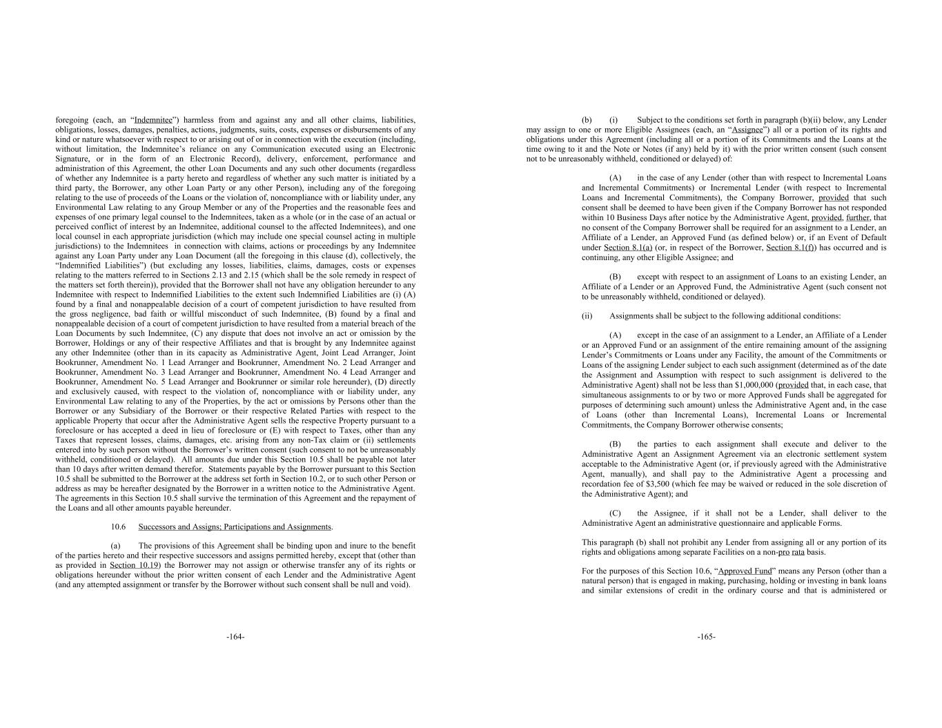 foregoing (each, an “Indemnitee”) harmless from and against any and all other claims, liabilities, obligations, losses, damages, penalties, actions, judgments, suits, costs, expenses or disbursements of any kind or nature whatsoever with respect to or arising out of or in connection with the execution (including, without limitation, the Indemnitee’s reliance on any Communication executed using an Electronic Signature, or in the form of an Electronic Record), delivery, enforcement, performance and administration of this Agreement, the other Loan Documents and any such other documents (regardless of whether any Indemnitee is a party hereto and regardless of whether any such matter is initiated by a third party, the Borrower, any other Loan Party or any other Person), including any of the foregoing relating to the use of proceeds of the Loans or the violation of, noncompliance with or liability under, any Environmental Law relating to any Group Member or any of the Properties and the reasonable fees and expenses of one primary legal counsel to the Indemnitees, taken as a whole (or in the case of an actual or perceived conflict of interest by an Indemnitee, additional counsel to the affected Indemnitees), and one local counsel in each appropriate jurisdiction (which may include one special counsel acting in multiple jurisdictions) to the Indemnitees in connection with claims, actions or proceedings by any Indemnitee against any Loan Party under any Loan Document (all the foregoing in this clause (d), collectively, the “Indemnified Liabilities”) (but excluding any losses, liabilities, claims, damages, costs or expenses relating to the matters referred to in Sections 2.13 and 2.15 (which shall be the sole remedy in respect of the matters set forth therein)), provided that the Borrower shall not have any obligation hereunder to any Indemnitee with respect to Indemnified Liabilities to the extent such Indemnified Liabilities are (i) (A) found by a final and nonappealable decision of a court of competent jurisdiction to have resulted from the gross negligence, bad faith or willful misconduct of such Indemnitee, (B) found by a final and nonappealable decision of a court of competent jurisdiction to have resulted from a material breach of the Loan Documents by such Indemnitee, (C) any dispute that does not involve an act or omission by the Borrower, Holdings or any of their respective Affiliates and that is brought by any Indemnitee against any other Indemnitee (other than in its capacity as Administrative Agent, Joint Lead Arranger, Joint Bookrunner, Amendment No. 1 Lead Arranger and Bookrunner, Amendment No. 2 Lead Arranger and Bookrunner, Amendment No. 3 Lead Arranger and Bookrunner, Amendment No. 4 Lead Arranger and Bookrunner, Amendment No. 5 Lead Arranger and Bookrunner or similar role hereunder), (D) directly and exclusively caused, with respect to the violation of, noncompliance with or liability under, any Environmental Law relating to any of the Properties, by the act or omissions by Persons other than the Borrower or any Subsidiary of the Borrower or their respective Related Parties with respect to the applicable Property that occur after the Administrative Agent sells the respective Property pursuant to a foreclosure or has accepted a deed in lieu of foreclosure or (E) with respect to Taxes, other than any Taxes that represent losses, claims, damages, etc. arising from any non-Tax claim or (ii) settlements entered into by such person without the Borrower’s written consent (such consent to not be unreasonably withheld, conditioned or delayed). All amounts due under this Section 10.5 shall be payable not later than 10 days after written demand therefor. Statements payable by the Borrower pursuant to this Section 10.5 shall be submitted to the Borrower at the address set forth in Section 10.2, or to such other Person or address as may be hereafter designated by the Borrower in a written notice to the Administrative Agent. The agreements in this Section 10.5 shall survive the termination of this Agreement and the repayment of the Loans and all other amounts payable hereunder. Successors and Assigns; Participations and Assignments.10.6 The provisions of this Agreement shall be binding upon and inure to the benefit(a) of the parties hereto and their respective successors and assigns permitted hereby, except that (other than as provided in Section 10.19) the Borrower may not assign or otherwise transfer any of its rights or obligations hereunder without the prior written consent of each Lender and the Administrative Agent (and any attempted assignment or transfer by the Borrower without such consent shall be null and void). -164- (i) Subject to the conditions set forth in paragraph (b)(ii) below, any Lender(b) may assign to one or more Eligible Assignees (each, an “Assignee”) all or a portion of its rights and obligations under this Agreement (including all or a portion of its Commitments and the Loans at the time owing to it and the Note or Notes (if any) held by it) with the prior written consent (such consent not to be unreasonably withheld, conditioned or delayed) of: in the case of any Lender (other than with respect to Incremental Loans(A) and Incremental Commitments) or Incremental Lender (with respect to Incremental Loans and Incremental Commitments), the Company Borrower, provided that such consent shall be deemed to have been given if the Company Borrower has not responded within 10 Business Days after notice by the Administrative Agent, provided, further, that no consent of the Company Borrower shall be required for an assignment to a Lender, an Affiliate of a Lender, an Approved Fund (as defined below) or, if an Event of Default under Section 8.1(a) (or, in respect of the Borrower, Section 8.1(f)) has occurred and is continuing, any other Eligible Assignee; and except with respect to an assignment of Loans to an existing Lender, an(B) Affiliate of a Lender or an App