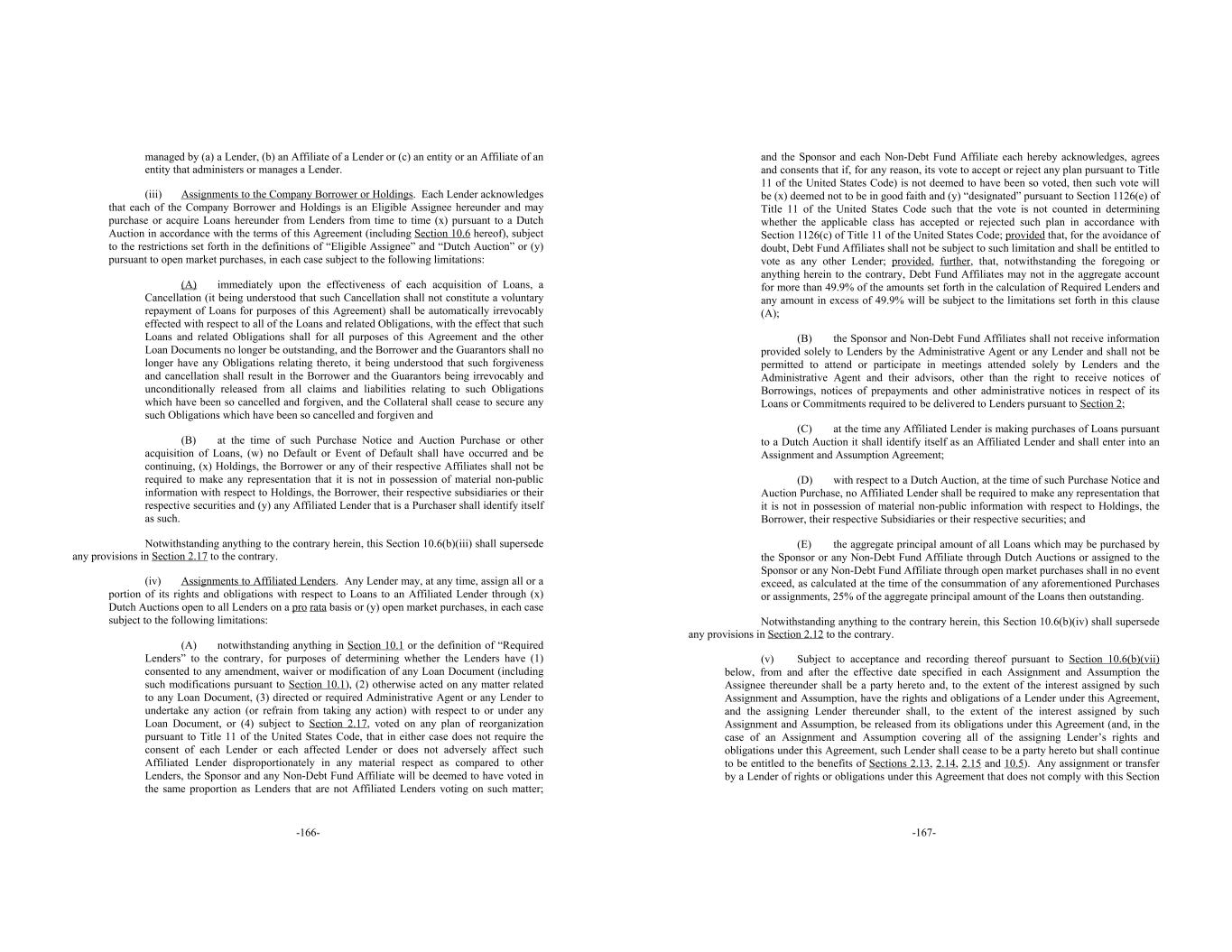 managed by (a) a Lender, (b) an Affiliate of a Lender or (c) an entity or an Affiliate of an entity that administers or manages a Lender. Assignments to the Company Borrower or Holdings. Each Lender acknowledges(iii) that each of the Company Borrower and Holdings is an Eligible Assignee hereunder and may purchase or acquire Loans hereunder from Lenders from time to time (x) pursuant to a Dutch Auction in accordance with the terms of this Agreement (including Section 10.6 hereof), subject to the restrictions set forth in the definitions of “Eligible Assignee” and “Dutch Auction” or (y) pursuant to open market purchases, in each case subject to the following limitations: immediately upon the effectiveness of each acquisition of Loans, a(A) Cancellation (it being understood that such Cancellation shall not constitute a voluntary repayment of Loans for purposes of this Agreement) shall be automatically irrevocably effected with respect to all of the Loans and related Obligations, with the effect that such Loans and related Obligations shall for all purposes of this Agreement and the other Loan Documents no longer be outstanding, and the Borrower and the Guarantors shall no longer have any Obligations relating thereto, it being understood that such forgiveness and cancellation shall result in the Borrower and the Guarantors being irrevocably and unconditionally released from all claims and liabilities relating to such Obligations which have been so cancelled and forgiven, and the Collateral shall cease to secure any such Obligations which have been so cancelled and forgiven and at the time of such Purchase Notice and Auction Purchase or other(B) acquisition of Loans, (w) no Default or Event of Default shall have occurred and be continuing, (x) Holdings, the Borrower or any of their respective Affiliates shall not be required to make any representation that it is not in possession of material non-public information with respect to Holdings, the Borrower, their respective subsidiaries or their respective securities and (y) any Affiliated Lender that is a Purchaser shall identify itself as such. Notwithstanding anything to the contrary herein, this Section 10.6(b)(iii) shall supersede any provisions in Section 2.17 to the contrary. Assignments to Affiliated Lenders. Any Lender may, at any time, assign all or a(iv) portion of its rights and obligations with respect to Loans to an Affiliated Lender through (x) Dutch Auctions open to all Lenders on a pro rata basis or (y) open market purchases, in each case subject to the following limitations: notwithstanding anything in Section 10.1 or the definition of “Required(A) Lenders” to the contrary, for purposes of determining whether the Lenders have (1) consented to any amendment, waiver or modification of any Loan Document (including such modifications pursuant to Section 10.1), (2) otherwise acted on any matter related to any Loan Document, (3) directed or required Administrative Agent or any Lender to undertake any action (or refrain from taking any action) with respect to or under any Loan Document, or (4) subject to Section 2.17, voted on any plan of reorganization pursuant to Title 11 of the United States Code, that in either case does not require the consent of each Lender or each affected Lender or does not adversely affect such Affiliated Lender disproportionately in any material respect as compared to other Lenders, the Sponsor and any Non-Debt Fund Affiliate will be deemed to have voted in the same proportion as Lenders that are not Affiliated Lenders voting on such matter; -166- and the Sponsor and each Non-Debt Fund Affiliate each hereby acknowledges, agrees and consents that if, for any reason, its vote to accept or reject any plan pursuant to Title 11 of the United States Code) is not deemed to have been so voted, then such vote will be (x) deemed not to be in good faith and (y) “designated” pursuant to Section 1126(e) of Title 11 of the United States Code such that the vote is not counted in determining whether the applicable class has accepted or rejected such plan in accordance with Section 1126(c) of Title 11 of the United States Code; provided that, for the avoidance of doubt, Debt Fund Affiliates shall not be subject to such limitation and shall be entitled to vote as any other Lender; provided, further, that, notwithstanding the foregoing or anything herein to the contrary, Debt Fund Affiliates may not in the aggregate account for more than 49.9% of the amounts set forth in the calculation of Required Lenders and any amount in excess of 49.9% will be subject to the limitations set forth in this clause (A); the Sponsor and Non-Debt Fund Affiliates shall not receive information(B) provided solely to Lenders by the Administrative Agent or any Lender and shall not be permitted to attend or participate in meetings attended solely by Lenders and the Administrative Agent and their advisors, other than the right to receive notices of Borrowings, notices of prepayments and other administrative notices in respect of its Loans or Commitments required to be delivered to Lenders pursuant to Section 2; at the time any Affiliated Lender is making purchases of Loans pursuant(C) to a Dutch Auction it shall identify itself as an Affiliated Lender and shall enter into an Assignment and Assumption Agreement; with respect to a Dutch Auction, at the time of such Purchase Notice and(D) Auction Purchase, no Affiliated Lender shall be required to make any representation that it is not in possession of material non-public information with respect to Holdings, the Borrower, their respective Subsidiaries or their respective securities; and the aggregate principal amount of all Loans which may be purchased by(E) the Sponsor or any Non-Debt Fund Affiliate through Dutch Auctions or assigned to the Sponsor or any Non-Debt Fund Affiliate through open market purchases shall in no event exceed, as calculated at the time of the consummation of any af