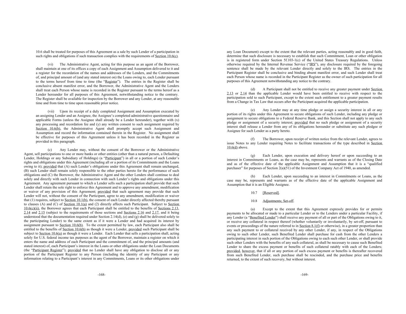 10.6 shall be treated for purposes of this Agreement as a sale by such Lender of a participation in such rights and obligations if such transaction complies with the requirements of Section 10.6(c). The Administrative Agent, acting for this purpose as an agent of the Borrower,(vi) shall maintain at one of its offices a copy of each Assignment and Assumption delivered to it and a register for the recordation of the names and addresses of the Lenders, and the Commitments of, and principal amount of (and any stated interest on) the Loans owing to, each Lender pursuant to the terms hereof from time to time (the “Register”). The entries in the Register shall be conclusive absent manifest error, and the Borrower, the Administrative Agent and the Lenders shall treat each Person whose name is recorded in the Register pursuant to the terms hereof as a Lender hereunder for all purposes of this Agreement, notwithstanding notice to the contrary. The Register shall be available for inspection by the Borrower and any Lender, at any reasonable time and from time to time upon reasonable prior notice. Upon its receipt of a duly completed Assignment and Assumption executed by(vii) an assigning Lender and an Assignee, the Assignee’s completed administrative questionnaire and applicable Forms (unless the Assignee shall already be a Lender hereunder), together with (x) any processing and recordation fee and (y) any written consent to such assignment required by Section 10.6(b), the Administrative Agent shall promptly accept such Assignment and Assumption and record the information contained therein in the Register. No assignment shall be effective for purposes of this Agreement unless it has been recorded in the Register as provided in this paragraph. Any Lender may, without the consent of the Borrower or the Administrative(c) Agent, sell participations to one or more banks or other entities (other than a natural person, a Defaulting Lender, Holdings or any Subsidiary of Holdings) (a “Participant”) in all or a portion of such Lender’s rights and obligations under this Agreement (including all or a portion of its Commitments and the Loans owing to it); provided that (A) such Lender’s obligations under this Agreement shall remain unchanged, (B) such Lender shall remain solely responsible to the other parties hereto for the performance of such obligations and (C) the Borrower, the Administrative Agent and the other Lenders shall continue to deal solely and directly with such Lender in connection with such Lender’s rights and obligations under this Agreement. Any agreement pursuant to which a Lender sells such a participation shall provide that such Lender shall retain the sole right to enforce this Agreement and to approve any amendment, modification or waiver of any provision of this Agreement; provided that such agreement may provide that such Lender will not, without the consent of the Participant, agree to any amendment, modification or waiver that (1) requires, subject to Section 10.1(b), the consent of each Lender directly affected thereby pursuant to clauses (A) and (C) of Section 10.1(a) and (2) directly affects such Participant. Subject to Section 10.6(c)(ii), the Borrower agrees that each Participant shall be entitled to the benefits of Sections 2.13, 2.14 and 2.15 (subject to the requirements of those sections and Sections 2.16 and 2.17, and it being understood that the documentation required under Section 2.14(d), (e) and (g) shall be delivered solely to the participating Lender) to the same extent as if it were a Lender and had acquired its interest by assignment pursuant to Section 10.6(b). To the extent permitted by law, each Participant also shall be entitled to the benefits of Section 10.6(b) as though it were a Lender, provided such Participant shall be subject to Section 10.6(a) as though it were a Lender. Each Lender that sells a participation shall, acting solely for U.S. federal income tax purposes as the agent of the Borrower, maintain a register on which it enters the name and address of each Participant and the commitment of, and the principal amounts (and stated interest) of, each Participant’s interest in the Loans or other obligations under the Loan Documents (the “Participant Register”); provided that no Lender shall have any obligation to disclose all or any portion of the Participant Register to any Person (including the identity of any Participant or any information relating to a Participant’s interest in any Commitments, Loans or its other obligations under -168- any Loan Document) except to the extent that the relevant parties, acting reasonably and in good faith, determine that such disclosure is necessary to establish that such Commitment, Loan or other obligation is in registered form under Section 5f.103-1(c) of the United States Treasury Regulations. Unless otherwise required by the Internal Revenue Service (“IRS”), any disclosure required by the foregoing sentence shall be made by the relevant Lender directly and solely to the IRS. The entries in the Participant Register shall be conclusive and binding absent manifest error, and such Lender shall treat each Person whose name is recorded in the Participant Register as the owner of such participation for all purposes of this Agreement notwithstanding any notice to the contrary. A Participant shall not be entitled to receive any greater payment under Section(d) 2.13 or 2.14 than the applicable Lender would have been entitled to receive with respect to the participation sold to such Participant, except to the extent such entitlement to a greater payment results from a Change in Tax Law that occurs after the Participant acquired the applicable participation. Any Lender may at any time pledge or assign a security interest in all or any(e) portion of its rights under this Agreement to secure obligations of such Lender, including any pledge or assignment to secure obligations to a Federal Reserve Bank,