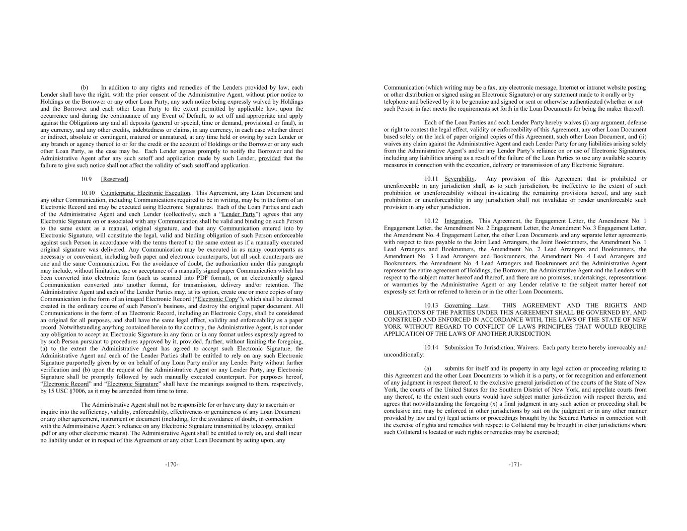 In addition to any rights and remedies of the Lenders provided by law, each(b) Lender shall have the right, with the prior consent of the Administrative Agent, without prior notice to Holdings or the Borrower or any other Loan Party, any such notice being expressly waived by Holdings and the Borrower and each other Loan Party to the extent permitted by applicable law, upon the occurrence and during the continuance of any Event of Default, to set off and appropriate and apply against the Obligations any and all deposits (general or special, time or demand, provisional or final), in any currency, and any other credits, indebtedness or claims, in any currency, in each case whether direct or indirect, absolute or contingent, matured or unmatured, at any time held or owing by such Lender or any branch or agency thereof to or for the credit or the account of Holdings or the Borrower or any such other Loan Party, as the case may be. Each Lender agrees promptly to notify the Borrower and the Administrative Agent after any such setoff and application made by such Lender, provided that the failure to give such notice shall not affect the validity of such setoff and application. [Reserved].10.9 Counterparts; Electronic Execution. This Agreement, any Loan Document and10.10 any other Communication, including Communications required to be in writing, may be in the form of an Electronic Record and may be executed using Electronic Signatures. Each of the Loan Parties and each of the Administrative Agent and each Lender (collectively, each a “Lender Party”) agrees that any Electronic Signature on or associated with any Communication shall be valid and binding on such Person to the same extent as a manual, original signature, and that any Communication entered into by Electronic Signature, will constitute the legal, valid and binding obligation of such Person enforceable against such Person in accordance with the terms thereof to the same extent as if a manually executed original signature was delivered. Any Communication may be executed in as many counterparts as necessary or convenient, including both paper and electronic counterparts, but all such counterparts are one and the same Communication. For the avoidance of doubt, the authorization under this paragraph may include, without limitation, use or acceptance of a manually signed paper Communication which has been converted into electronic form (such as scanned into PDF format), or an electronically signed Communication converted into another format, for transmission, delivery and/or retention. The Administrative Agent and each of the Lender Parties may, at its option, create one or more copies of any Communication in the form of an imaged Electronic Record (“Electronic Copy”), which shall be deemed created in the ordinary course of such Person’s business, and destroy the original paper document. All Communications in the form of an Electronic Record, including an Electronic Copy, shall be considered an original for all purposes, and shall have the same legal effect, validity and enforceability as a paper record. Notwithstanding anything contained herein to the contrary, the Administrative Agent, is not under any obligation to accept an Electronic Signature in any form or in any format unless expressly agreed to by such Person pursuant to procedures approved by it; provided, further, without limiting the foregoing, (a) to the extent the Administrative Agent has agreed to accept such Electronic Signature, the Administrative Agent and each of the Lender Parties shall be entitled to rely on any such Electronic Signature purportedly given by or on behalf of any Loan Party and/or any Lender Party without further verification and (b) upon the request of the Administrative Agent or any Lender Party, any Electronic Signature shall be promptly followed by such manually executed counterpart. For purposes hereof, “Electronic Record” and “Electronic Signature” shall have the meanings assigned to them, respectively, by 15 USC §7006, as it may be amended from time to time. The Administrative Agent shall not be responsible for or have any duty to ascertain or inquire into the sufficiency, validity, enforceability, effectiveness or genuineness of any Loan Document or any other agreement, instrument or document (including, for the avoidance of doubt, in connection with the Administrative Agent’s reliance on any Electronic Signature transmitted by telecopy, emailed .pdf or any other electronic means). The Administrative Agent shall be entitled to rely on, and shall incur no liability under or in respect of this Agreement or any other Loan Document by acting upon, any -170- Communication (which writing may be a fax, any electronic message, Internet or intranet website posting or other distribution or signed using an Electronic Signature) or any statement made to it orally or by telephone and believed by it to be genuine and signed or sent or otherwise authenticated (whether or not such Person in fact meets the requirements set forth in the Loan Documents for being the maker thereof). Each of the Loan Parties and each Lender Party hereby waives (i) any argument, defense or right to contest the legal effect, validity or enforceability of this Agreement, any other Loan Document based solely on the lack of paper original copies of this Agreement, such other Loan Document, and (ii) waives any claim against the Administrative Agent and each Lender Party for any liabilities arising solely from the Administrative Agent’s and/or any Lender Party’s reliance on or use of Electronic Signatures, including any liabilities arising as a result of the failure of the Loan Parties to use any available security measures in connection with the execution, delivery or transmission of any Electronic Signature. Severability. Any provision of this Agreement that is prohibited or10.11 unenforceable in any jurisdiction shall, as to such jurisdiction, be ineffective to the