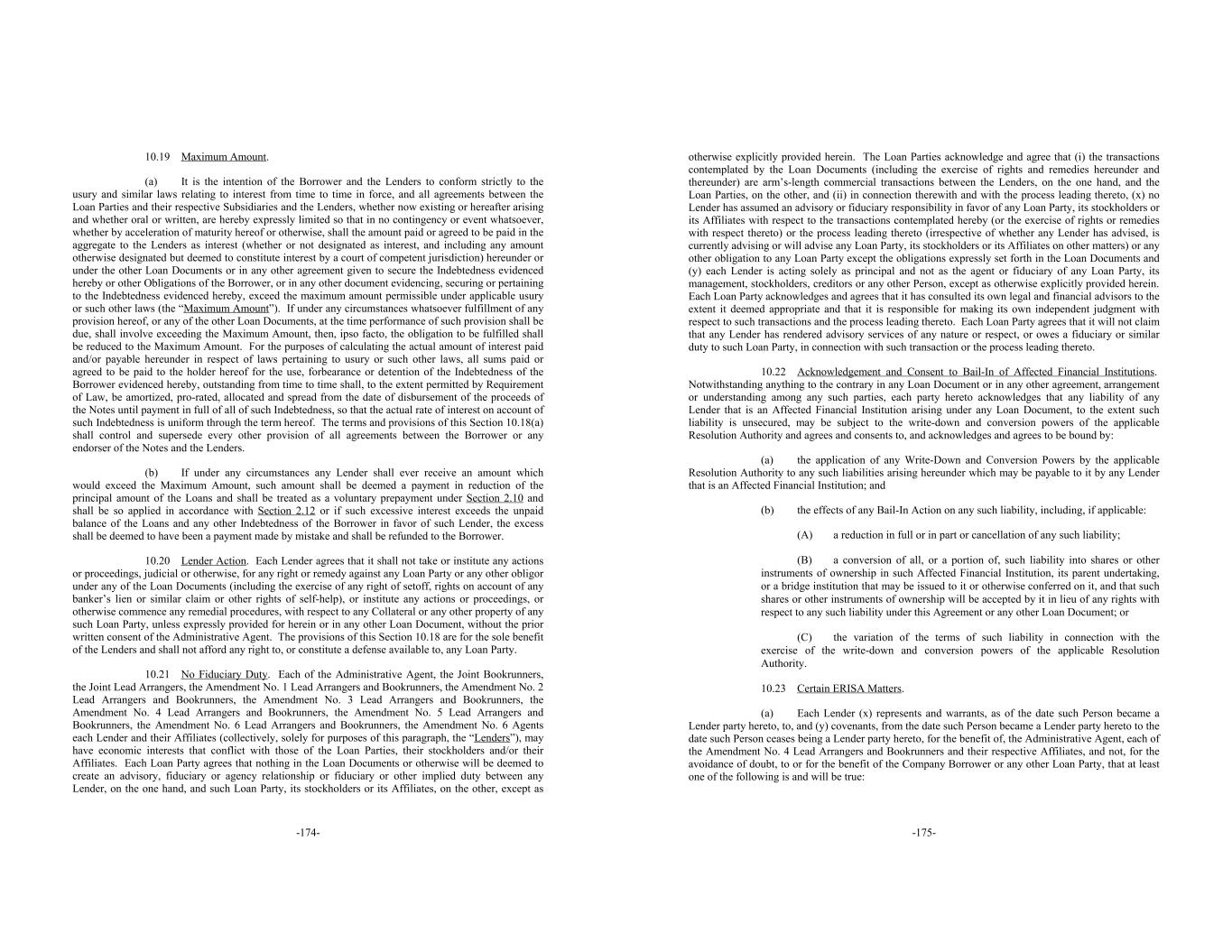 Maximum Amount.10.19 It is the intention of the Borrower and the Lenders to conform strictly to the(a) usury and similar laws relating to interest from time to time in force, and all agreements between the Loan Parties and their respective Subsidiaries and the Lenders, whether now existing or hereafter arising and whether oral or written, are hereby expressly limited so that in no contingency or event whatsoever, whether by acceleration of maturity hereof or otherwise, shall the amount paid or agreed to be paid in the aggregate to the Lenders as interest (whether or not designated as interest, and including any amount otherwise designated but deemed to constitute interest by a court of competent jurisdiction) hereunder or under the other Loan Documents or in any other agreement given to secure the Indebtedness evidenced hereby or other Obligations of the Borrower, or in any other document evidencing, securing or pertaining to the Indebtedness evidenced hereby, exceed the maximum amount permissible under applicable usury or such other laws (the “Maximum Amount”). If under any circumstances whatsoever fulfillment of any provision hereof, or any of the other Loan Documents, at the time performance of such provision shall be due, shall involve exceeding the Maximum Amount, then, ipso facto, the obligation to be fulfilled shall be reduced to the Maximum Amount. For the purposes of calculating the actual amount of interest paid and/or payable hereunder in respect of laws pertaining to usury or such other laws, all sums paid or agreed to be paid to the holder hereof for the use, forbearance or detention of the Indebtedness of the Borrower evidenced hereby, outstanding from time to time shall, to the extent permitted by Requirement of Law, be amortized, pro-rated, allocated and spread from the date of disbursement of the proceeds of the Notes until payment in full of all of such Indebtedness, so that the actual rate of interest on account of such Indebtedness is uniform through the term hereof. The terms and provisions of this Section 10.18(a) shall control and supersede every other provision of all agreements between the Borrower or any endorser of the Notes and the Lenders. If under any circumstances any Lender shall ever receive an amount which(b) would exceed the Maximum Amount, such amount shall be deemed a payment in reduction of the principal amount of the Loans and shall be treated as a voluntary prepayment under Section 2.10 and shall be so applied in accordance with Section 2.12 or if such excessive interest exceeds the unpaid balance of the Loans and any other Indebtedness of the Borrower in favor of such Lender, the excess shall be deemed to have been a payment made by mistake and shall be refunded to the Borrower. Lender Action. Each Lender agrees that it shall not take or institute any actions10.20 or proceedings, judicial or otherwise, for any right or remedy against any Loan Party or any other obligor under any of the Loan Documents (including the exercise of any right of setoff, rights on account of any banker’s lien or similar claim or other rights of self-help), or institute any actions or proceedings, or otherwise commence any remedial procedures, with respect to any Collateral or any other property of any such Loan Party, unless expressly provided for herein or in any other Loan Document, without the prior written consent of the Administrative Agent. The provisions of this Section 10.18 are for the sole benefit of the Lenders and shall not afford any right to, or constitute a defense available to, any Loan Party. No Fiduciary Duty. Each of the Administrative Agent, the Joint Bookrunners,10.21 the Joint Lead Arrangers, the Amendment No. 1 Lead Arrangers and Bookrunners, the Amendment No. 2 Lead Arrangers and Bookrunners, the Amendment No. 3 Lead Arrangers and Bookrunners, the Amendment No. 4 Lead Arrangers and Bookrunners, the Amendment No. 5 Lead Arrangers and Bookrunners, the Amendment No. 6 Lead Arrangers and Bookrunners, the Amendment No. 6 Agents each Lender and their Affiliates (collectively, solely for purposes of this paragraph, the “Lenders”), may have economic interests that conflict with those of the Loan Parties, their stockholders and/or their Affiliates. Each Loan Party agrees that nothing in the Loan Documents or otherwise will be deemed to create an advisory, fiduciary or agency relationship or fiduciary or other implied duty between any Lender, on the one hand, and such Loan Party, its stockholders or its Affiliates, on the other, except as -174- otherwise explicitly provided herein. The Loan Parties acknowledge and agree that (i) the transactions contemplated by the Loan Documents (including the exercise of rights and remedies hereunder and thereunder) are arm’s-length commercial transactions between the Lenders, on the one hand, and the Loan Parties, on the other, and (ii) in connection therewith and with the process leading thereto, (x) no Lender has assumed an advisory or fiduciary responsibility in favor of any Loan Party, its stockholders or its Affiliates with respect to the transactions contemplated hereby (or the exercise of rights or remedies with respect thereto) or the process leading thereto (irrespective of whether any Lender has advised, is currently advising or will advise any Loan Party, its stockholders or its Affiliates on other matters) or any other obligation to any Loan Party except the obligations expressly set forth in the Loan Documents and (y) each Lender is acting solely as principal and not as the agent or fiduciary of any Loan Party, its management, stockholders, creditors or any other Person, except as otherwise explicitly provided herein. Each Loan Party acknowledges and agrees that it has consulted its own legal and financial advisors to the extent it deemed appropriate and that it is responsible for making its own independent judgment with respect to such transactions and the process leading thereto. Each Loan Part