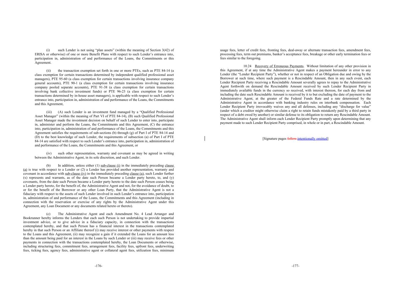 such Lender is not using “plan assets” (within the meaning of Section 3(42) of(i) ERISA or otherwise) of one or more Benefit Plans with respect to such Lender’s entrance into, participation in, administration of and performance of the Loans, the Commitments or this Agreement. the transaction exemption set forth in one or more PTEs, such as PTE 84-14 (a(ii) class exemption for certain transactions determined by independent qualified professional asset managers), PTE 95-60 (a class exemption for certain transactions involving insurance company general accounts), PTE 90-1 (a class exemption for certain transactions involving insurance company pooled separate accounts), PTE 91-38 (a class exemption for certain transactions involving bank collective investment funds) or PTE 96-23 (a class exemption for certain transactions determined by in-house asset managers), is applicable with respect to such Lender’s entrance into, participation in, administration of and performance of the Loans, the Commitments and this Agreement, (A) such Lender is an investment fund managed by a “Qualified Professional(iii) Asset Manager” (within the meaning of Part VI of PTE 84-14), (B) such Qualified Professional Asset Manager made the investment decision on behalf of such Lender to enter into, participate in, administer and perform the Loans, the Commitments and this Agreement, (C) the entrance into, participation in, administration of and performance of the Loans, the Commitments and this Agreement satisfies the requirements of sub-sections (b) through (g) of Part I of PTE 84-14 and (D) to the best knowledge of such Lender, the requirements of subsection (a) of Part I of PTE 84-14 are satisfied with respect to such Lender’s entrance into, participation in, administration of and performance of the Loans, the Commitments and this Agreement, or such other representation, warranty and covenant as may be agreed in writing(iv) between the Administrative Agent, in its sole discretion, and such Lender. In addition, unless either (1) sub-clause (i) in the immediately preceding clause(b) (a) is true with respect to a Lender or (2) a Lender has provided another representation, warranty and covenant in accordance with sub-clause (iv) in the immediately preceding clause (a), such Lender further (x) represents and warrants, as of the date such Person became a Lender party hereto, to, and (y) covenants, from the date such Person became a Lender party hereto to the date such Person ceases being a Lender party hereto, for the benefit of, the Administrative Agent and not, for the avoidance of doubt, to or for the benefit of the Borrower or any other Loan Party, that the Administrative Agent is not a fiduciary with respect to the assets of such Lender involved in such Lender’s entrance into, participation in, administration of and performance of the Loans, the Commitments and this Agreement (including in connection with the reservation or exercise of any rights by the Administrative Agent under this Agreement, any Loan Document or any documents related hereto or thereto). The Administrative Agent and each Amendment No. 4 Lead Arranger and(c) Bookrunner hereby informs the Lenders that each such Person is not undertaking to provide impartial investment advice, or to give advice in a fiduciary capacity, in connection with the transactions contemplated hereby, and that such Person has a financial interest in the transactions contemplated hereby in that such Person or an Affiliate thereof (i) may receive interest or other payments with respect to the Loans and this Agreement, (ii) may recognize a gain if it extended the Loans for an amount less than the amount being paid for an interest in the Loans by such Lender or (iii) may receive fees or other payments in connection with the transactions contemplated hereby, the Loan Documents or otherwise, including structuring fees, commitment fees, arrangement fees, facility fees, upfront fees, underwriting fees, ticking fees, agency fees, administrative agent or collateral agent fees, utilization fees, minimum -176- usage fees, letter of credit fees, fronting fees, deal-away or alternate transaction fees, amendment fees, processing fees, term out premiums, banker’s acceptance fees, breakage or other early termination fees or fees similar to the foregoing. Recovery of Erroneous Payments. Without limitation of any other provision in10.24 this Agreement, if at any time the Administrative Agent makes a payment hereunder in error to any Lender (the “Lender Recipient Party”), whether or not in respect of an Obligation due and owing by the Borrower at such time, where such payment is a Rescindable Amount, then in any such event, each Lender Recipient Party receiving a Rescindable Amount severally agrees to repay to the Administrative Agent forthwith on demand the Rescindable Amount received by such Lender Recipient Party in immediately available funds in the currency so received, with interest thereon, for each day from and including the date such Rescindable Amount is received by it to but excluding the date of payment to the Administrative Agent, at the greater of the Federal Funds Rate and a rate determined by the Administrative Agent in accordance with banking industry rules on interbank compensation. Each Lender Recipient Party irrevocably waives any and all defenses, including any “discharge for value” (under which a creditor might otherwise claim a right to retain funds mistakenly paid by a third party in respect of a debt owed by another) or similar defense to its obligation to return any Rescindable Amount. The Administrative Agent shall inform each Lender Recipient Party promptly upon determining that any payment made to such Lender Recipient Party comprised, in whole or in part, a Rescindable Amount. [Signature pages follow.intentionally omitted] -177-