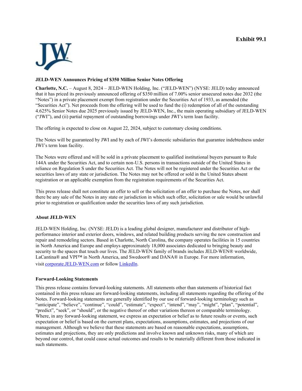 Exhibit 99.1 JELD-WEN Announces Pricing of $350 Million Senior Notes Offering Charlotte, N.C. – August 8, 2024 – JELD-WEN Holding, Inc. (“JELD-WEN”) (NYSE: JELD) today announced that it has priced its previously announced offering of $350 million of 7.00% senior unsecured notes due 2032 (the “Notes”) in a private placement exempt from registration under the Securities Act of 1933, as amended (the “Securities Act”). Net proceeds from the offering will be used to fund the (i) redemption of all of the outstanding 4.625% Senior Notes due 2025 previously issued by JELD-WEN, Inc., the main operating subsidiary of JELD-WEN (“JWI”), and (ii) partial repayment of outstanding borrowings under JWI’s term loan facility. The offering is expected to close on August 22, 2024, subject to customary closing conditions. The Notes will be guaranteed by JWI and by each of JWI’s domestic subsidiaries that guarantee indebtedness under JWI’s term loan facility. The Notes were offered and will be sold in a private placement to qualified institutional buyers pursuant to Rule 144A under the Securities Act, and to certain non-U.S. persons in transactions outside of the United States in reliance on Regulation S under the Securities Act. The Notes will not be registered under the Securities Act or the securities laws of any state or jurisdiction. The Notes may not be offered or sold in the United States absent registration or an applicable exemption from the registration requirements of the Securities Act. This press release shall not constitute an offer to sell or the solicitation of an offer to purchase the Notes, nor shall there be any sale of the Notes in any state or jurisdiction in which such offer, solicitation or sale would be unlawful prior to registration or qualification under the securities laws of any such jurisdiction. About JELD-WEN JELD-WEN Holding, Inc. (NYSE: JELD) is a leading global designer, manufacturer and distributor of high- performance interior and exterior doors, windows, and related building products serving the new construction and repair and remodeling sectors. Based in Charlotte, North Carolina, the company operates facilities in 15 countries in North America and Europe and employs approximately 18,000 associates dedicated to bringing beauty and security to the spaces that touch our lives. The JELD-WEN family of brands includes JELD-WEN® worldwide, LaCantina® and VPI™ in North America, and Swedoor® and DANA® in Europe. For more information, visit corporate.JELD-WEN.com or follow LinkedIn. Forward-Looking Statements This press release contains forward-looking statements. All statements other than statements of historical fact contained in this press release are forward-looking statements, including all statements regarding the offering of the Notes. Forward-looking statements are generally identified by our use of forward-looking terminology such as “anticipate”, “believe”, “continue”, “could”, “estimate”, “expect”, “intend”, “may”, “might”, “plan”, “potential”, “predict”, “seek”, or “should”, or the negative thereof or other variations thereon or comparable terminology. Where, in any forward-looking statement, we express an expectation or belief as to future results or events, such expectation or belief is based on the current plans, expectations, assumptions, estimates, and projections of our management. Although we believe that these statements are based on reasonable expectations, assumptions, estimates and projections, they are only predictions and involve known and unknown risks, many of which are beyond our control, that could cause actual outcomes and results to be materially different from those indicated in such statements.
