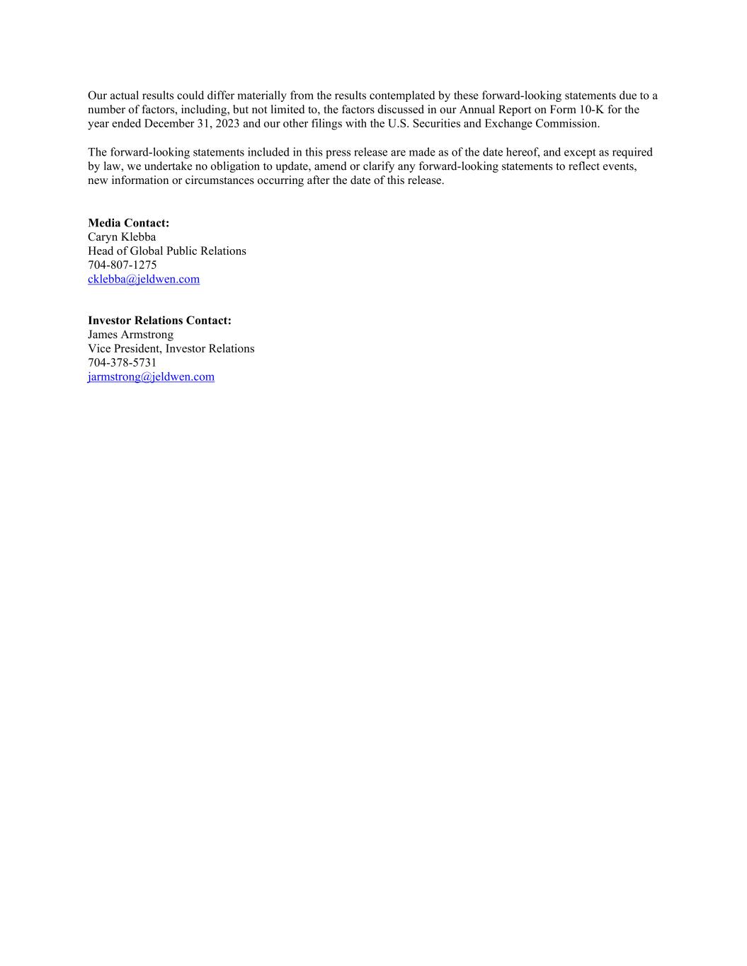 Our actual results could differ materially from the results contemplated by these forward-looking statements due to a number of factors, including, but not limited to, the factors discussed in our Annual Report on Form 10-K for the year ended December 31, 2023 and our other filings with the U.S. Securities and Exchange Commission. The forward-looking statements included in this press release are made as of the date hereof, and except as required by law, we undertake no obligation to update, amend or clarify any forward-looking statements to reflect events, new information or circumstances occurring after the date of this release. Media Contact: Caryn Klebba Head of Global Public Relations 704-807-1275 cklebba@jeldwen.com Investor Relations Contact: James Armstrong Vice President, Investor Relations 704-378-5731 jarmstrong@jeldwen.com